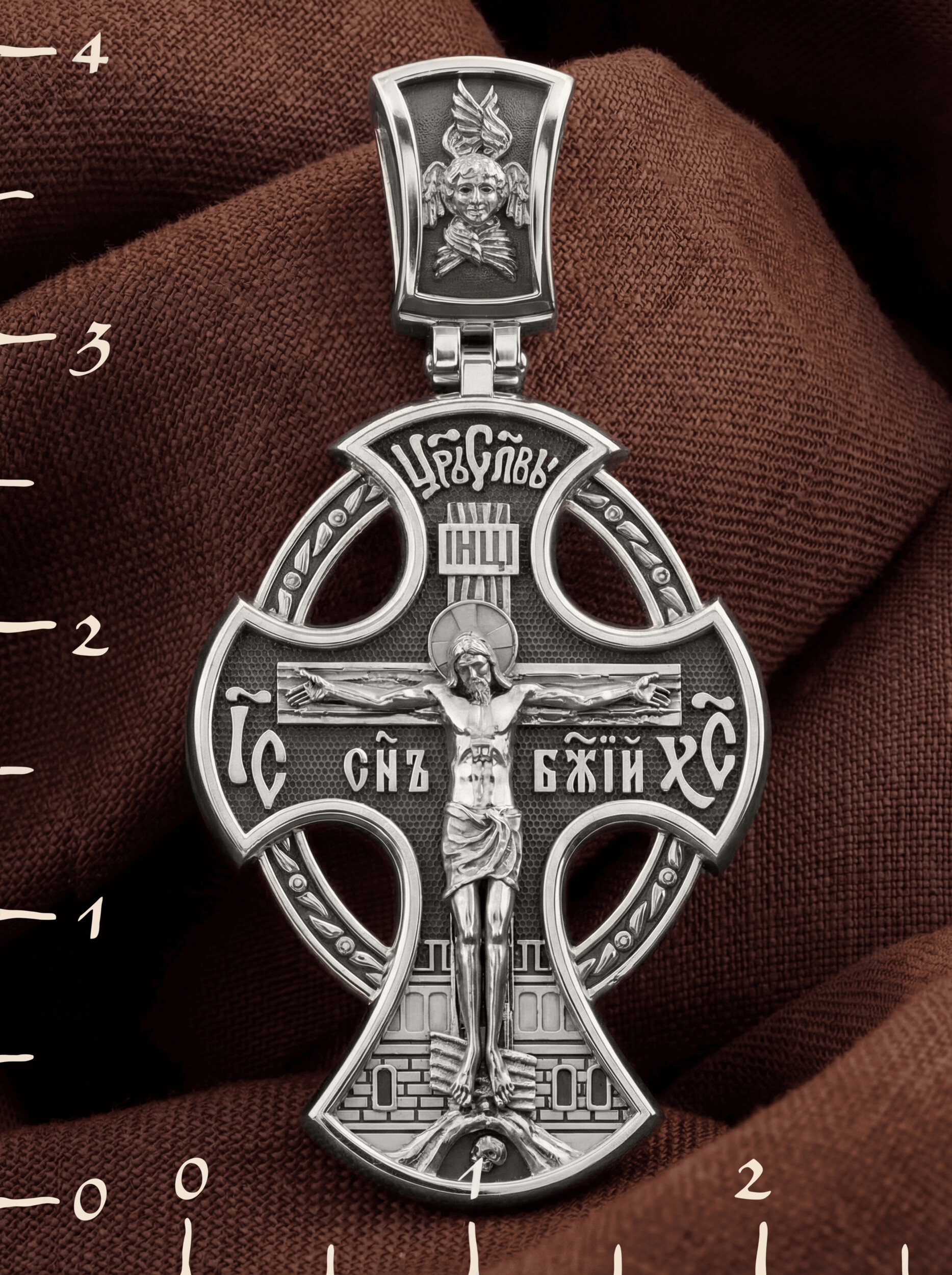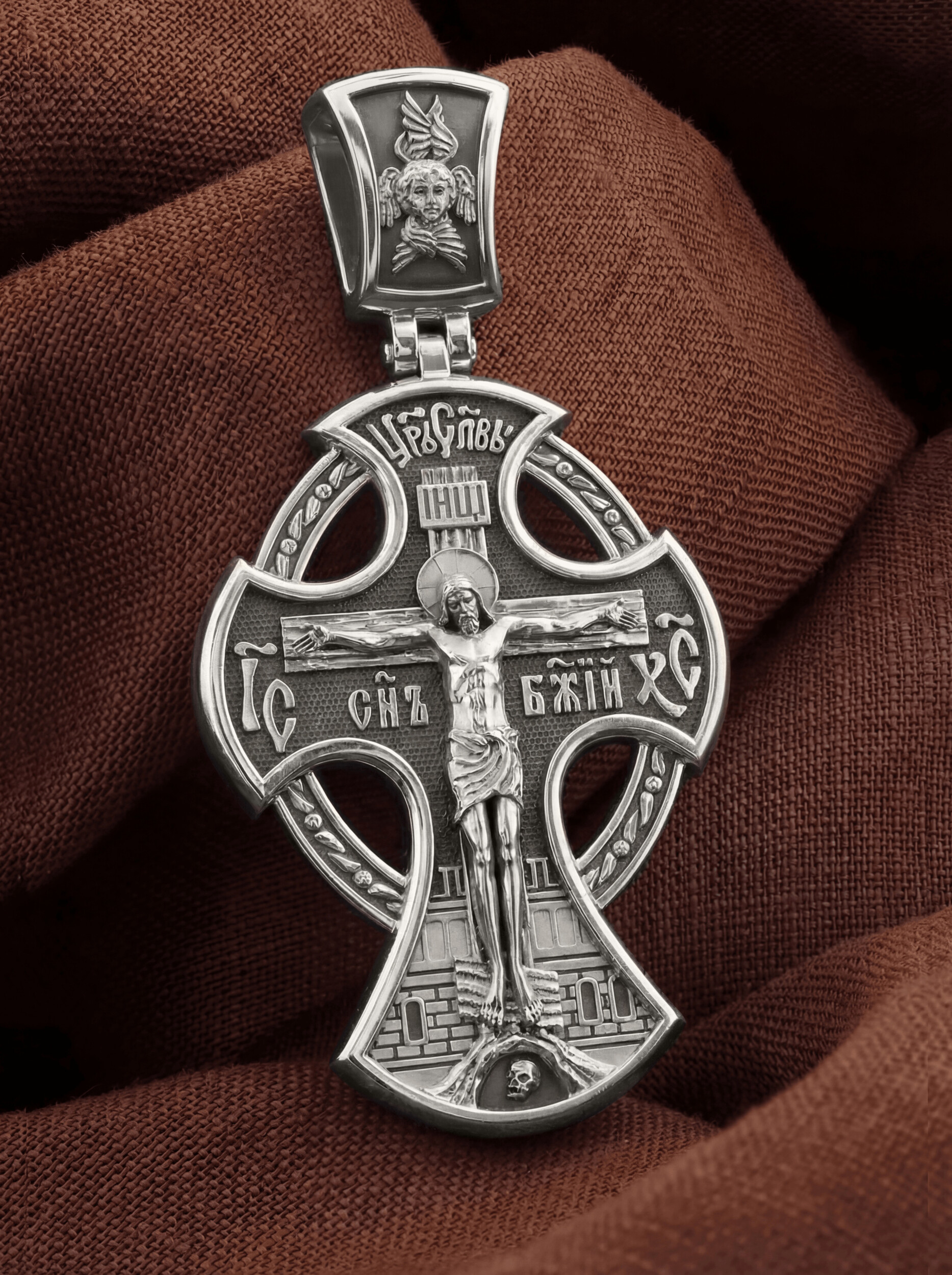 На лицевой стороне креста изображено Распятие Иисуса Христа. Господь представлен свободно покоящимся на кресте с простертыми руками и как бы обнимающим всю Вселенную. Он — Спаситель, искупивший грехи мира, «поправший смертию смерть» и призывающий к Себе «все концы земли». Поэтому рядом с Его образом помещены слова «Царь Славы». Эти слова характеризуют Господа как Великого Архиерея, победителя смерти. Верхняя перекладина символизирует титло — табличку, на которой, согласно Евангелию, было начертано: Иисус Назорей Царь Иудейский (IНЦI). Также Распятие сопровождается надписями, олицетворяющими Христа. Это святое имя Христа «IC» (Иисус) «ХС» (Христос), и словосочетание «Сын Божий». Крест стоит на горе камней, символизирующих Голгофу, в основании которой различается череп. Это голова Адама. На кулонном кольце помещено изображение серафима.