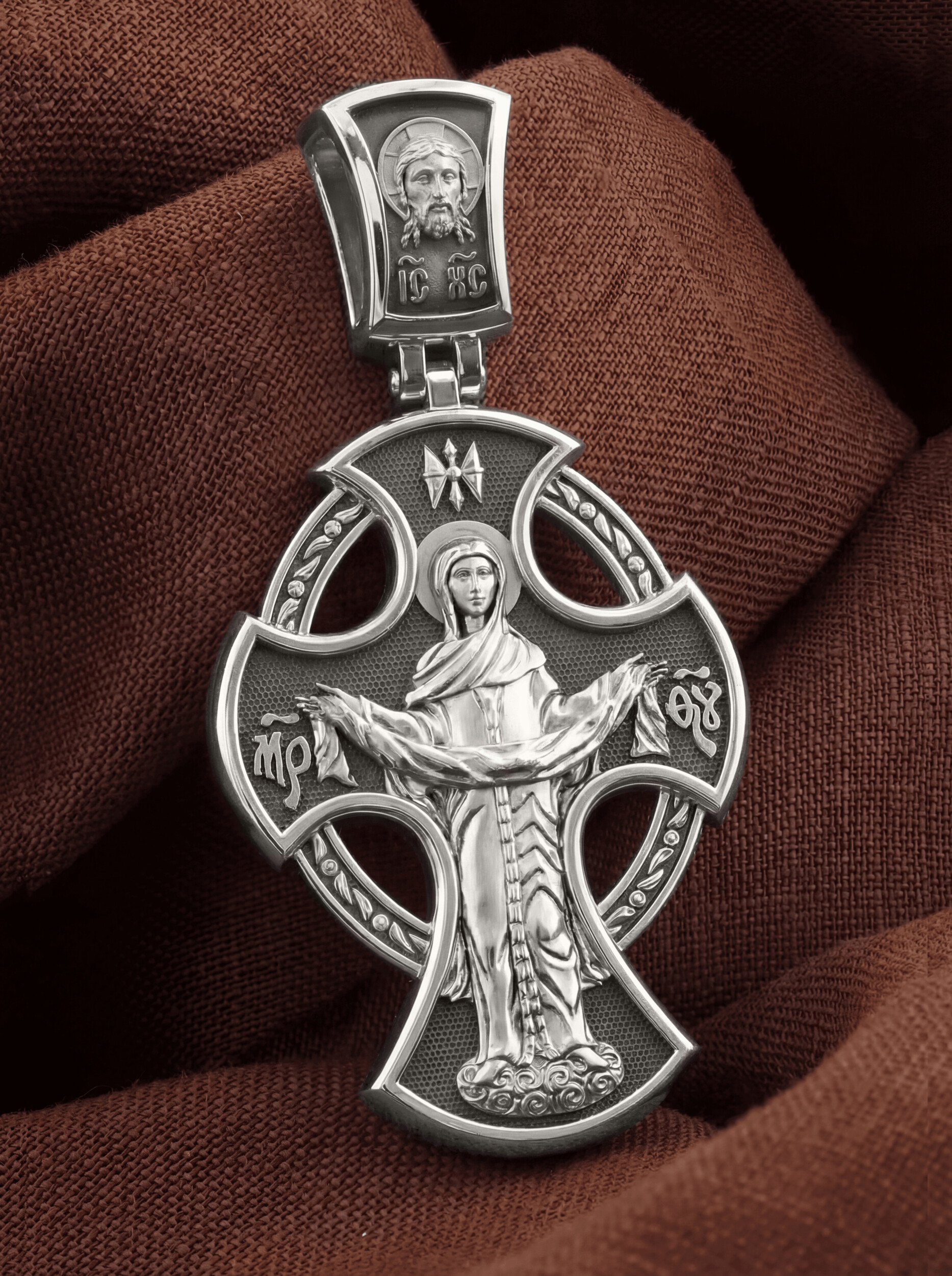 На обороте креста изображена икона Покрова Пресвятой Богородицы. Праздник Покрова Божией Матери является воспоминанием чуда, которое произошло во Влахнернской церкви 1 (14) октября 910 года: Пресвятая Богородица явилась верующим над алтарем храма и распростерла над ними Свое покрывало. В этот день Божья Матерь открыла людям, что Она является Ходатаицей за них перед Богом. Богородица простирает Свой молитвенный покров над всеми православными христианами и умоляет Сына Своего о даровании вечного спасения каждому человеку. На кулонном кольце помещено изображение Спаса Нерукотворного — образ Спасителя, который Он запечатлел на плате и передал для исцеления больному проказой царю Эдессы. Ему придается победное и защитное значение.