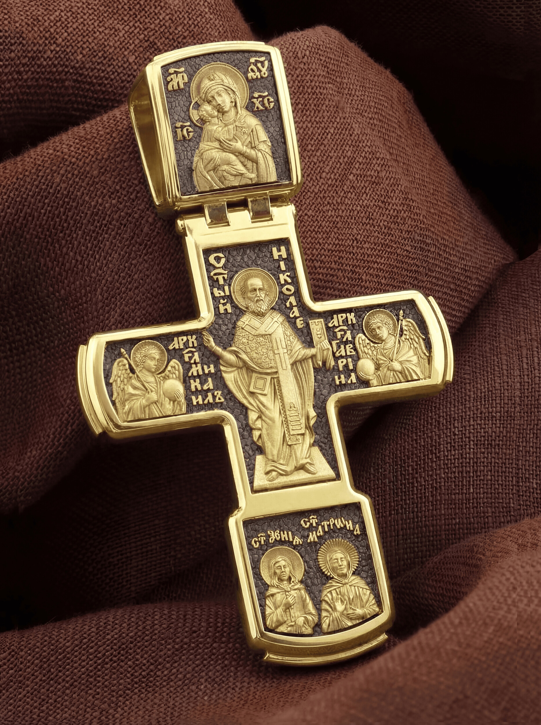 В центре на обороте — самый почитаемый в Православной Церкви святой, Николай Чудотворец, которого еще называют Николай Угодник за то, что он угодил своей жизнью Богу. Ему молятся, отправляясь в путешествие, особенно по морю, просят исцеления в различных недугах, помощи в торговых делах, учебе и поисках достойного супруга. С двух сторон от Николая Чудотворца помещены образы архангелов Михаила и Гавриила. Вверху — Владимирская икона Божией Матери — самая великая русская святыня, многие века бывшая олицетворением нашей земли. Перед ней венчались на царство государи, избирались патриархи. Пречистой Богородице Владимирской клялись в верности Отечеству солдаты и за нее умирали на поле брани. Именно на ее защиту более всего уповала Россия в самые страшные периоды своей истории. В нижнем клейме — иконы двух святых помощниц от всех недугов, блаженных Ксении Петербургской и Матроны Московской.