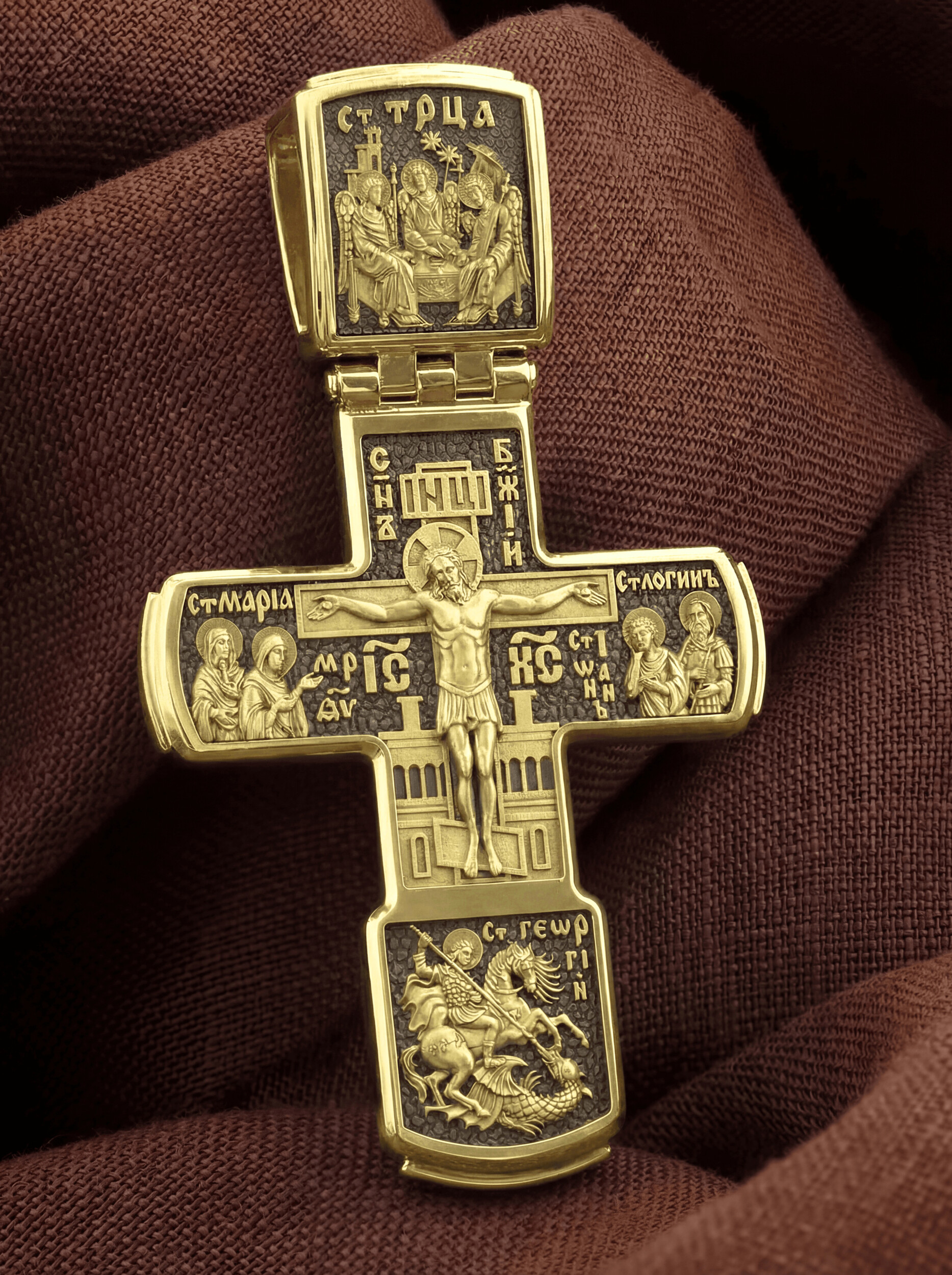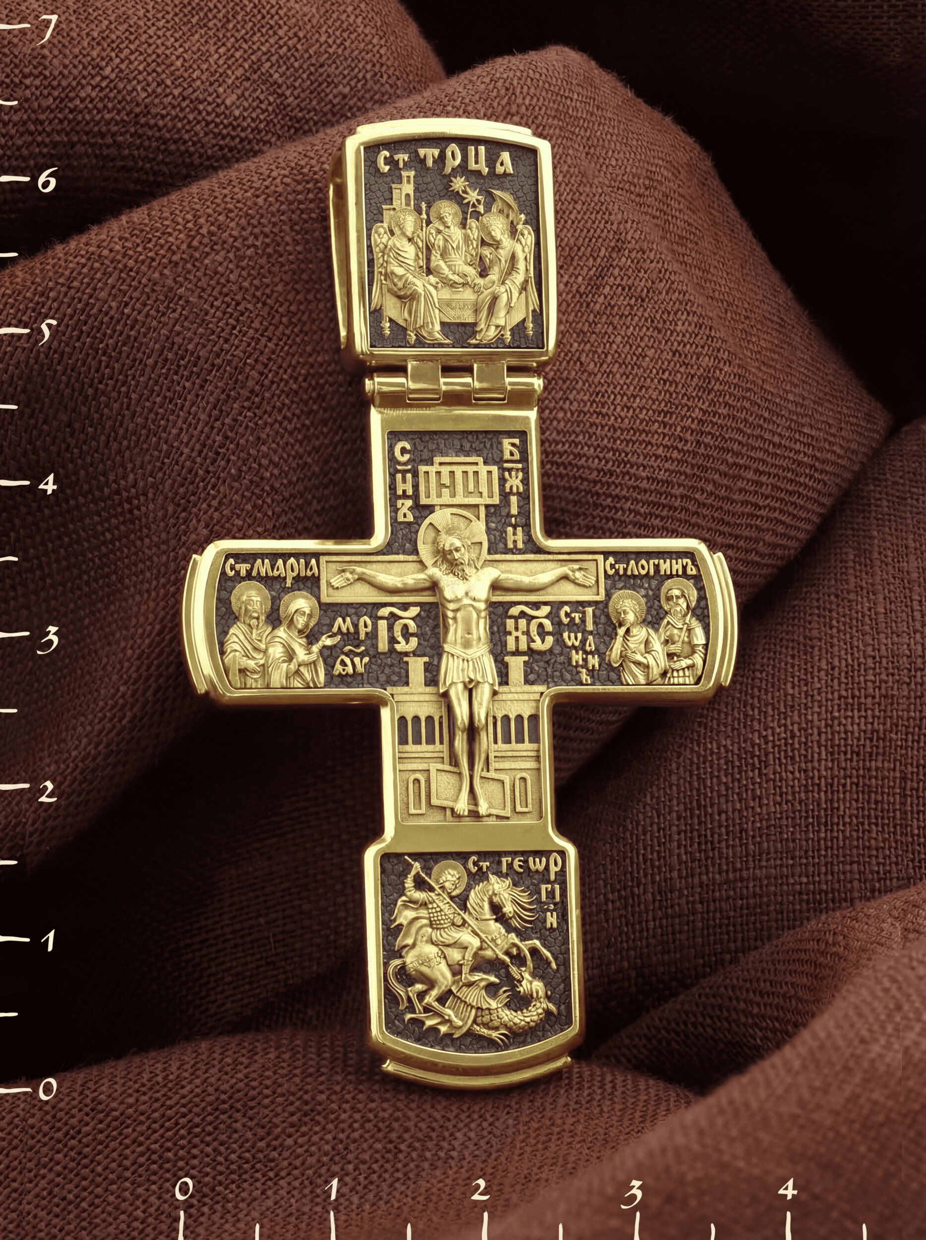 На кресте изображено Распятие Господа нашего Иисуса Христа. Ему предстоят Святая Мария Магдалина, Пресвятая Богородица, апостол Иоанн и Святой Иосиф, свидетели крестных страданий Господа. Вверху — икона Святой Троицы, на которой запечатлено явление Триединого Бога праотцу Аврааму в виде трех ангелов. В нижнем клейме изображено Чудо Святого Георгия о змие. Великомученик Георгий почитается как покровитель воинов, защитник от злых сил, помощник в духовной борьбе.