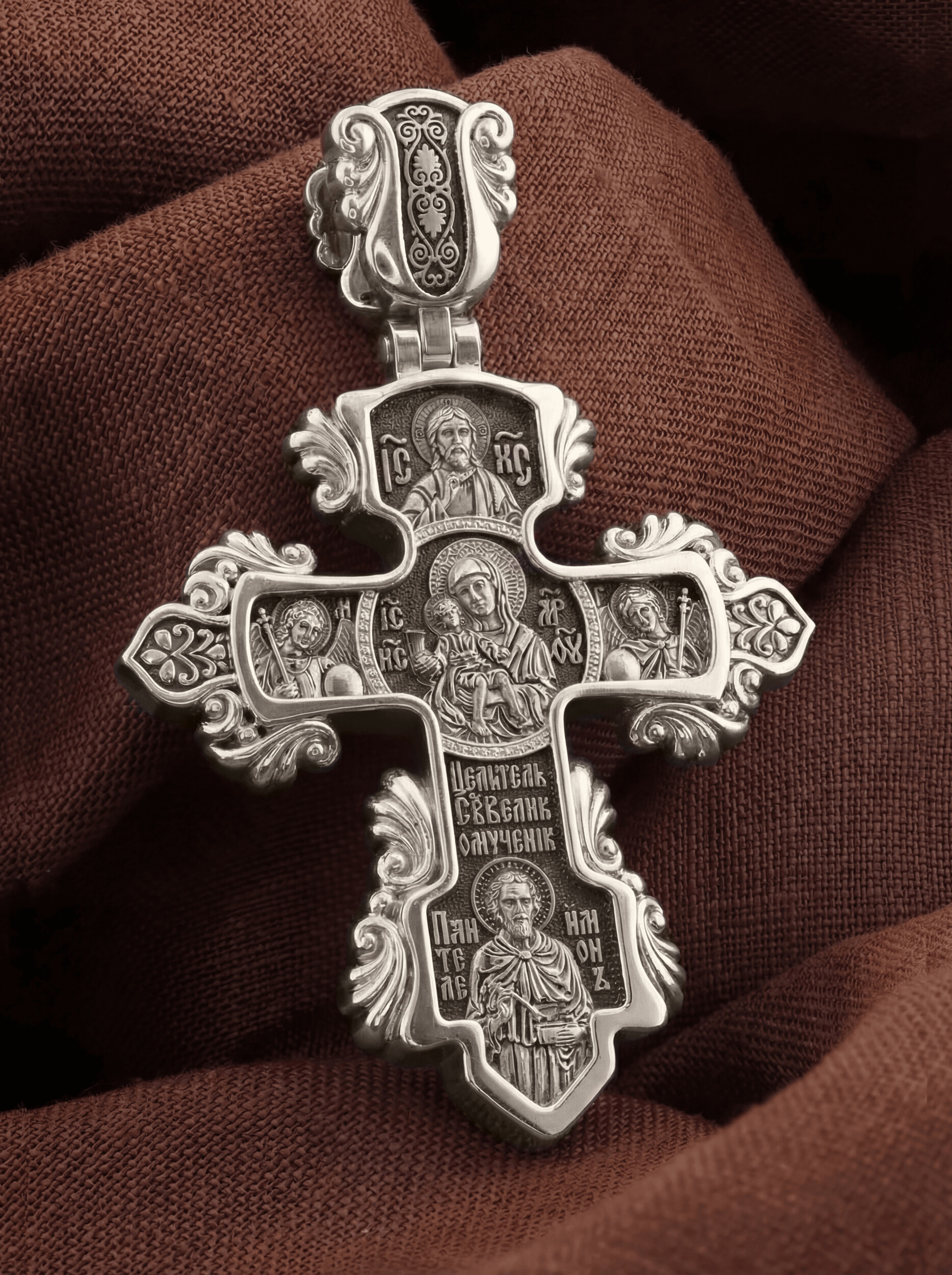 На лицевой стороне креста изображено Распятие Господа и Спасителя нашего Иисуса Христа, отдавшего Себя на смерть, для искупления грехов мира. Крест является символом жертвенной любви всеблагого Бога к падшим людям, всепобеждающим духовным оружием христиан, основанием и средоточием церковной жизни. На верхней табличке, выше головы Иисуса, расположена надпись, составленная Понтием Пилатом — «ИНЦИ». Она означает «Иисус Назорей, Царь Иудейский». Надпись «IС ХС» означает Иисус Христос помещается на разных сторонах поперечной перекладины креста. Крест стоит на горе камней, символизирующих Голгофу. В ее основании различается череп — это голова Адама. Над Распятием надпись — Царь Славы.