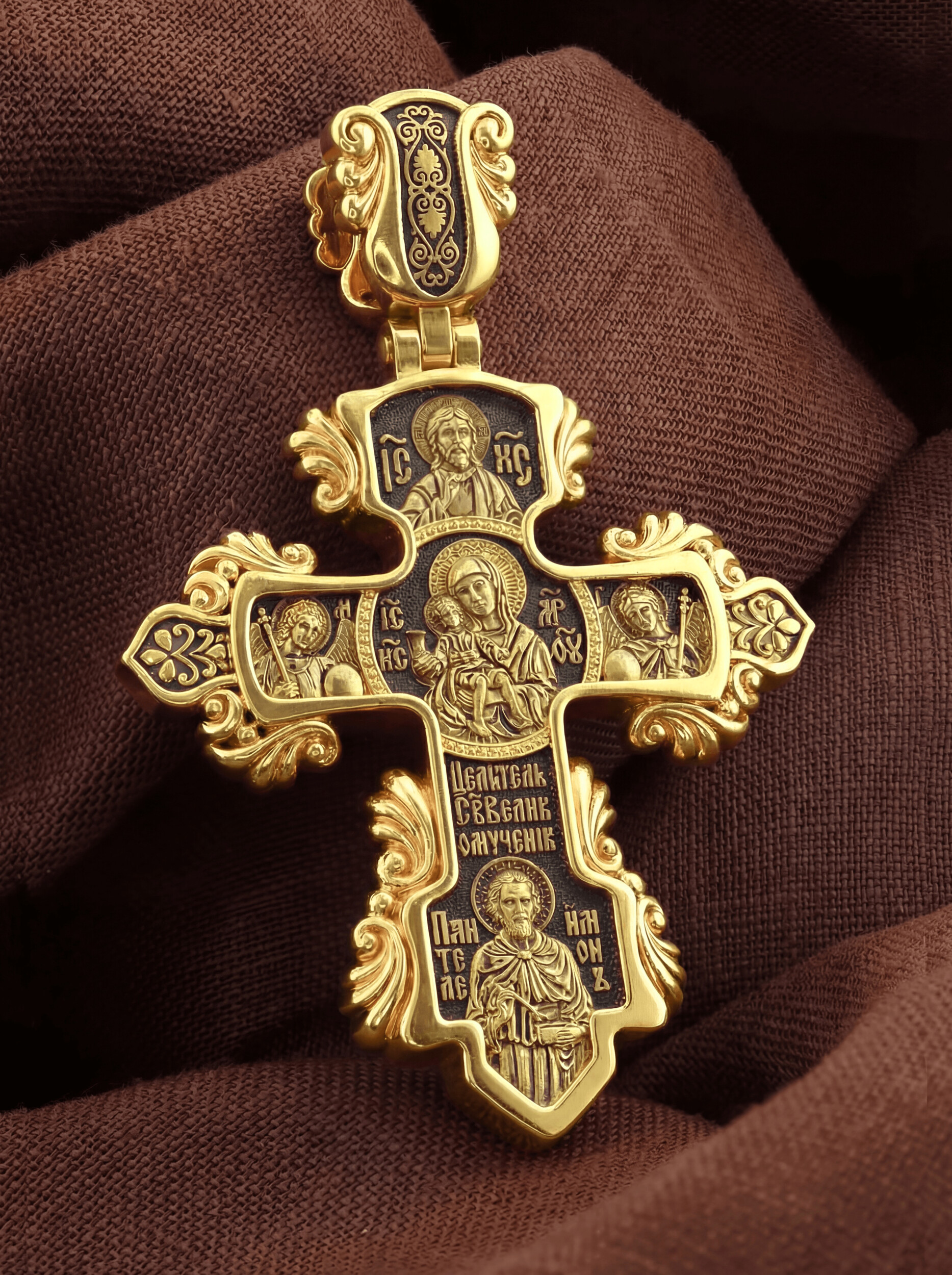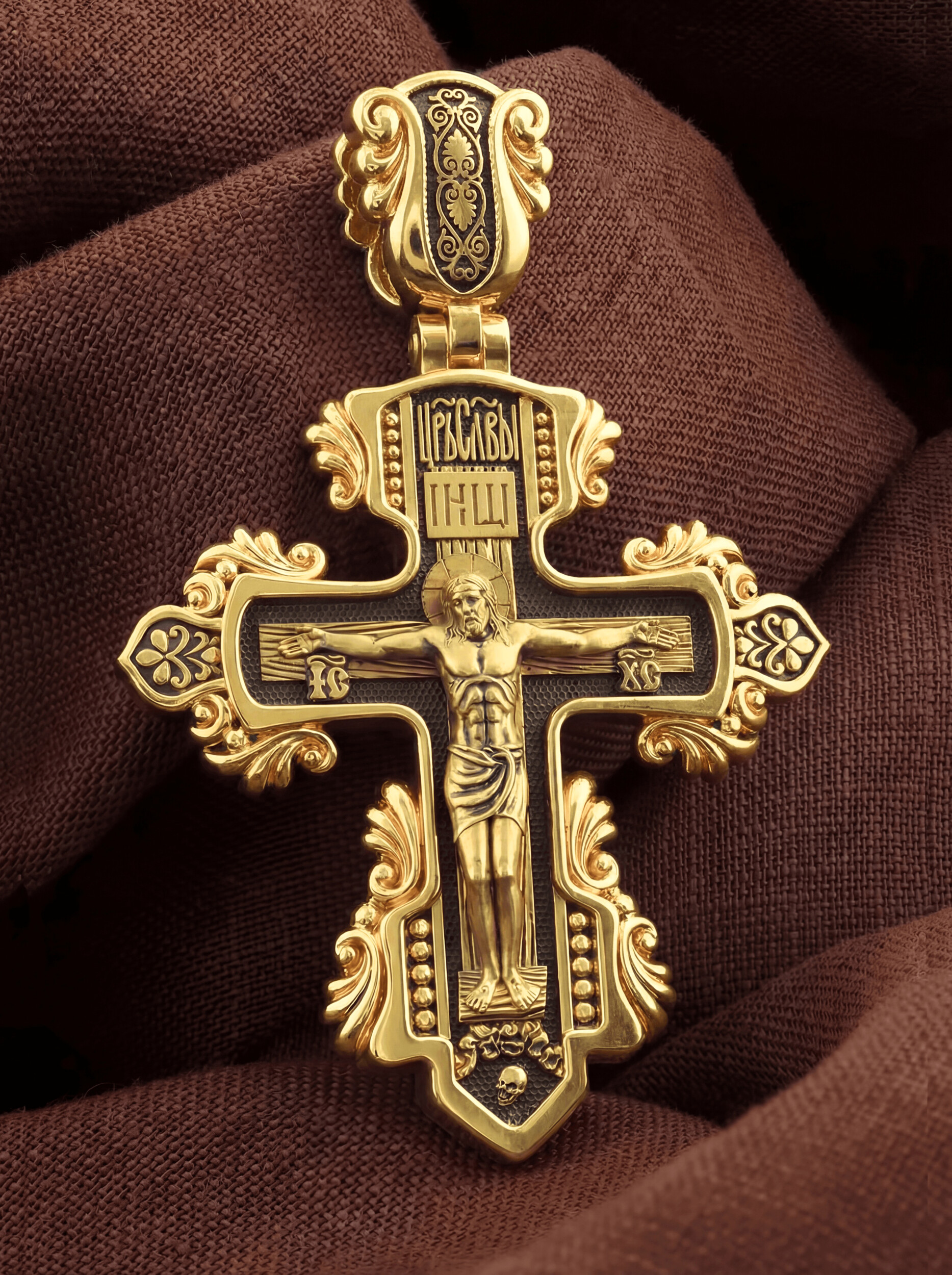На лицевой стороне креста изображено Распятие Господа и Спасителя нашего Иисуса Христа, отдавшего Себя на смерть, для искупления грехов мира. Крест является символом жертвенной любви всеблагого Бога к падшим людям, всепобеждающим духовным оружием христиан, основанием и средоточием церковной жизни. На верхней табличке, выше головы Иисуса, расположена надпись, составленная Понтием Пилатом — «ИНЦИ». Она означает «Иисус Назорей, Царь Иудейский». Надпись «IС ХС» означает Иисус Христос помещается на разных сторонах поперечной перекладины креста. Крест стоит на горе камней, символизирующих Голгофу. В ее основании различается череп — это голова Адама. Над Распятием надпись — Царь Славы.