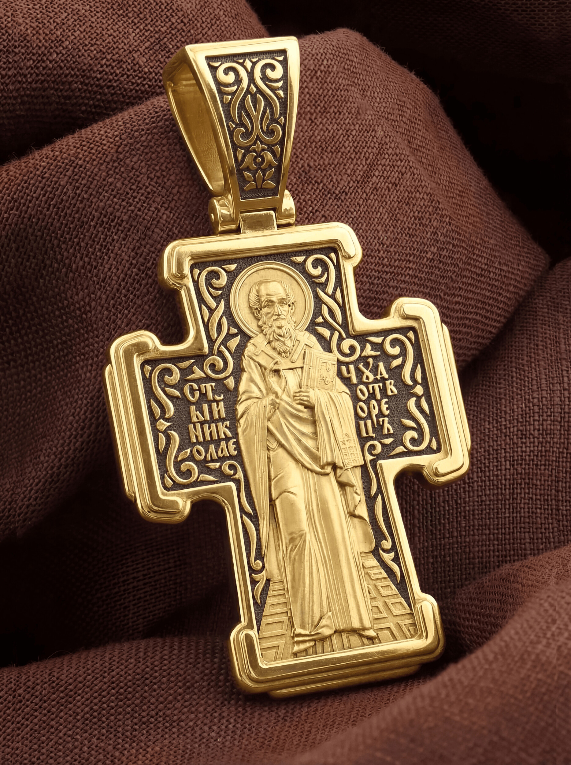 На оборотной стороне креста изображен Святитель Николай архиепископ Мир Ликийских, Чудотворец. Он является одним из самых почитаемых святых в православном мире. Святитель Николай родился во второй половине III века в Малой Азии в Ликийском городе Патары. С рождения Божий Угодник проявлял необыкновенные дарования. Сохранилось Предание, что во время крещения он, никем не поддерживаемый, простоял в купели три часа. Вся жизнь святого Николая — это служение Богу. Много великих и преславных чудес сотворил на земле и на море великий Святитель Николай Угодник. Он помогал сущим в бедах, укрощал штормы, спасал от потопления и выносил на сушу из глубины морской, освобождал из плена и приносил освобожденных домой, избавлял от уз и темницы, защищал от посечения мечом, освобождал от смерти и подавал многим различные исцеления, слепым прозрение, хромым хождение, глухим слух, немым дар слова.