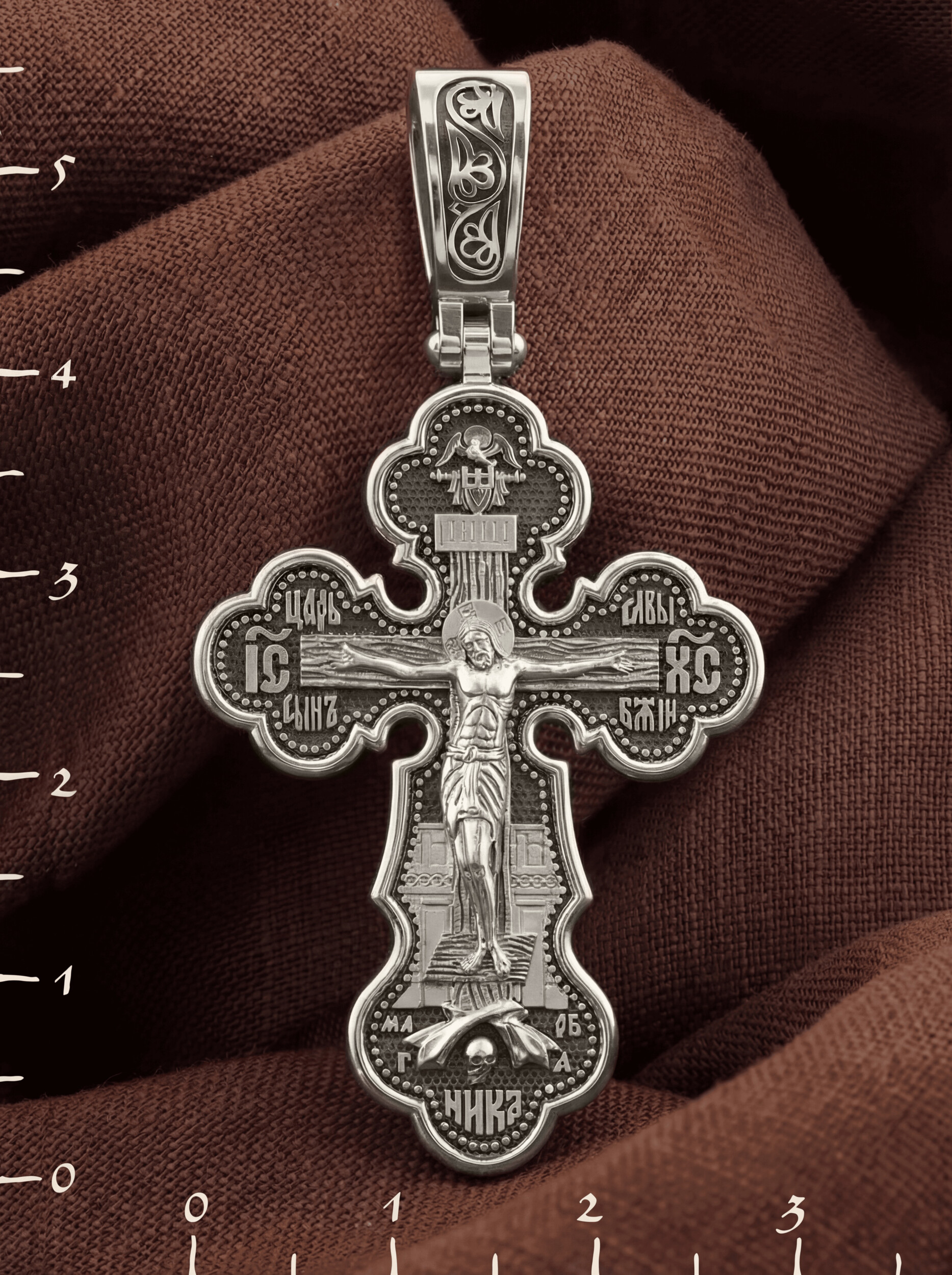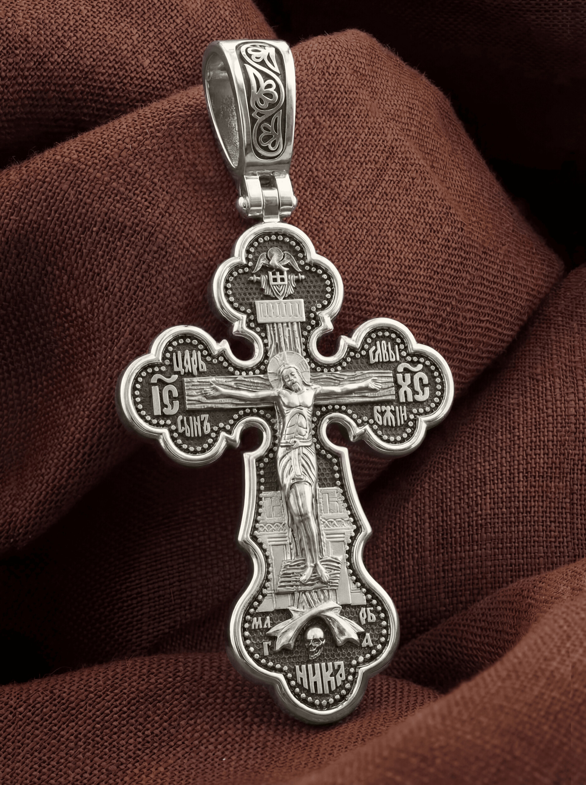 На лицевой стороне креста изображено Распятие Господа и Спасителя нашего Иисуса Христа. Христос, подвергнутый на кресте мучительной казни, своими страданиями искупил нас от древнего греха и даровал нам жизнь вечную. На верхней табличке, выше головы Иисуса, расположена надпись, составленная Понтием Пилатом — «IНЦI». Она означает «Иисус Назорей, Царь Иудейский». Распятие сопровождается каноническими надписями. Надпись «IС ХС» означает Иисус Христос, надпись «Царь Славы» и словосочетание «СЫН БОЖИЙ», что означает божественную природу Иисуса Христа, помещаются на разных сторонах поперечной перекладины креста. В нижней части креста находятся надписи –«НИКА» и «МЛРБ». В переводе с греческого, слово «НИКА» означает «победитель». Именно оно является символом победы Христа над смертью. Надпись «МЛРБ» — «место лобное рай бысть» означает, что место лобное стало раем. Крест стоит на горе камней, символизирующих Голгофу. Под подножием Креста изображена покоящаяся голова (череп) Адама и надпись «Г.А.». Христос в Своей Божественной любви, над которой смерть не властна и которая, страдая, и не страдает в обычном смысле, простирает к людям со Креста Свои объятия, в которые призывается и привлекается весь мир. Поэтому Тело Его не висит, а торжественно покоится на Кресте.
