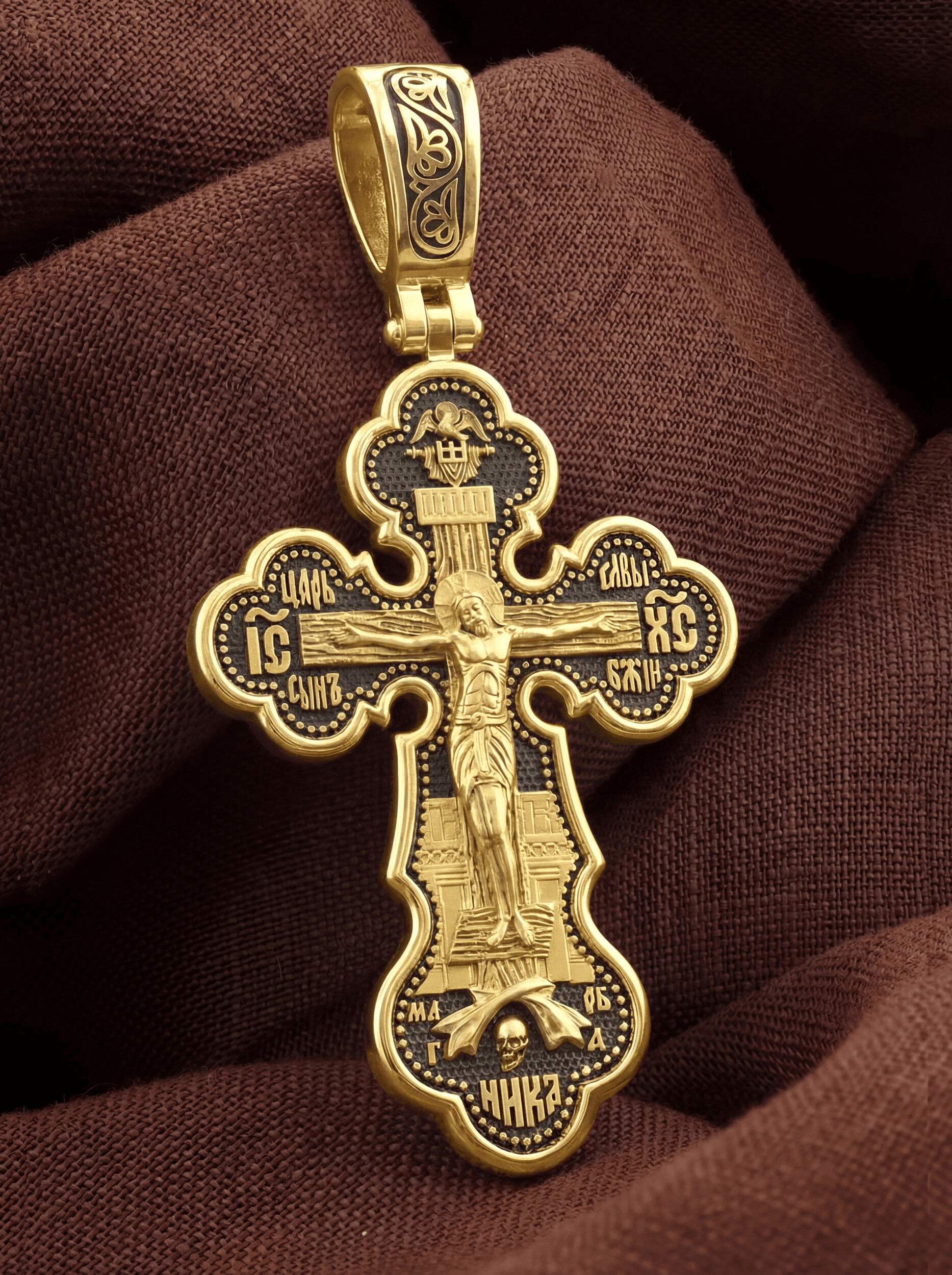 На лицевой стороне креста изображено Распятие Господа и Спасителя нашего Иисуса Христа. Христос, подвергнутый на кресте мучительной казни, своими страданиями искупил нас от древнего греха и даровал нам жизнь вечную. На верхней табличке, выше головы Иисуса, расположена надпись, составленная Понтием Пилатом — «IНЦI». Она означает «Иисус Назорей, Царь Иудейский». Распятие сопровождается каноническими надписями. Надпись «IС ХС» означает Иисус Христос, надпись «Царь Славы» и словосочетание «СЫН БОЖИЙ», что означает божественную природу Иисуса Христа, помещаются на разных сторонах поперечной перекладины креста. В нижней части креста находятся надписи –«НИКА» и «МЛРБ». В переводе с греческого, слово «НИКА» означает «победитель». Именно оно является символом победы Христа над смертью. Надпись «МЛРБ» — «место лобное рай бысть» означает, что место лобное стало раем. Крест стоит на горе камней, символизирующих Голгофу. Под подножием Креста изображена покоящаяся голова (череп) Адама и надпись «Г.А.». Христос в Своей Божественной любви, над которой смерть не властна и которая, страдая, и не страдает в обычном смысле, простирает к людям со Креста Свои объятия, в которые призывается и привлекается весь мир. Поэтому Тело Его не висит, а торжественно покоится на Кресте.