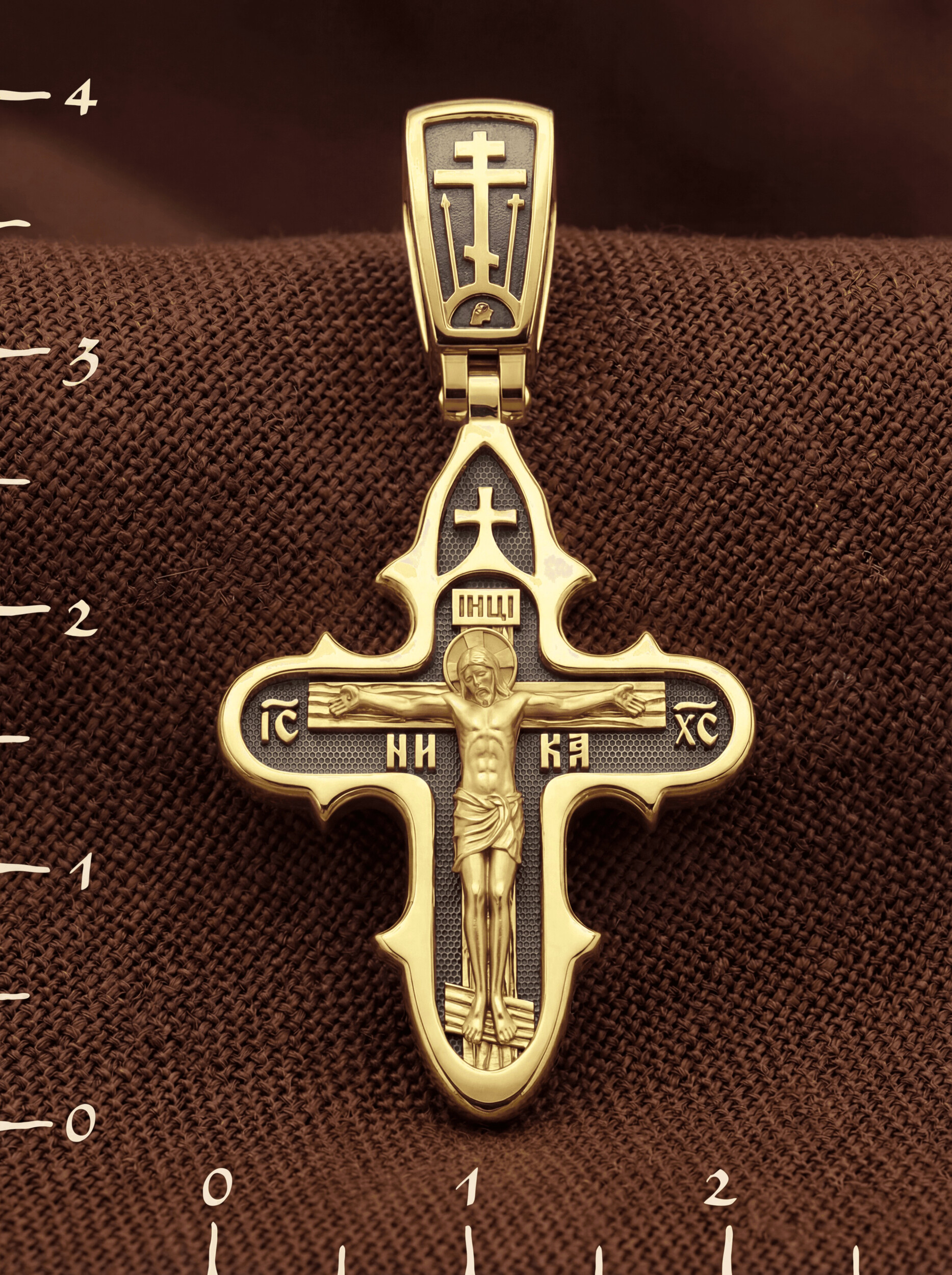 На лицевой стороне нательного креста по традиции изображено Распятие Господа Иисуса Христа. Православная иконография показывает нам распятого Господа не в виде мучительно умирающего человека, а как величественного и всесильного Бога, который простирает руки, словно обнимает весь мир. Человеческие страдания Господа обозначаются только наклоном Его головы и полузакрытыми глазами.
