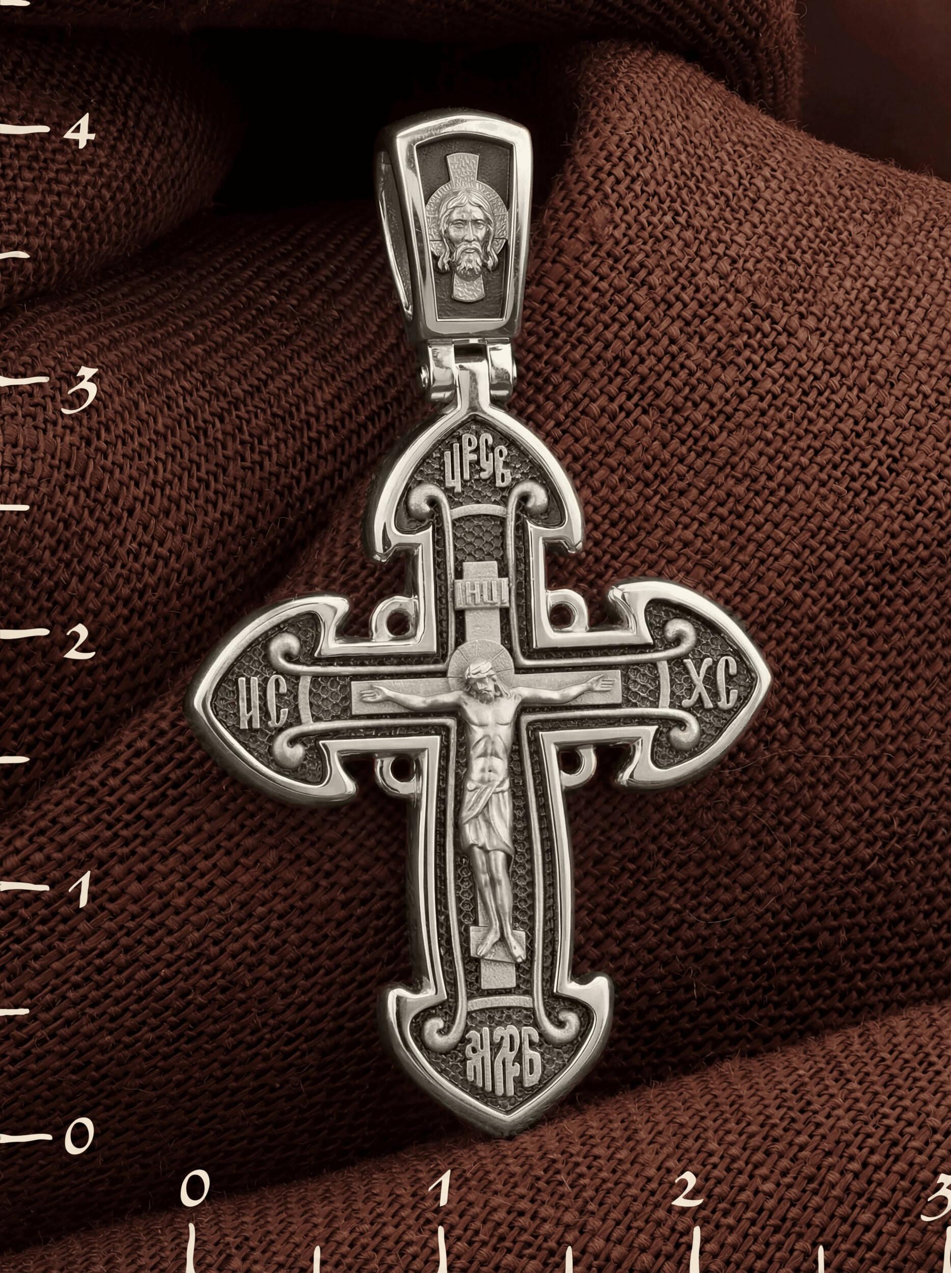 Традиционно на лицевой стороне этого креста изображено Распятие. Это связано с тем, что любой нательный крест в первую очередь символизирует крестные страдания Христа, Его смерть и Воскресение. Поэтому древний вид Распятия являет вознесенного на Крест Сына Божия не просто прибитого к кресту, а словно простирающего руки и призывающего в Свои объятия весь мир. Сохраняя образ страдания Христа, такой вид Распятия в то же время удивительно точно передает его духовный смысл. Христос, распятый и умерший, изображен живым в самой Своей смерти. С двух сторон раскинутых рук Христа написаны инициалы Его имени — «ИС ХС». Сверху над Распятием размещена надпись «Царь Славы», а у подножия Господа видна аббревиатура «МЛ РБ» (Место Лобное Рай Бысть), символизирующая гору Голгофу.