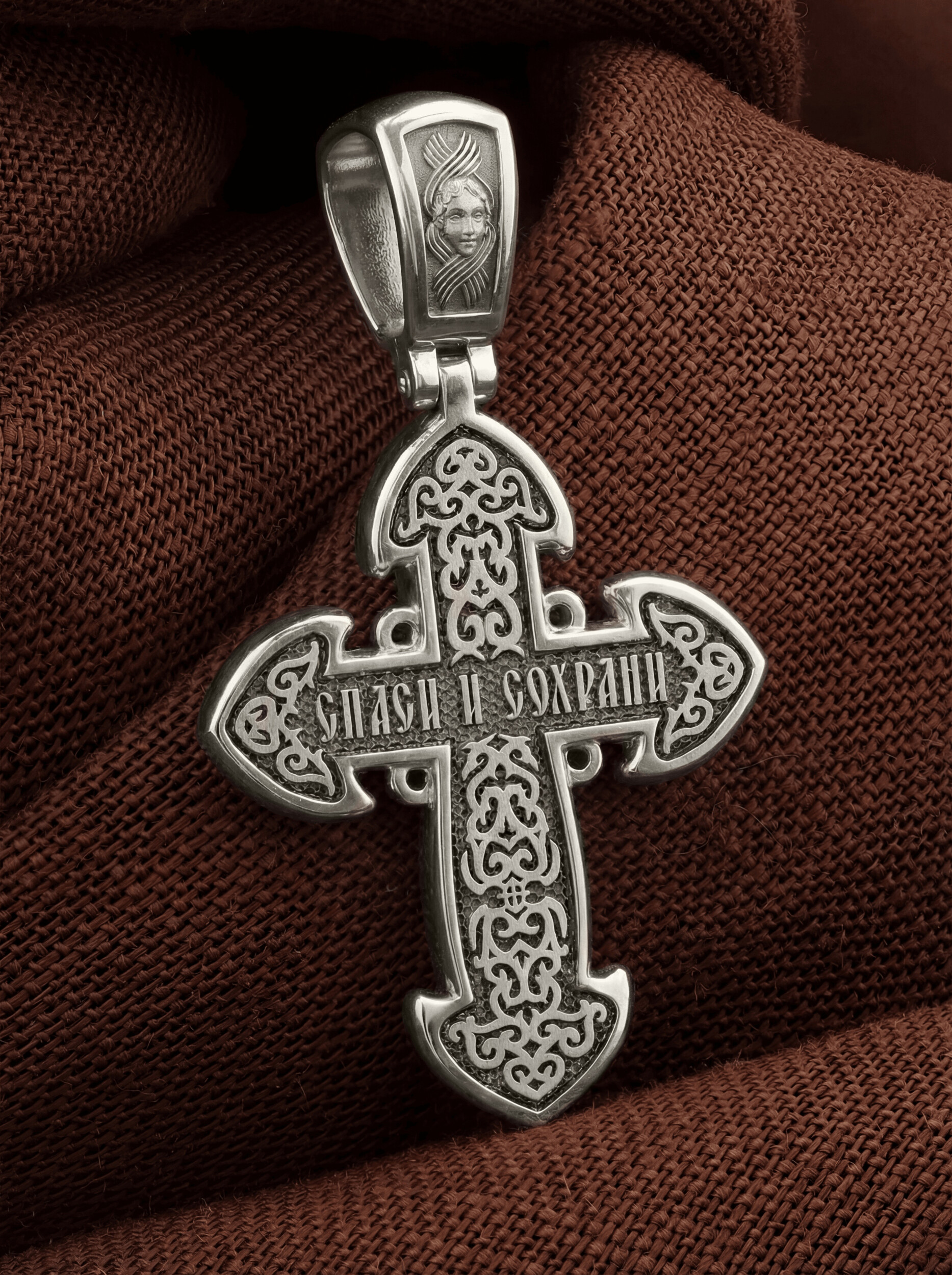Своими страданиями Христос искупил грехи человечества, умерев и сошествовав во ад, победил сатану, освободил души праведников от вечной смерти и открыл им небесные врата рая. Жертва Христа сделала возможным спасение для каждого человека. Поэтому на обороте данного креста в цветочном орнаменте написано: «Спаси и сохрани».