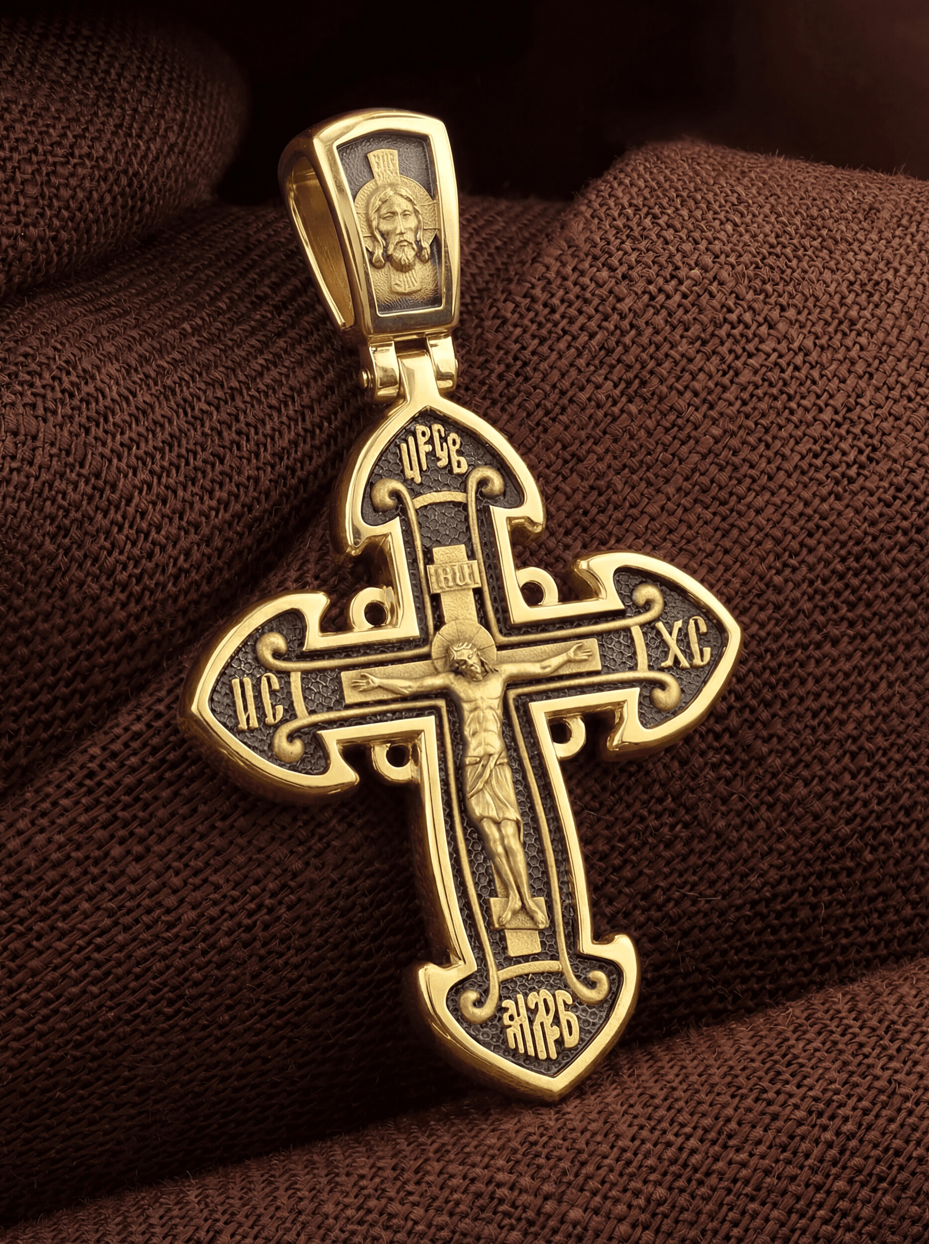 Традиционно на лицевой стороне этого креста изображено Распятие. Это связано с тем, что любой нательный крест в первую очередь символизирует крестные страдания Христа, Его смерть и Воскресение. Поэтому древний вид Распятия являет вознесенного на Крест Сына Божия не просто прибитого к кресту, а словно простирающего руки и призывающего в Свои объятия весь мир. Сохраняя образ страдания Христа, такой вид Распятия в то же время удивительно точно передает его духовный смысл. Христос, распятый и умерший, изображен живым в самой Своей смерти. С двух сторон раскинутых рук Христа написаны инициалы Его имени — «ИС ХС». Сверху над Распятием размещена надпись «Царь Славы», а у подножия Господа видна аббревиатура «МЛ РБ» (Место Лобное Рай Бысть), символизирующая гору Голгофу.