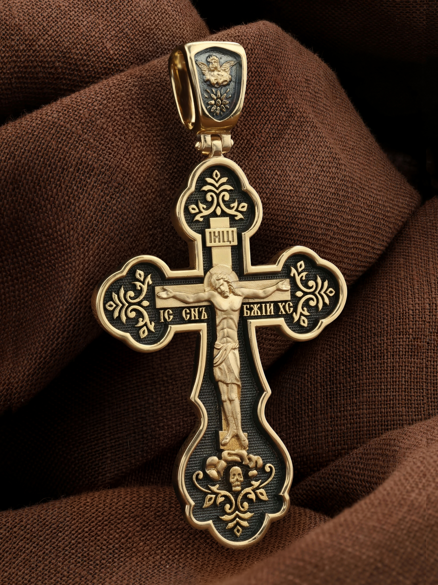Верхняя часть креста, лицевой стороны, область Божественного бытия, как бы отделяется короткой верхней перекладиной. Эта перекладина изображает табличку с надписью в виде аббревиатуры IНЦI — «Иисус Назорей Царь Иудейский», которая, согласно Евангелию, была прибита к кресту после Распятия. Внизу, в земной части креста, под ногами Христа изображается наклоненная перекладина. Это подножие, символизирующее мерило дел человеческих, в чаши которого на Страшном Суде будут полагаться добрые и злые дела людей. Один из распятых с Христом разбойников хулил Господа, и мерило склонилось под тяжестью его грехов, как бы низводя его в ад. Другой же каялся и просил у Господа милости. Ему подножие указывает на Царство Небесное.