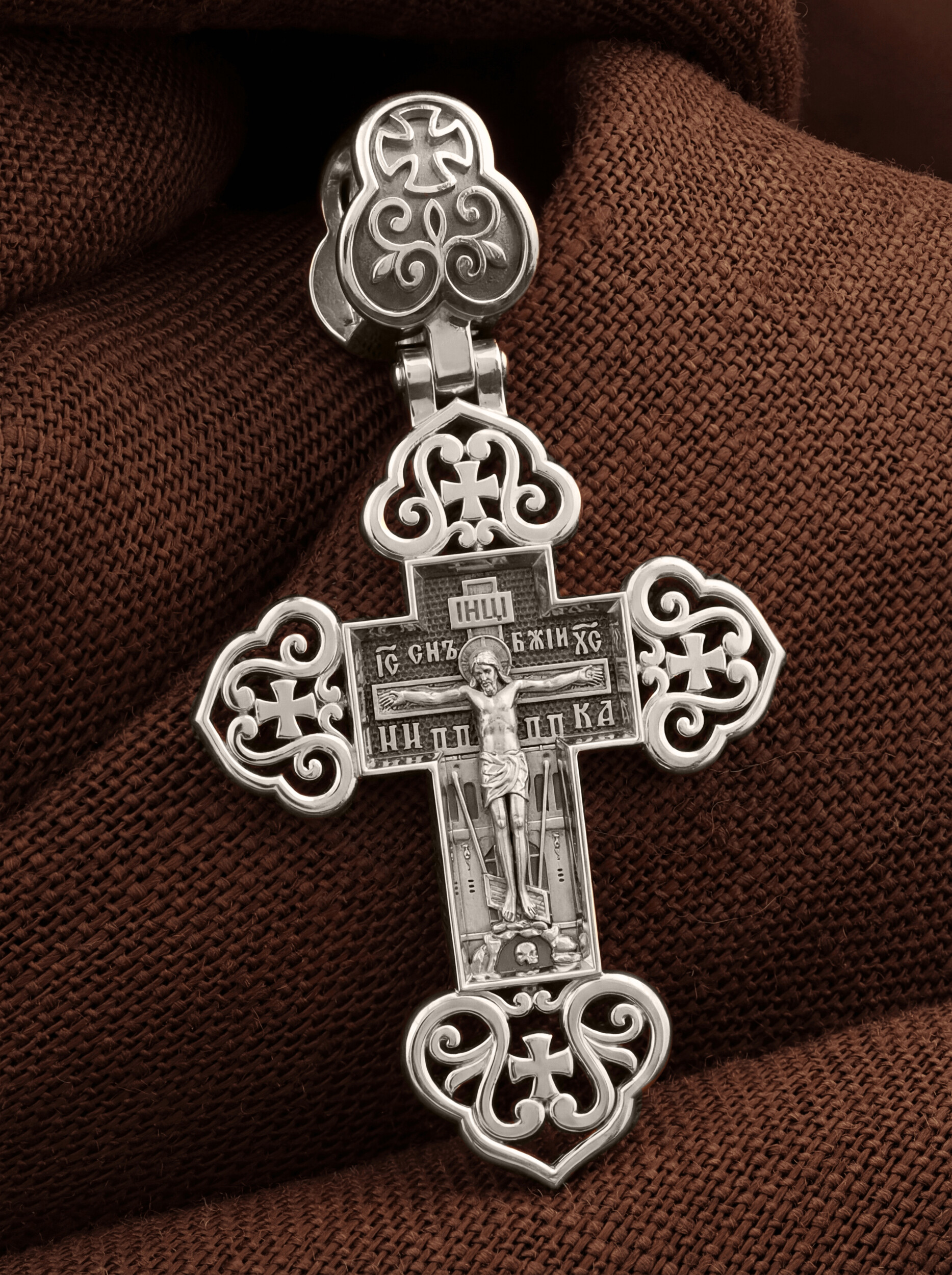 На лицевой стороне изображено Распятие. Над титлом видим слова «ЦРЬ СЛВЫ» — Царь Славы. Верхняя перекладина символизирует собой табличку с надписью «IHЦI» — Иисус Назарянин Царь Иудейский. Над перекладиной пишется сокращенно имя Спасителя «IC XC» — Иисус Христос и словосочетание «СНЪ БЖIЙ» — СЫН БОЖИЙ. Ниже перекладины добавляется «НИКА» (греч. — Победитель). Возвышение, на котором стоит Крест, символизирует гору Голгофу, на которой произошло Распятие. У подножия Креста изображают прах Адама, обозначенный черепом. Рядом с Крестом из горы выступают орудия страданий Господа — трость и копие, обозначенные буквами Т и К.
