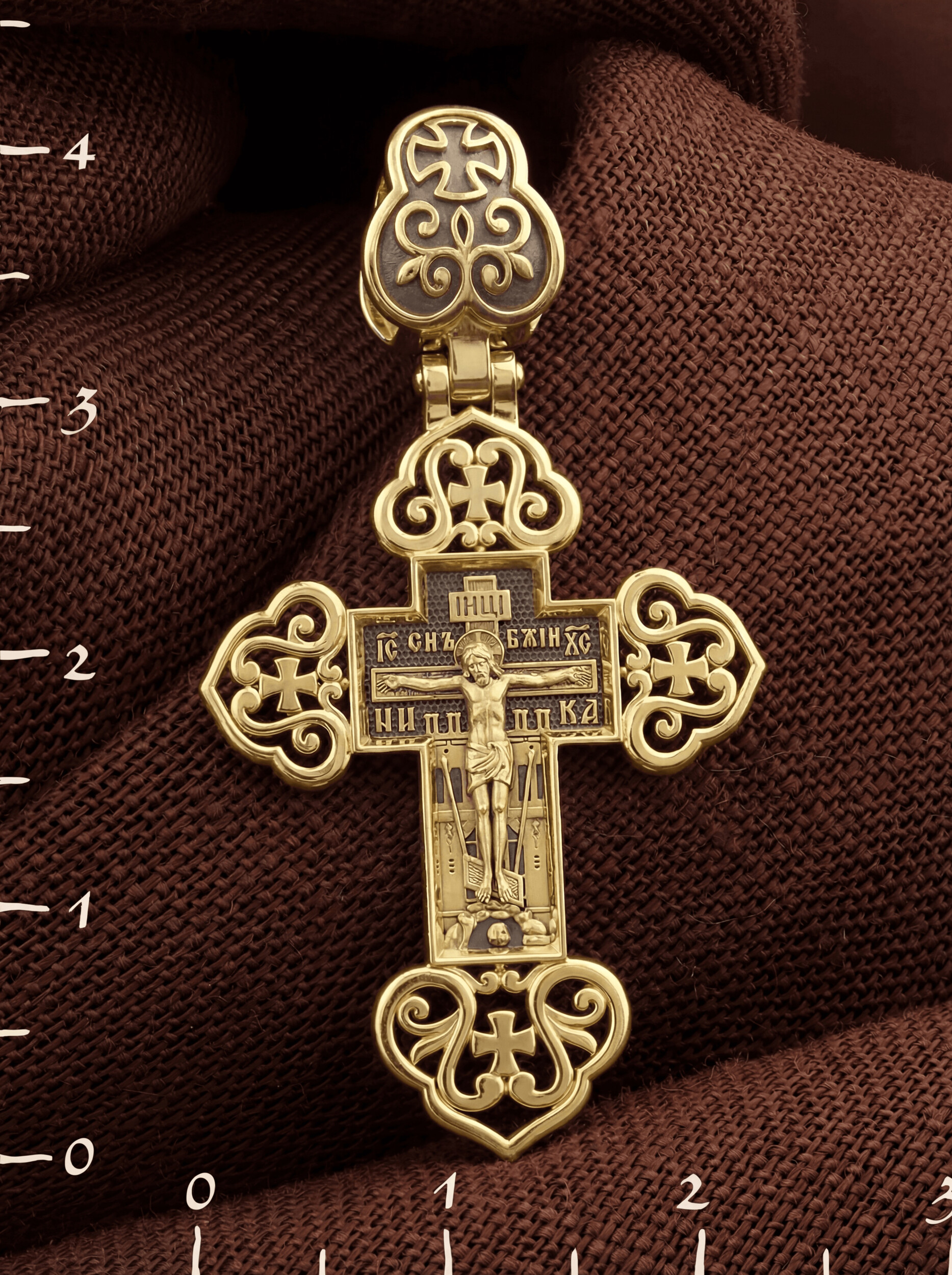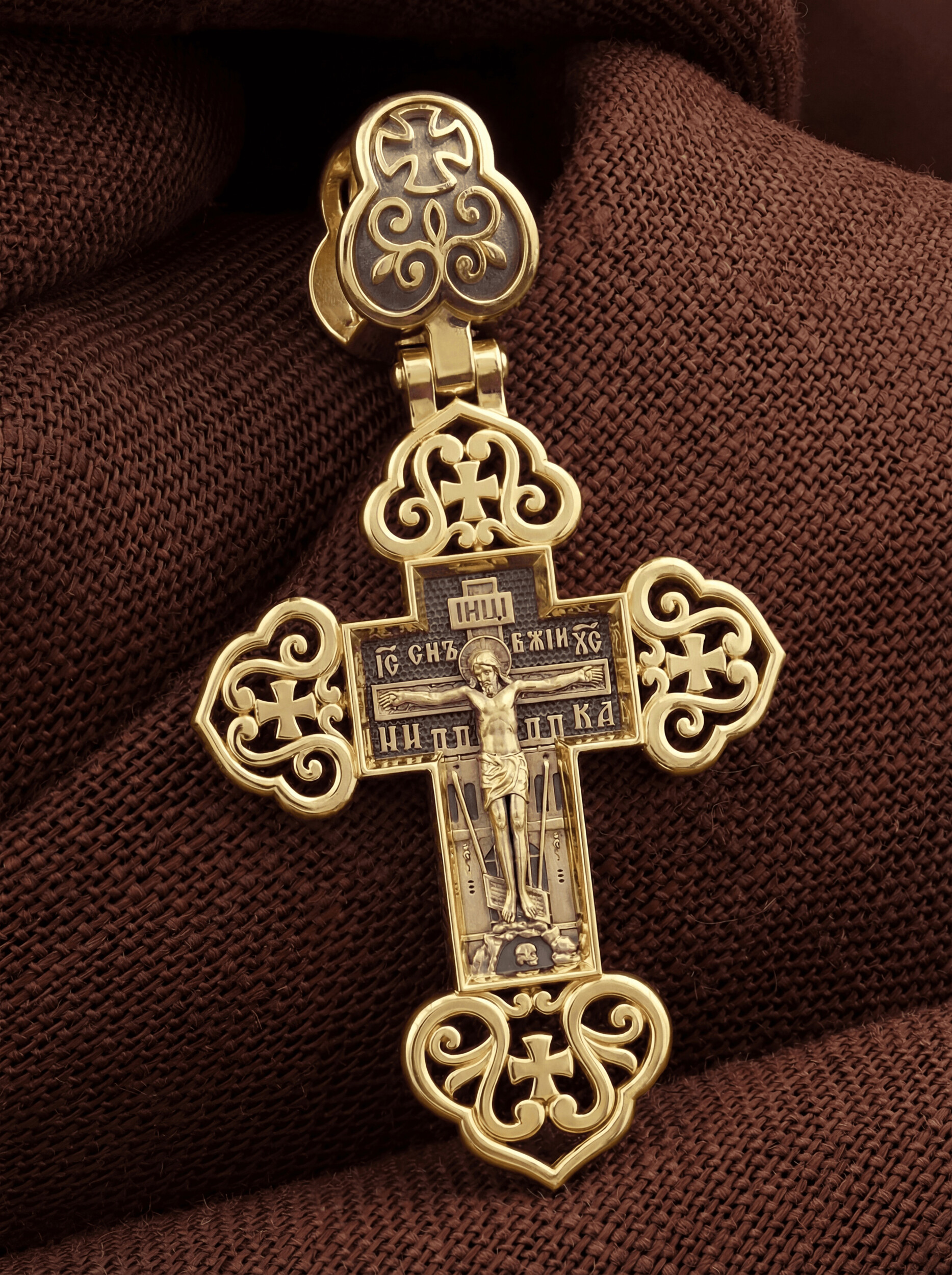 На лицевой стороне изображено Распятие. Над титлом видим слова «ЦРЬ СЛВЫ» — Царь Славы. Верхняя перекладина символизирует собой табличку с надписью «IHЦI» — Иисус Назарянин Царь Иудейский. Над перекладиной пишется сокращенно имя Спасителя «IC XC» — Иисус Христос и словосочетание «СНЪ БЖIЙ» — СЫН БОЖИЙ. Ниже перекладины добавляется «НИКА» (греч. — Победитель). Возвышение, на котором стоит Крест, символизирует гору Голгофу, на которой произошло Распятие. У подножия Креста изображают прах Адама, обозначенный черепом. Рядом с Крестом из горы выступают орудия страданий Господа — трость и копие, обозначенные буквами Т и К.