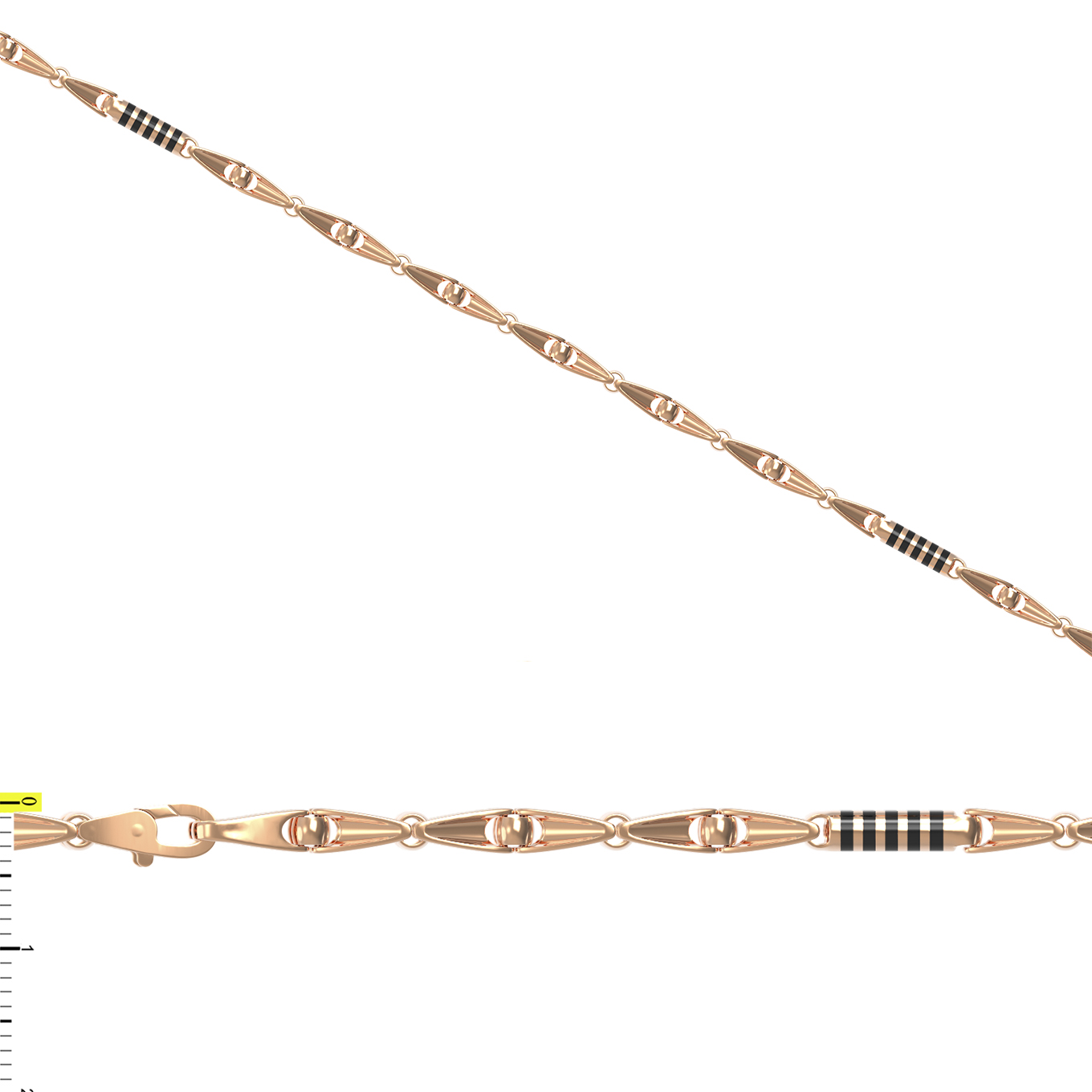 Ключевой особенностью изделия стала выразительная вставка из черной эмали, которая создает стильный контраст с красным золотом. Геометричная форма звеньев в сочетании с темными элементами придает цепи современный вид, сохраняя при этом классическую элегантность, присущую мужским украшениям высокого качества. Детальная проработка каждого сегмента обеспечивает не только эстетическую привлекательность, но и комфортное прилегание к коже при ежедневном ношении.
