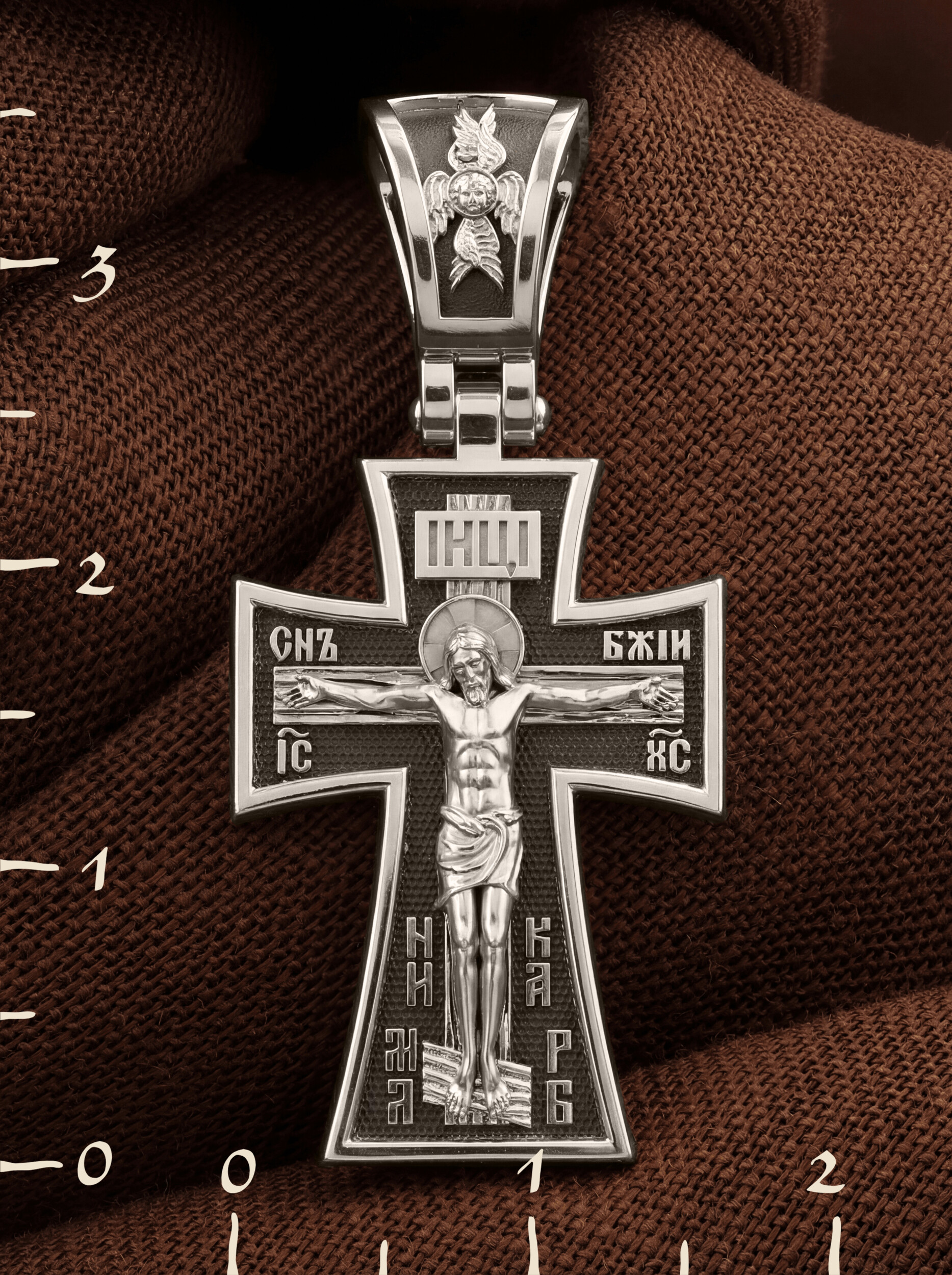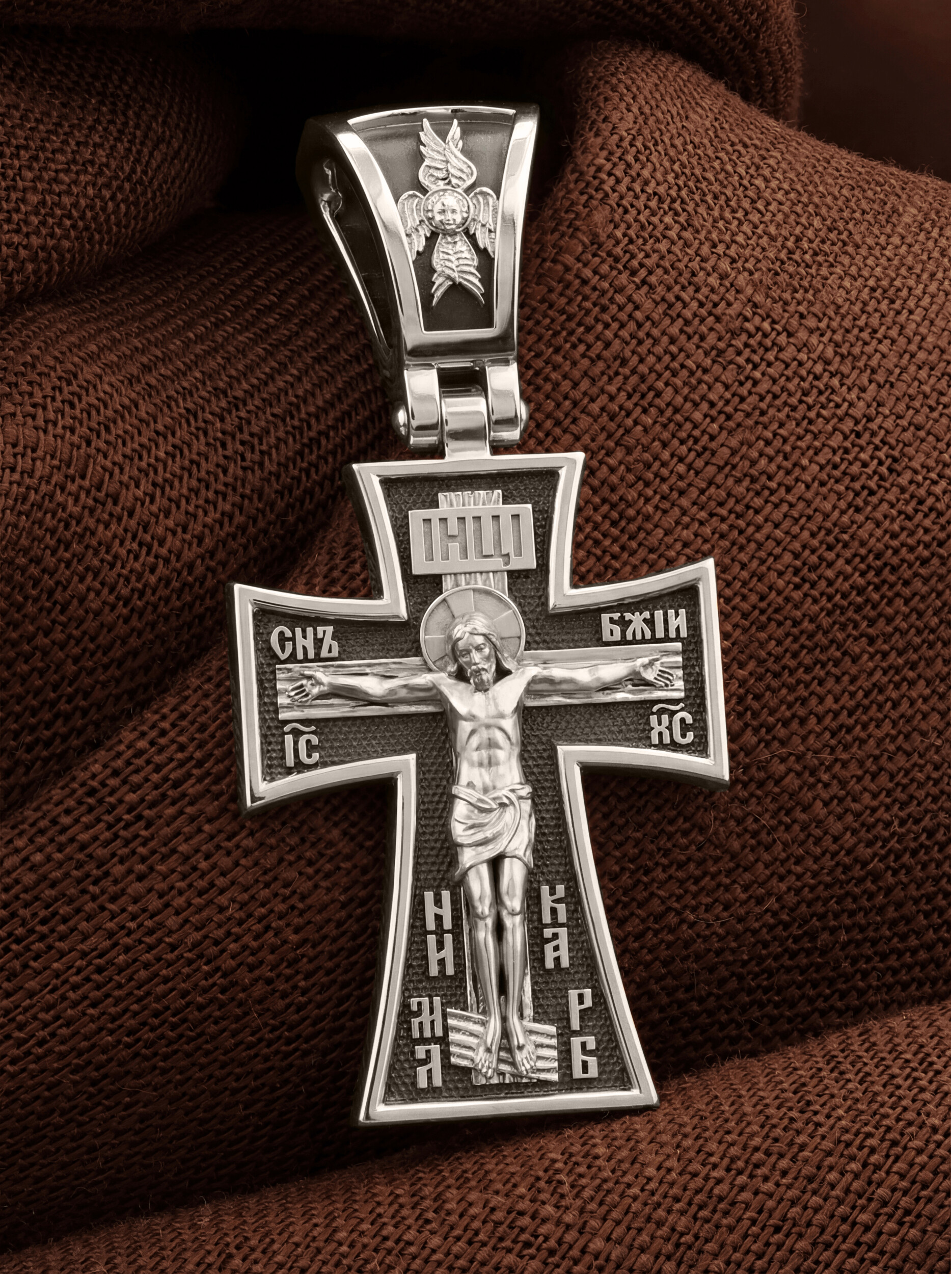 На лицевой стороне креста изображено Распятие, потому что это орудие казни Иисус Христос сделал орудием победы над грехом и смертью. Своими страданиями Он искупил грехи человечества, умерев и сошествовав во ад, победил сатану, освободил души праведников от вечной смерти и открыл им небесные врата рая. Жертва Христа сделала возможным спасение для каждого человека. На православном кресте Христос не умирает, а свободно простирает руки, ладони Иисуса открыты, будто он хочет обнять все человечество, даря им свою любовь и открывая путь к вечной жизни. Верхняя перекладина символизирует собой табличку с надписью «IHЦI» — Иисус Назарянин Царь Иудейский. Над перекладиной пишется и словосочетание «СНЪ БЖIЙ» — СЫН БОЖИЙ, ниже перекладины добавляется имя Спасителя «IC XC» — Иисус Христос. Рядом с образом Христа помещены слова — «НИКА» (греч. — Победитель). Возвышение, на котором стоит Крест, символизирует гору Голгофу, на которой произошло Распятие. У подножия Креста изображают прах Адама, обозначенный черепом. Буквы «МЛ» «РБ», написанные в нижней части креста, означают: «Место Лобное Рай Бысть».