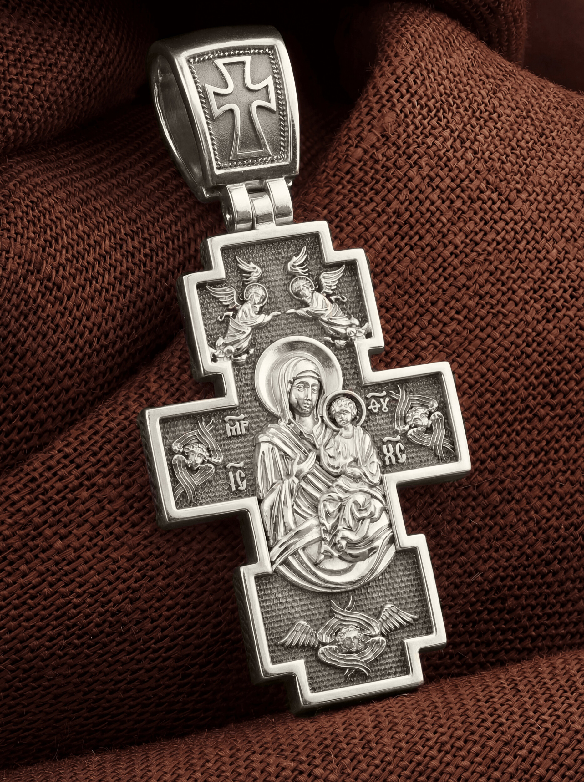 В центр оборотной стороны креста помещен образ Божией Матери «Всецарица», восседающая на царском троне. На руках Ее — Богомладенец Иисус Христос со свитком в левой руке. Пальцы Его правой руки сложены в благословляющем жесте.