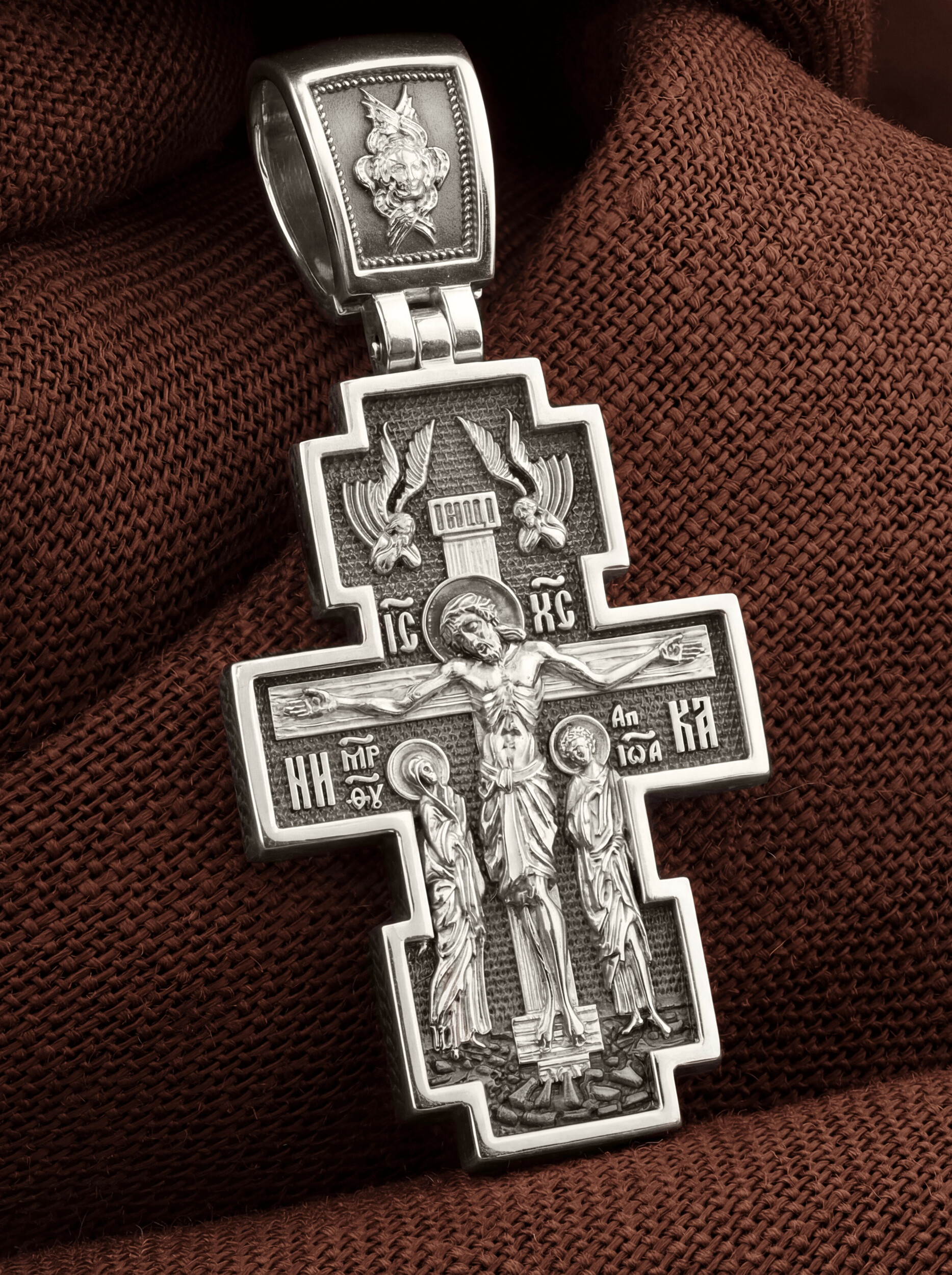 На лицевой стороне креста изображено Распятие Господа Иисуса Христа с предстоящими Ему святыми, которые, по преданию, находились у Креста Господа во время Его казни. Слева — Пресвятая Богородица, справа — апостол Иоанн Богослов. Верхняя перекладина креста символизирует титло — табличку, на которой, согласно Евангелию, было начертано: «Иисус Назорей Царь Иудейский» (IНЦI). Над перекладиной пишется сокращенно имя Спасителя «IC XC» — Иисус Христос, ниже перекладины добавляется: «НИКА» (греч. — Победитель). Возвышение, на котором стоит Крест, символизирует гору Голгофу, на которой произошло Распятие. У подножия Креста изображают прах Адама, обозначенный черепом. На кулонном кольце изображен шестикрылый Серафим — самый приближенный к Господу Ангел.