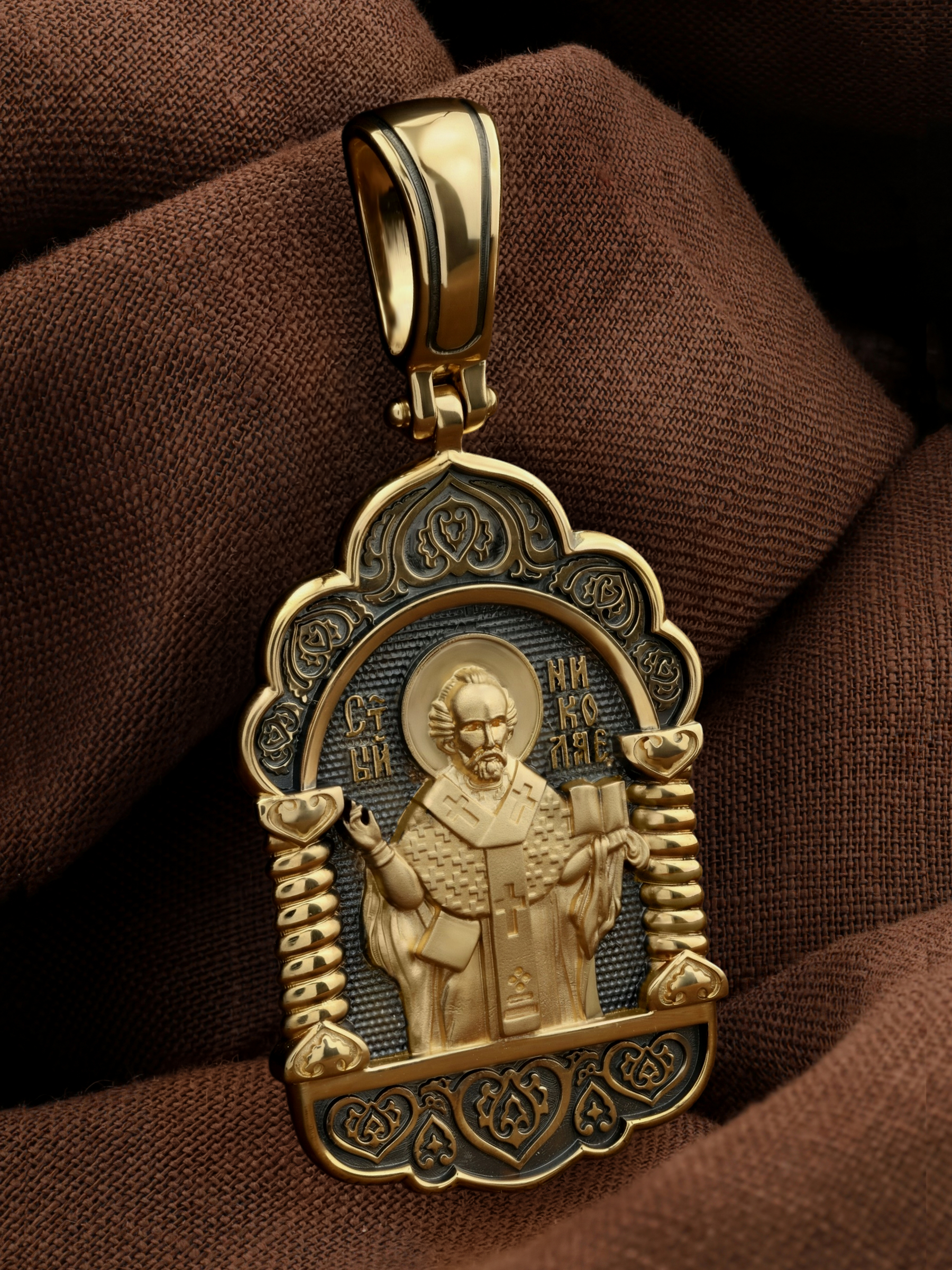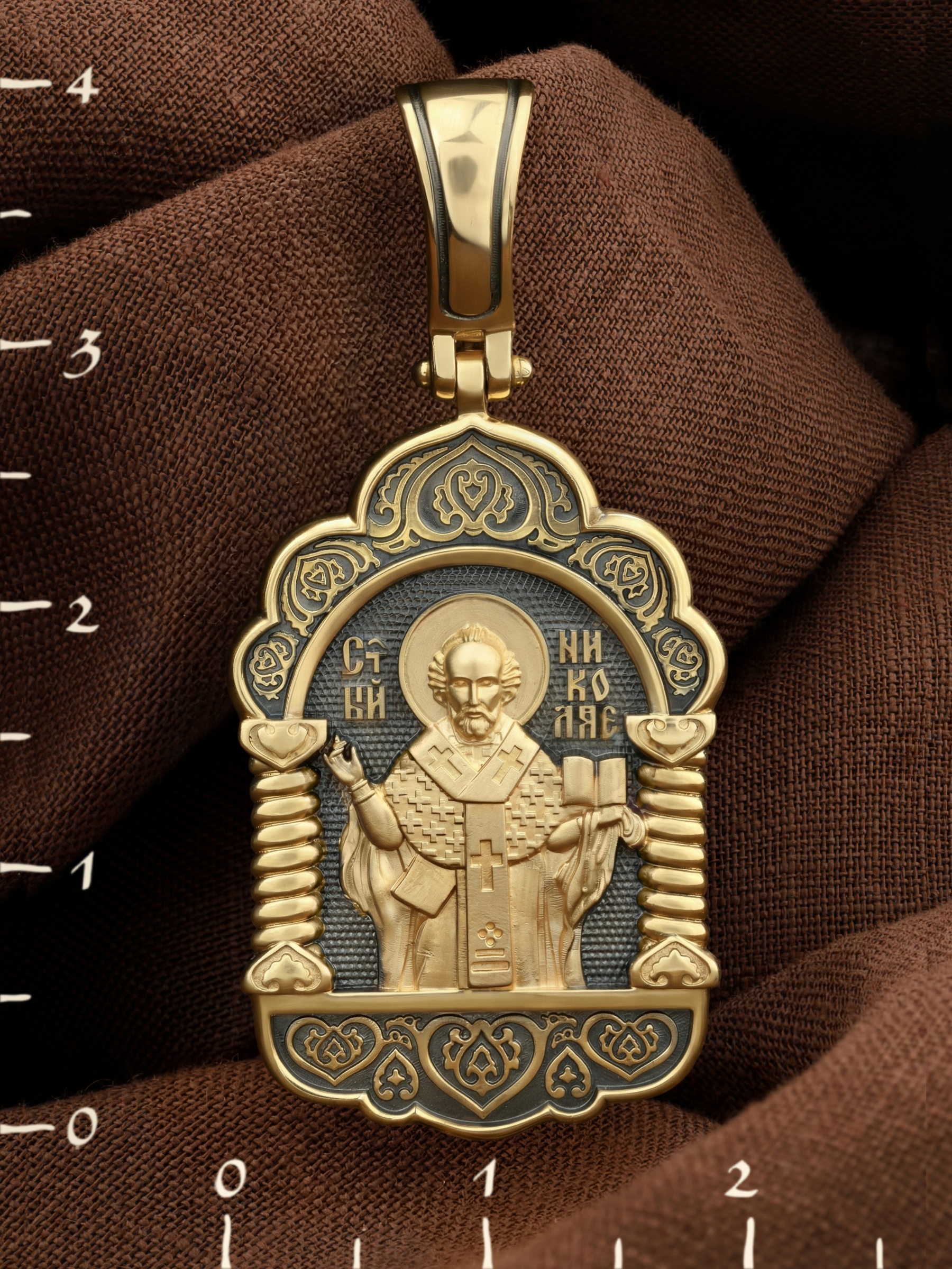 На лицевой стороне образка изображен Святитель Николай архиепископ Мир Ликийских, Чудотворец. Он является одним из самых почитаемых святых в православном мире. Святитель Николай родился во второй половине III века в Малой Азии в Ликийском городе Патары. С рождения Божий Угодник проявлял необыкновенные дарования. Сохранилось Предание, что во время крещения он, никем не поддерживаемый, простоял в купели три часа. Приняв сан священника, святитель Николай стал проводить еще более строгую подвижническую жизнь. Избранник Божий Николай стал вершиной всех добродетелей, поднятой до райской высоты. С кем из величайших праведников не сравнялся он образом духовной красоты, кому из них не последовал в своих деяниях и чудотворениях? Вся жизнь святого Николая — это служение Богу. Много великих и преславных чудес сотворил великий Святитель Николай Угодник. Он помогал сущим в бедах, укрощал штормы, спасал от потопления и выносил на сушу из глубины морской, освобождал из плена и приносил освобожденных домой, избавлял от уз и темницы, защищал от посечения мечом, освобождал от смерти и подавал многим различные исцеления, слепым прозрение, хромым хождение, глухим слух, немым дар слова.