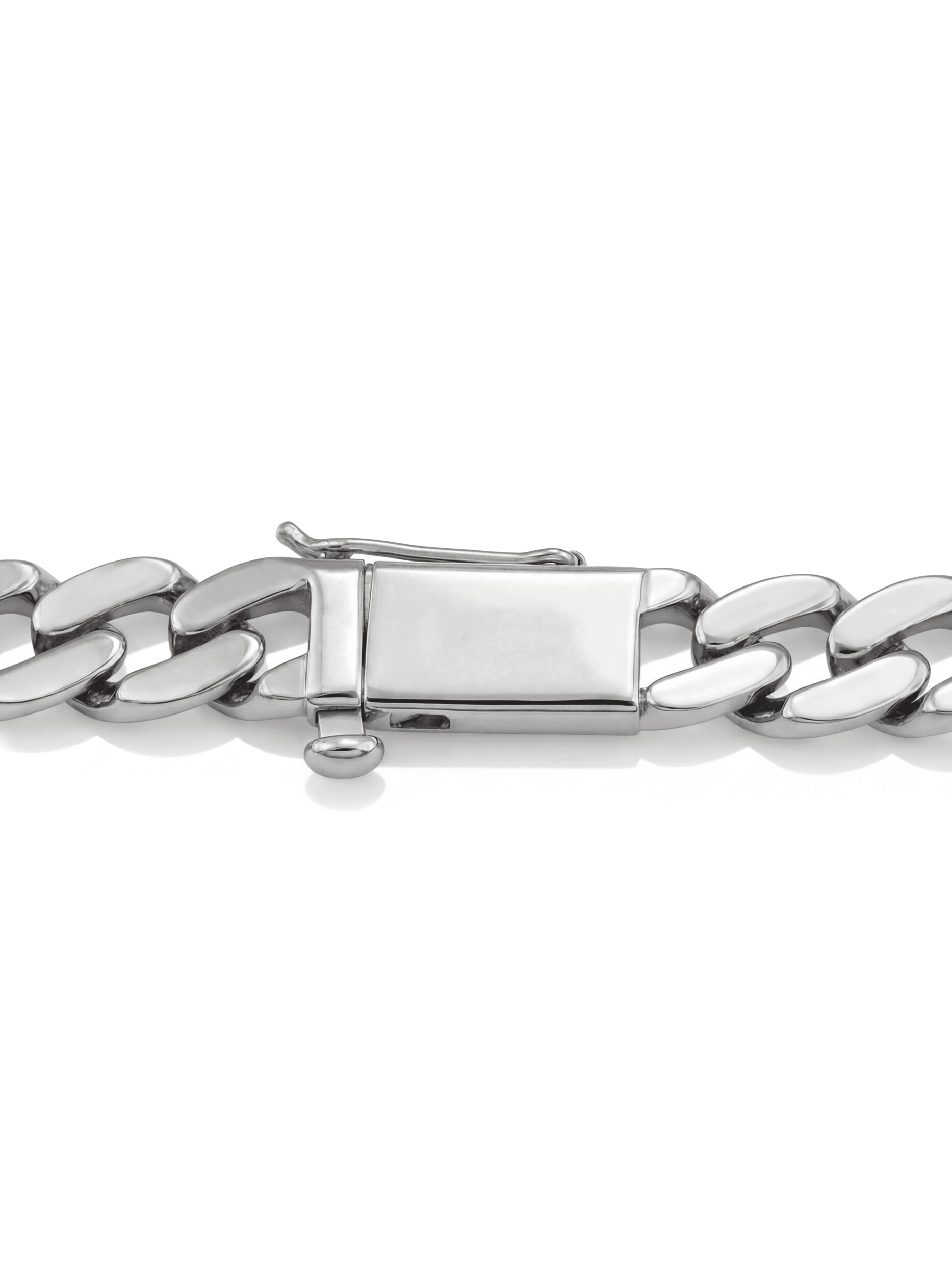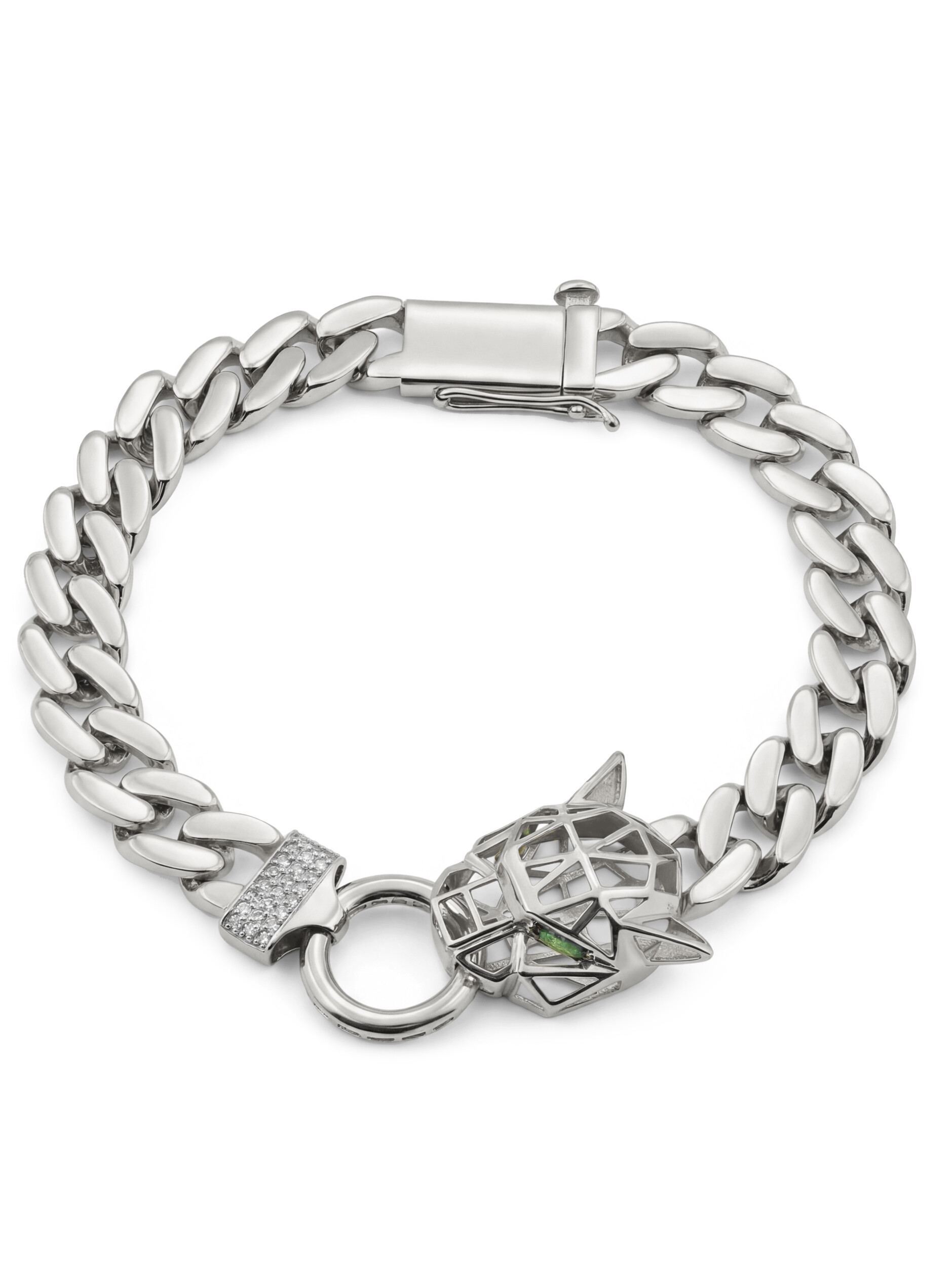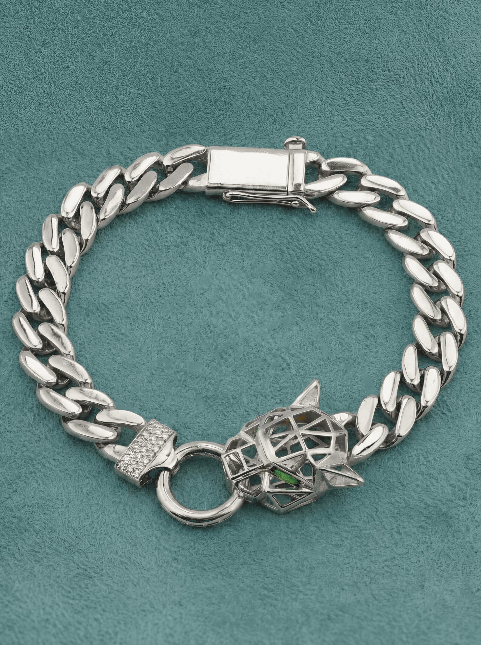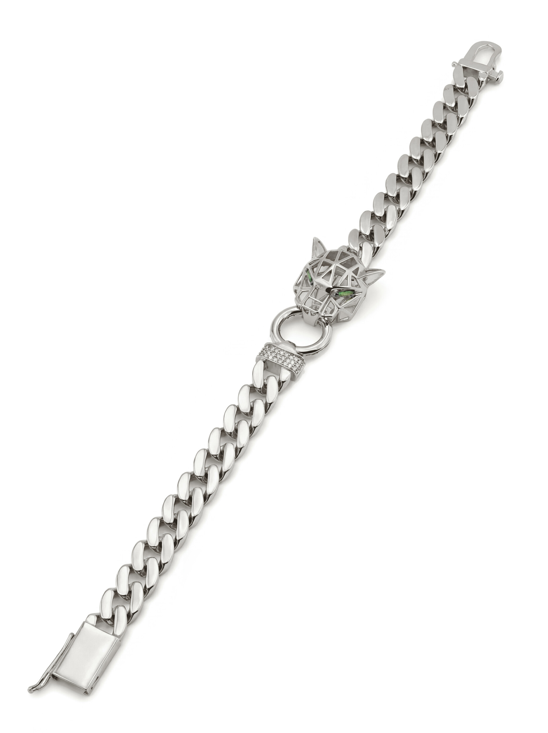 Декоративная часть украшена 52 вставками, среди которых сияющие бриллианты и яркий изумруд. Комбинация камней круглой формы и формы маркиз создает эффектный контраст: классический белый блеск бриллиантов дополняется глубоким зеленым оттенком изумруда, подчеркивая благородство белого золота. Это ювелирное украшение выполнено в стиле унисекс и одинаково эффектно смотрится как на женском, так и на мужском запястье.
