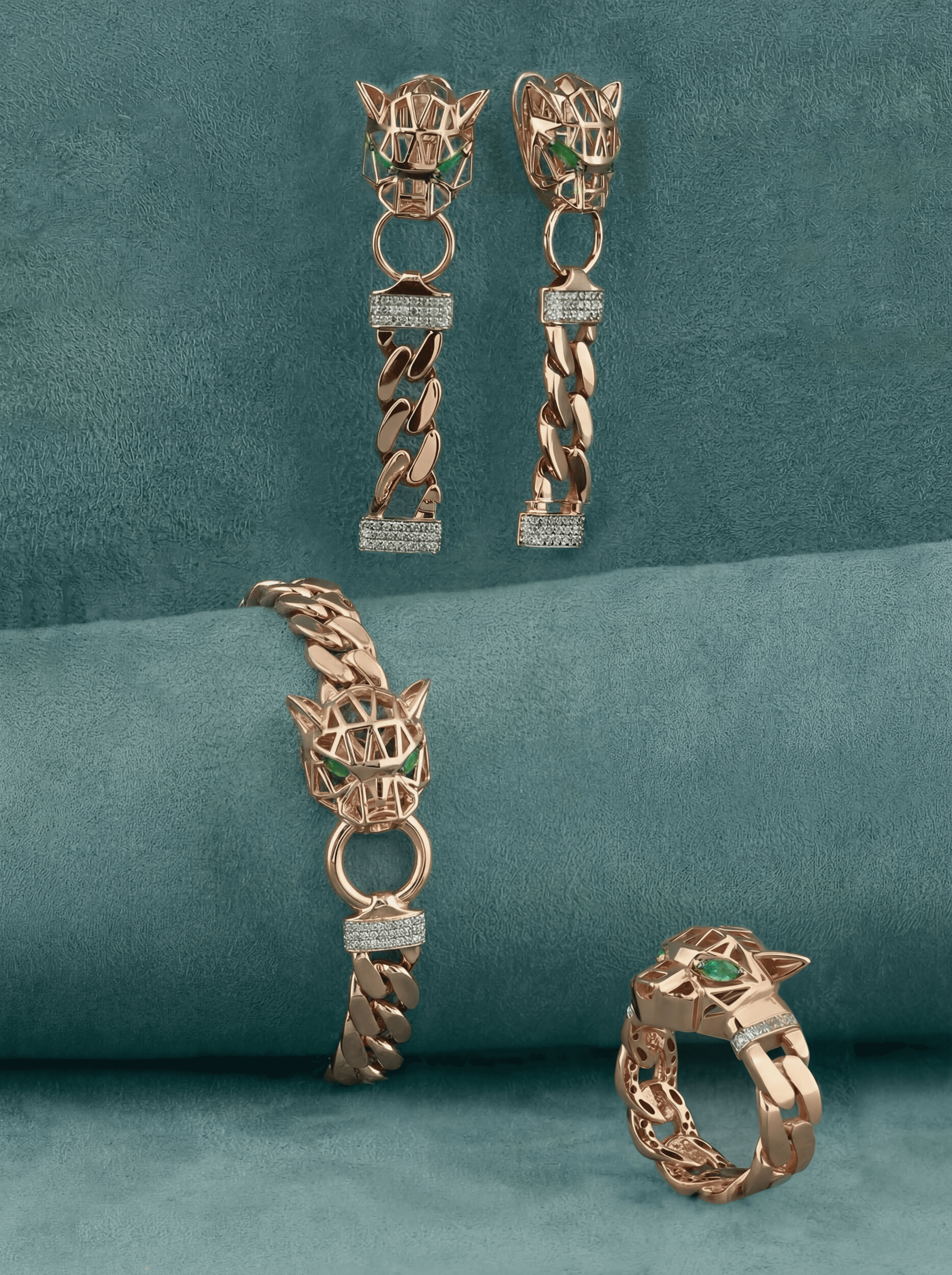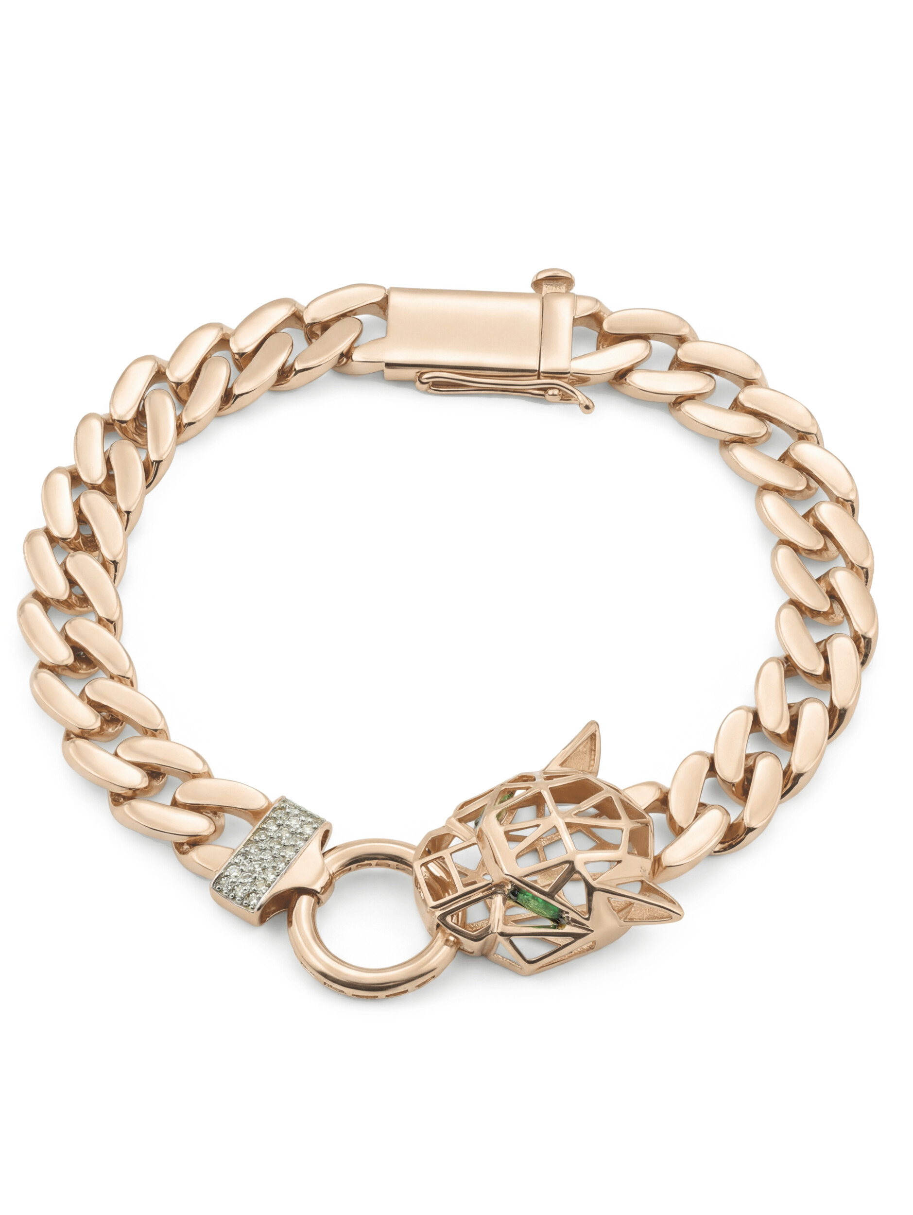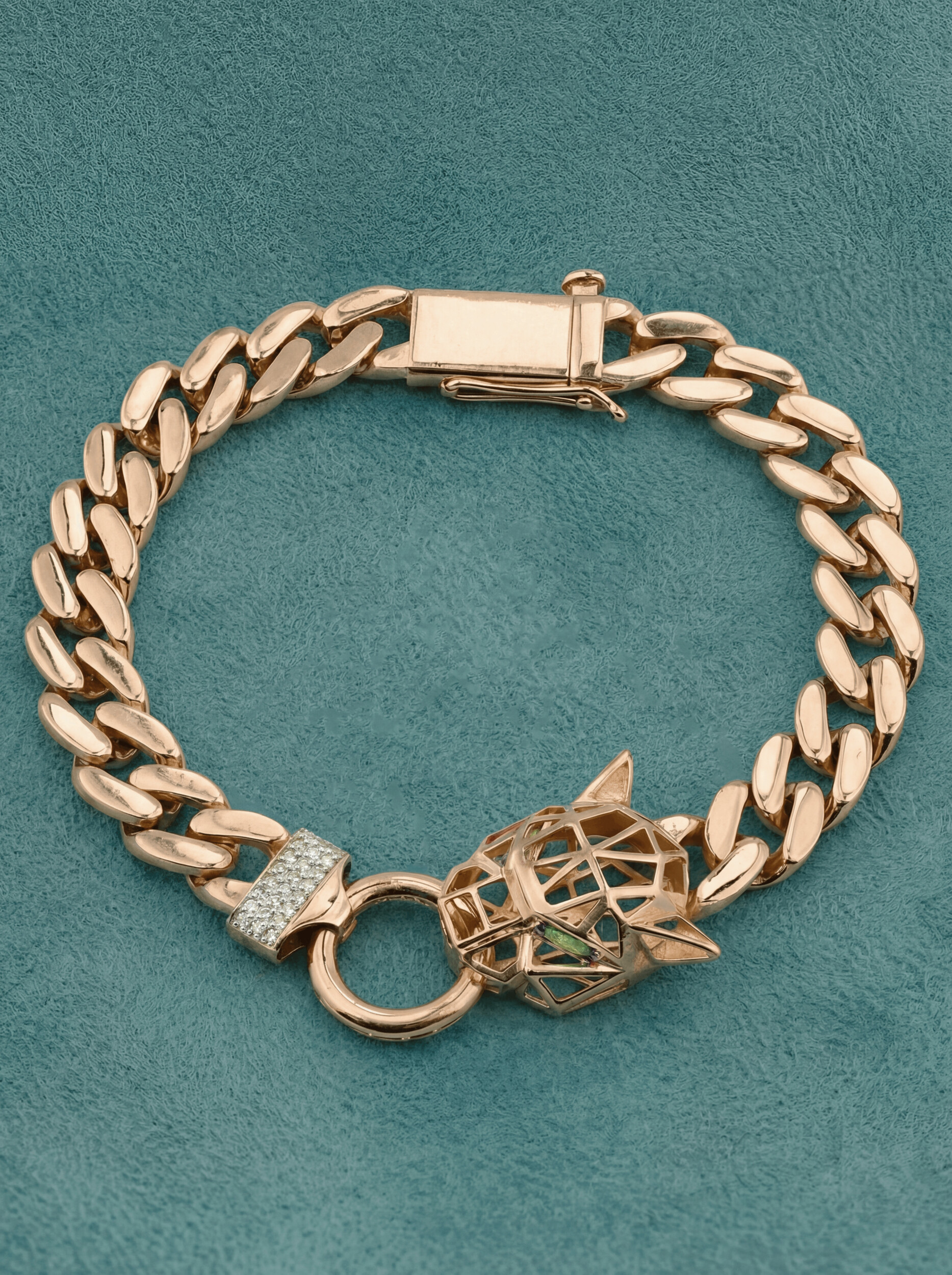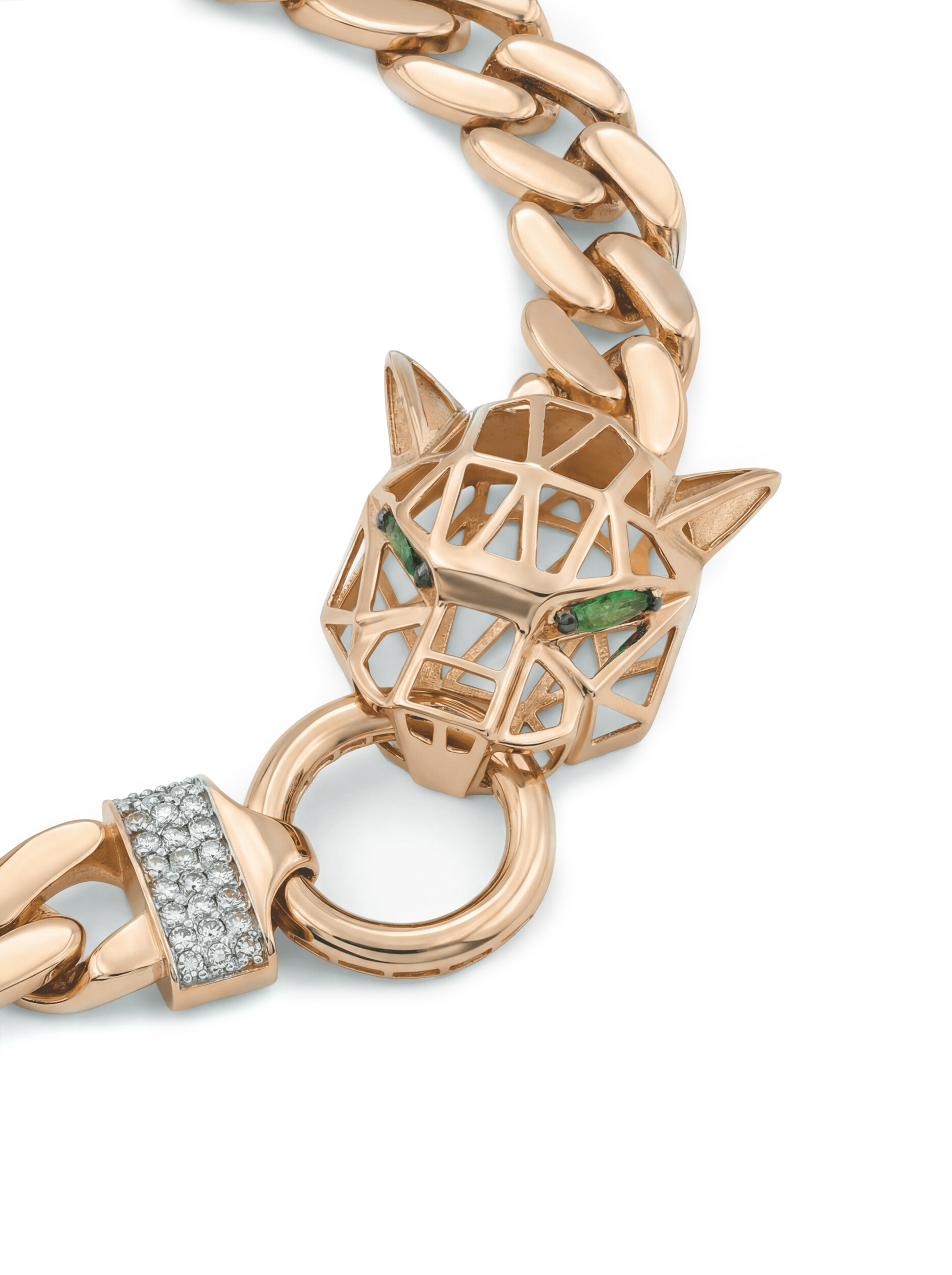 Этот изысканный браслет из коллекции Vioretty — Puma transforme станет воплощением смелого стиля и утонченного вкуса. Массивное украшение выполнено из красного золота 585 пробы, что придает изделию теплое, благородное сияние. Центральным элементом дизайна является выразительная голова пантеры, выполненная в современной геометрической манере, подчеркивающая статус и решительность своего владельца. Детализированное исполнение делает аксессуар ярким акцентом любого образа.