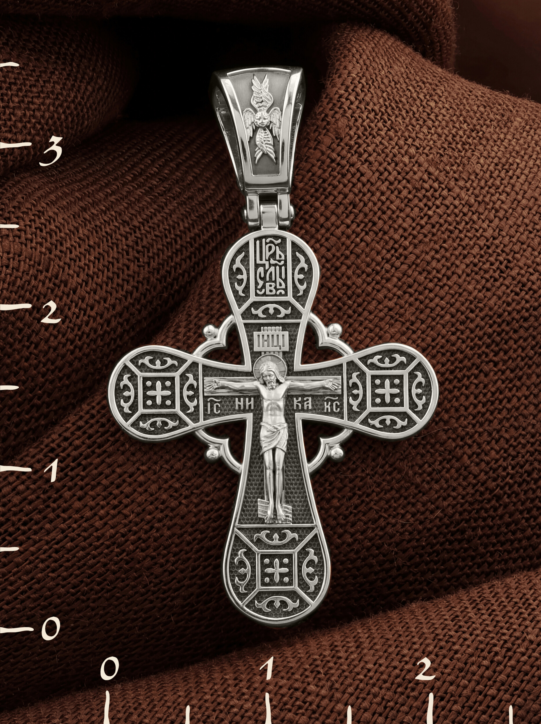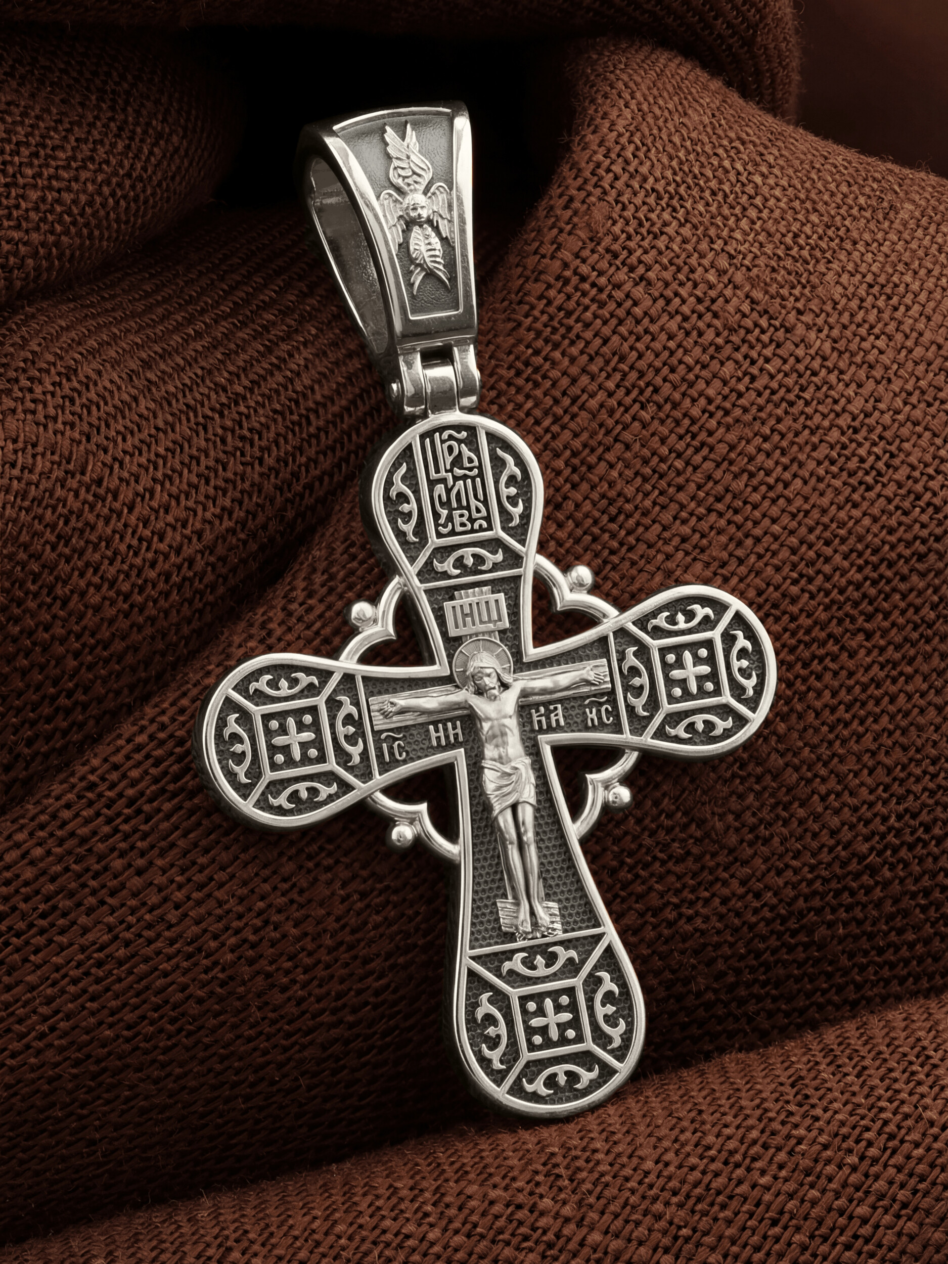 На лицевой стороне креста изображено Распятие, потому что это орудие казни Иисус Христос сделал орудием победы над грехом и смертью. Своими страданиями Он искупил грехи человечества, умерев и сошествовав во ад, победил сатану, освободил души праведников от вечной смерти и открыл им небесные врата рая. Жертва Христа сделала возможным спасение для каждого человека. На православном кресте Христос не умирает, а свободно простирает руки, ладони Иисуса открыты, будто он хочет обнять все человечество, даря им свою любовь и открывая путь к вечной жизни. Над титлом видим слова «ЦРЬ СЛВЫ» — Царь Славы. Верхняя перекладина символизирует собой табличку с надписью «IHЦI» — Иисус Назарянин Царь Иудейский. Под перекладиной пишется сокращенно имя Спасителя «IC XC» — Иисус Христос, рядом добавляется: «НИКА» (греч. — Победитель). Возвышение, на котором стоит Крест, символизирует гору Голгофу, на которой произошло Распятие. У подножия Креста изображают прах Адама, обозначенный черепом.