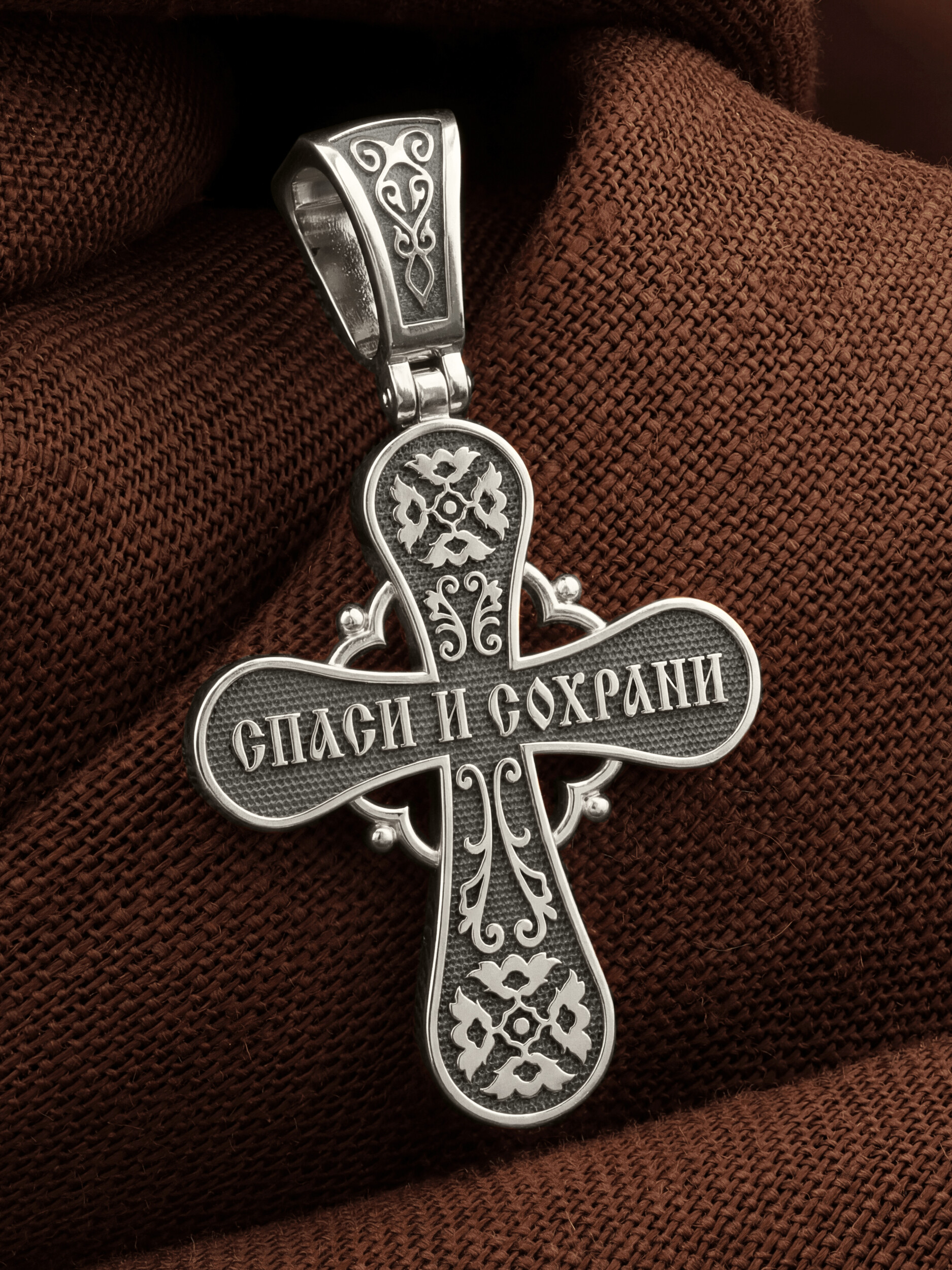 На обороте данного креста, в окружении изящного растительного узора, написано молитвенное славословие: «Спаси и сохрани».