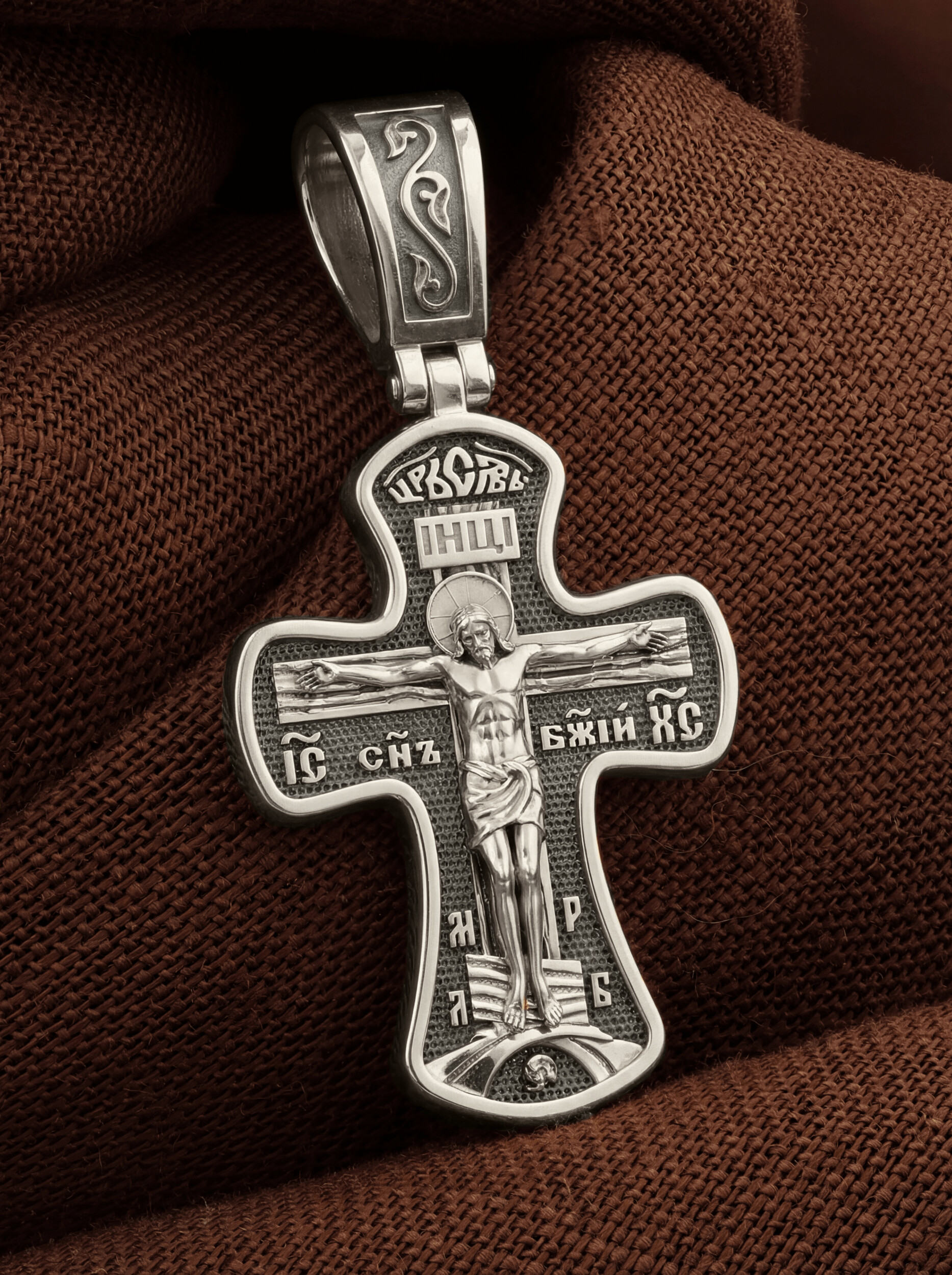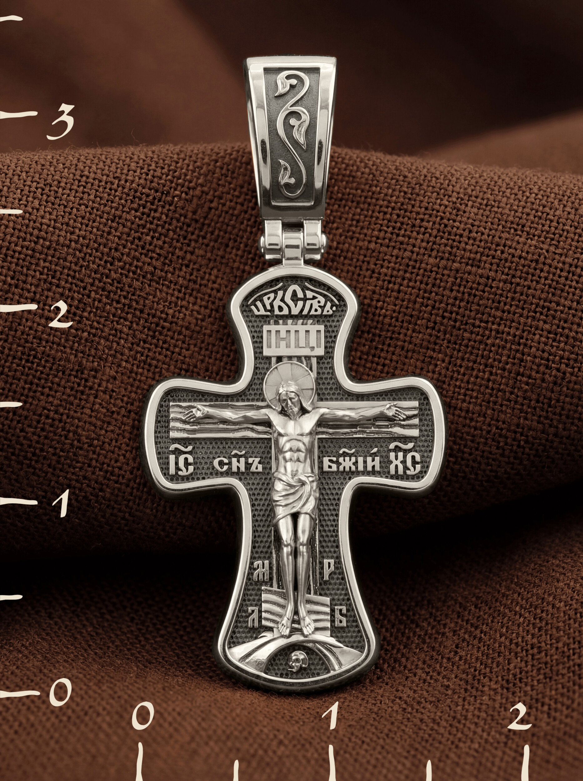 Крест четырехконечный со слегка расширяющимися лопастями. Такая форма креста имеет многочисленные духовные смыслы. Ее устремленная ввысь вертикаль означает справедливость и непреложность Божественных заповедей, прямоту Божией правды и истины, не допускающей никаких нарушений. Эта прямота пересекается поперечной перекладиной, означающей любовь и милость Божию к грешным людям. На лицевой стороне креста изображено Распятие, потому что это орудие казни Иисус Христос сделал орудием победы над грехом и смертью. На лицевой стороне креста изображено Распятие Иисуса Христа. Над титлом видим слова «ЦРЬ СЛВЫ» — Царь Славы. Верхняя перекладина символизирует собой табличку с надписью «IHЦI» — Иисус Назарянин Царь Иудейский. Над перекладиной пишется сокращенно имя Спасителя «IC XC» — Иисус Христос и словосочетание «СНЪ БЖIЙ» — «СЫН БОЖИЙ». Две пары букв на кресте «МЛ» «РБ» означают: Место Лобное Рай Бысть. Возвышение, на котором стоит Крест, символизирует гору Голгофу, на которой произошло Распятие. У подножия Креста изображают прах Адама, обозначенный черепом.