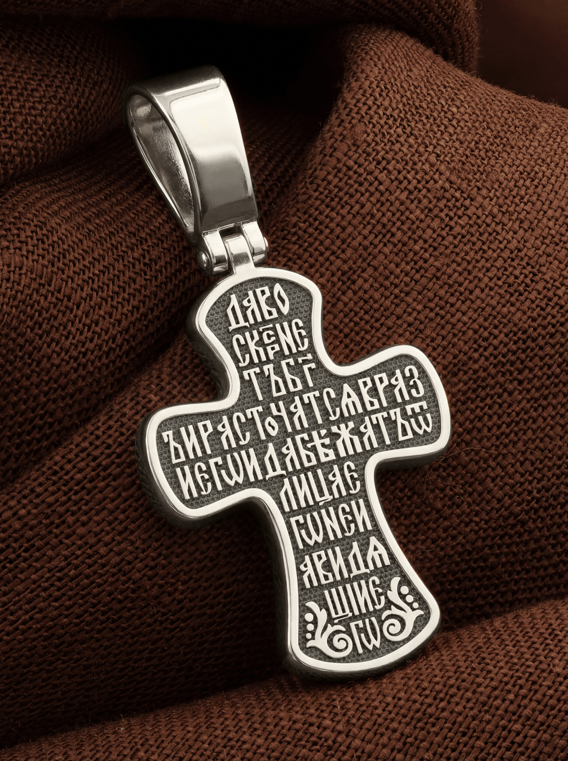 Всю оборотную часть креста занимает начальный стих оградительной молитвы Честному Кресту Господню: «Да воскреснет Бог, и расточатся врази Его, и да бежат от лица Его ненавидящие Его.»