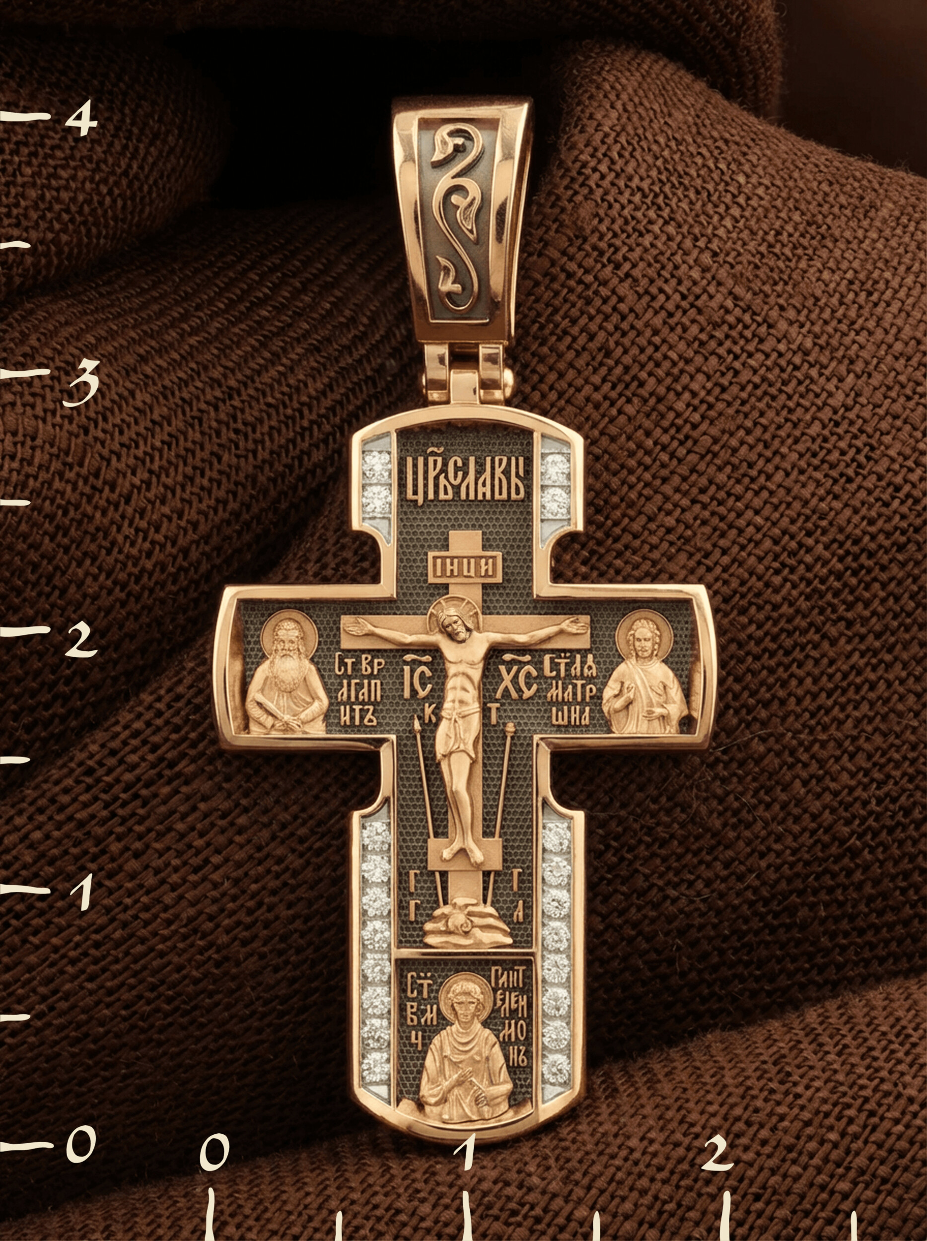 Внизу креста написана молитва обращенная к Божией Матери «Все упование мое на Тя возлагаю, Мати Божия, сохрани мя под кровом Твоим».