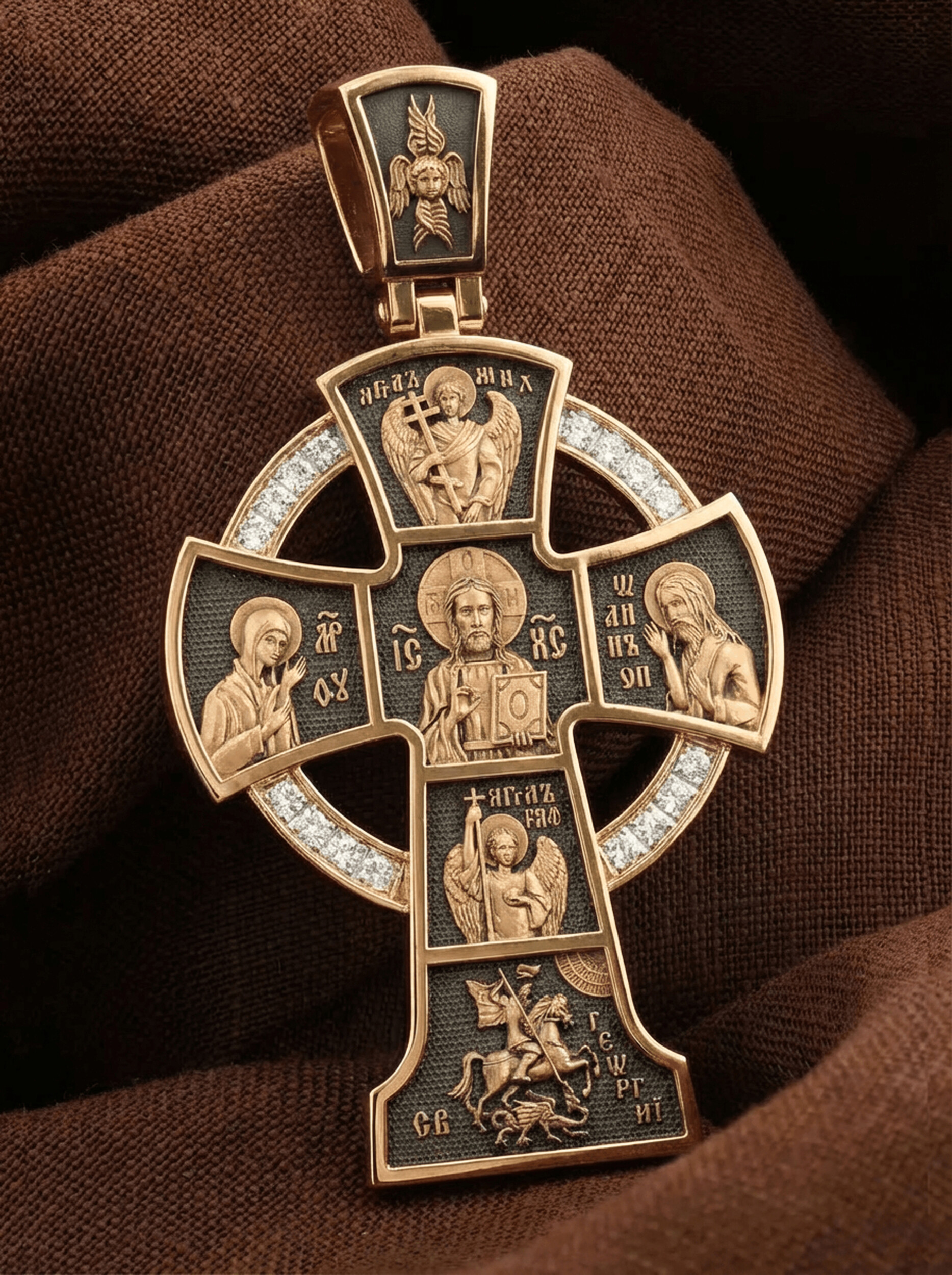 Вверху и внизу от спасителя предстоят два архангела, Михаил (Первый служитель Божественной славы, страж и защитник) и Гавриил (служитель Божественной крепости и изъявитель сокровенных Божьих тайн). Внизу помещен образ свт. Георгия Победоносца. Святой при жизни прославился не только как храбрый воин и твердый исповедник веры, но и как сострадательный, милосердный целитель и чудотворец. Святому молятся о покровительстве воинам и армии, о защите государства, сохранении и спасения России.