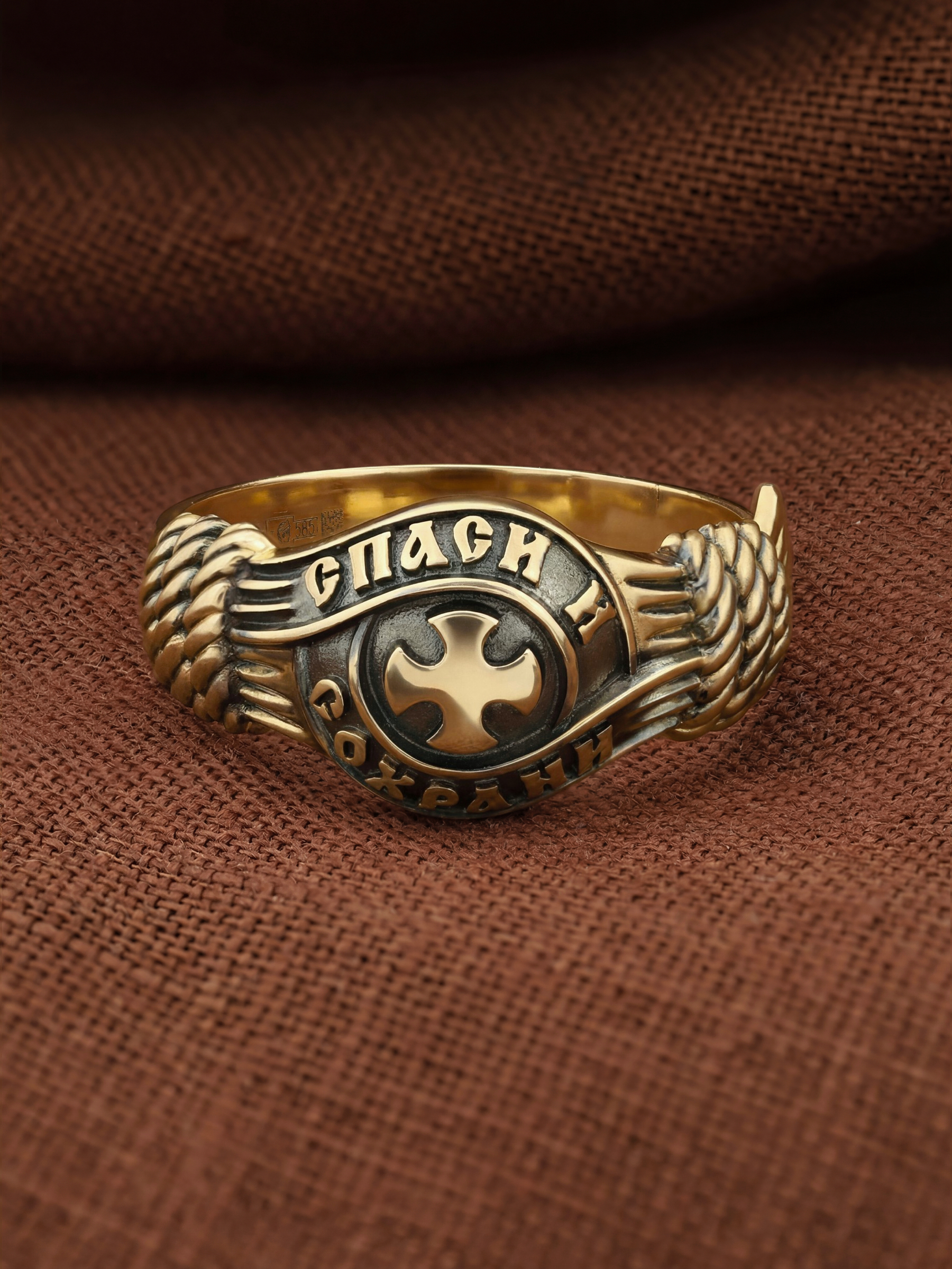 В центральной части лицевой стороны кольца изображен Крест. Господь сказал: кто хочет идти за Мною, отвергнись себя, и возьми крест свой, и следуй за Мною. Крест является символом жертвенной любви Всеблагого Бога к падшим людям, всепобеждающим духовным оружием христиан, основанием и средоточием церковной жизни. Иисус Христос, как искупительная жертва освобождения человечества от власти греха, умер крестной смертью и в третий день воскрес. Крест имеет четырехконечную форму с равными балками. Такого типа кресты существовали во многих дохристианских культурах и были в первую очередь использованы Церковью для выражения идеи христианского преобразования мира. Вокруг креста помещена молитва: «Спаси и Сохрани».