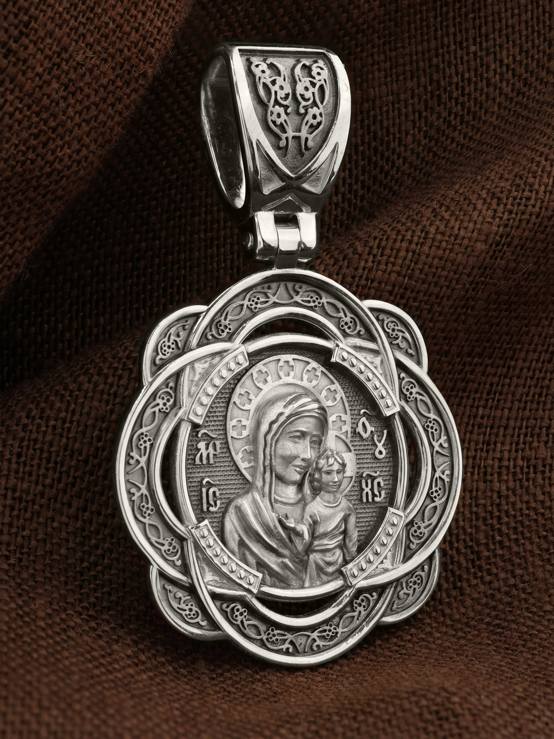 На лицевой части образка изображена Казанская икона Пресвятой Богородицы — одна из самых почитаемых в России. Икона была явлена на пожарище в Казани в 1579 году. В 1904 году святыня была похищена и уничтожена, но чудотворную силу иконы Богородица явила во многих ее списках. Молитва перед Казанской иконой Божьей Матери помогает во всех сложных случаях жизни, во всех печалях, невзгодах, скорбях.