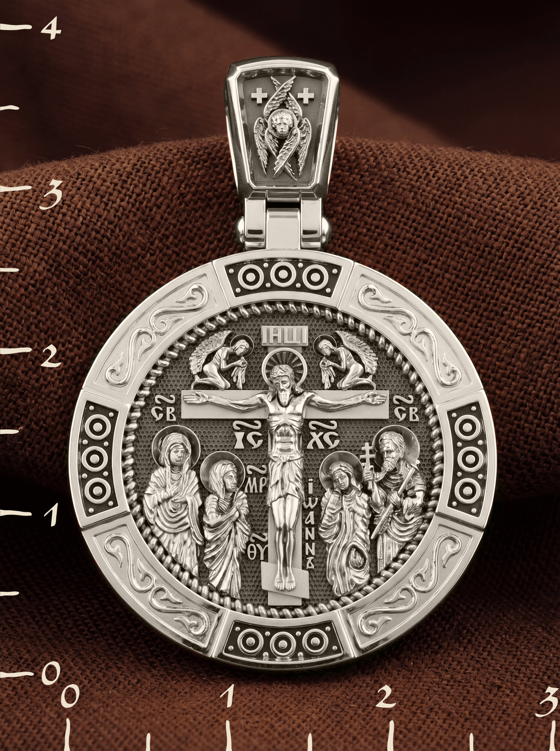 На лицевой стороне образка изображено Распятие Господа Иисуса Христа с предстоящими Ему святыми, которые, по преданию, находились у Креста Господа во время Его казни. Слева — Пресвятая Богородица и св. Мария Клеопова, справа — апостол Иоанн Богослов и мч. Лонгин Сотник.