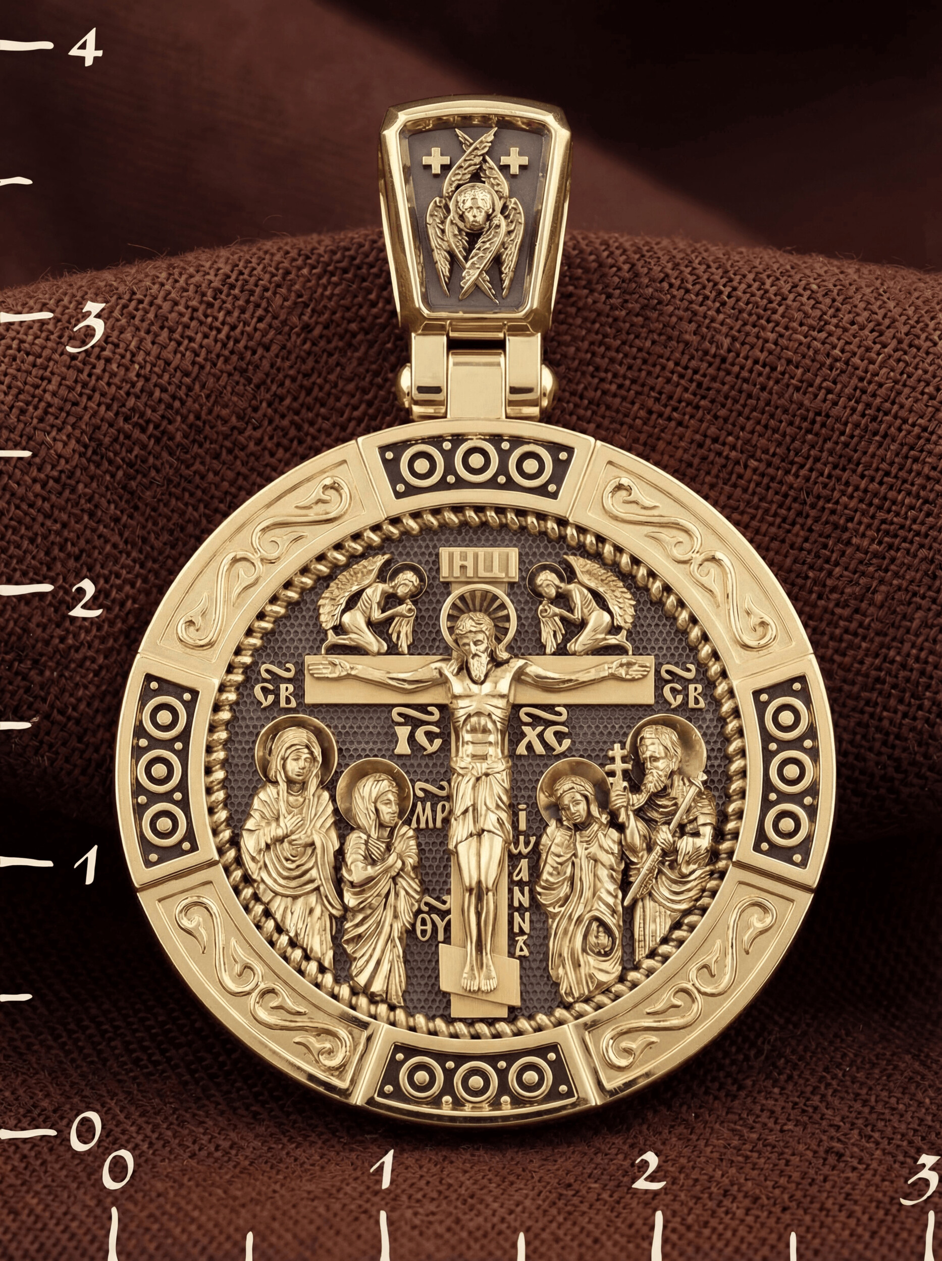 На лицевой стороне образка изображено Распятие Господа Иисуса Христа с предстоящими Ему святыми, которые, по преданию, находились у Креста Господа во время Его казни. Слева — Пресвятая Богородица и св. Мария Клеопова, справа — апостол Иоанн Богослов и мч. Лонгин Сотник.
