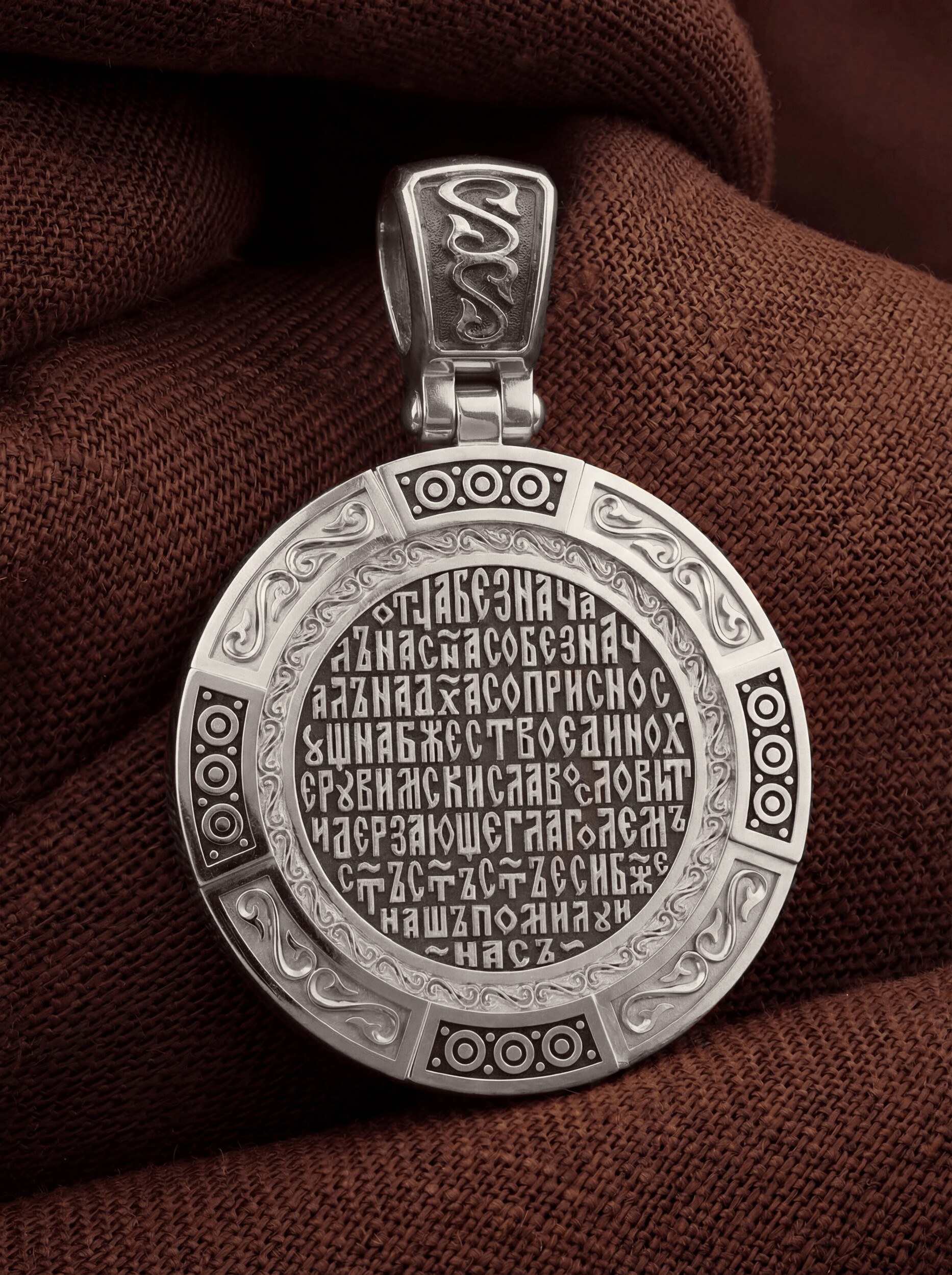 На обороте образка написана молитва: «Отца безначальна, Сына собезначальна, Духа соприсносущна, Божество едино, херувимски славословити дерзающе глаголем: свят, свят, свят еси Боже наш, помилуй нас».