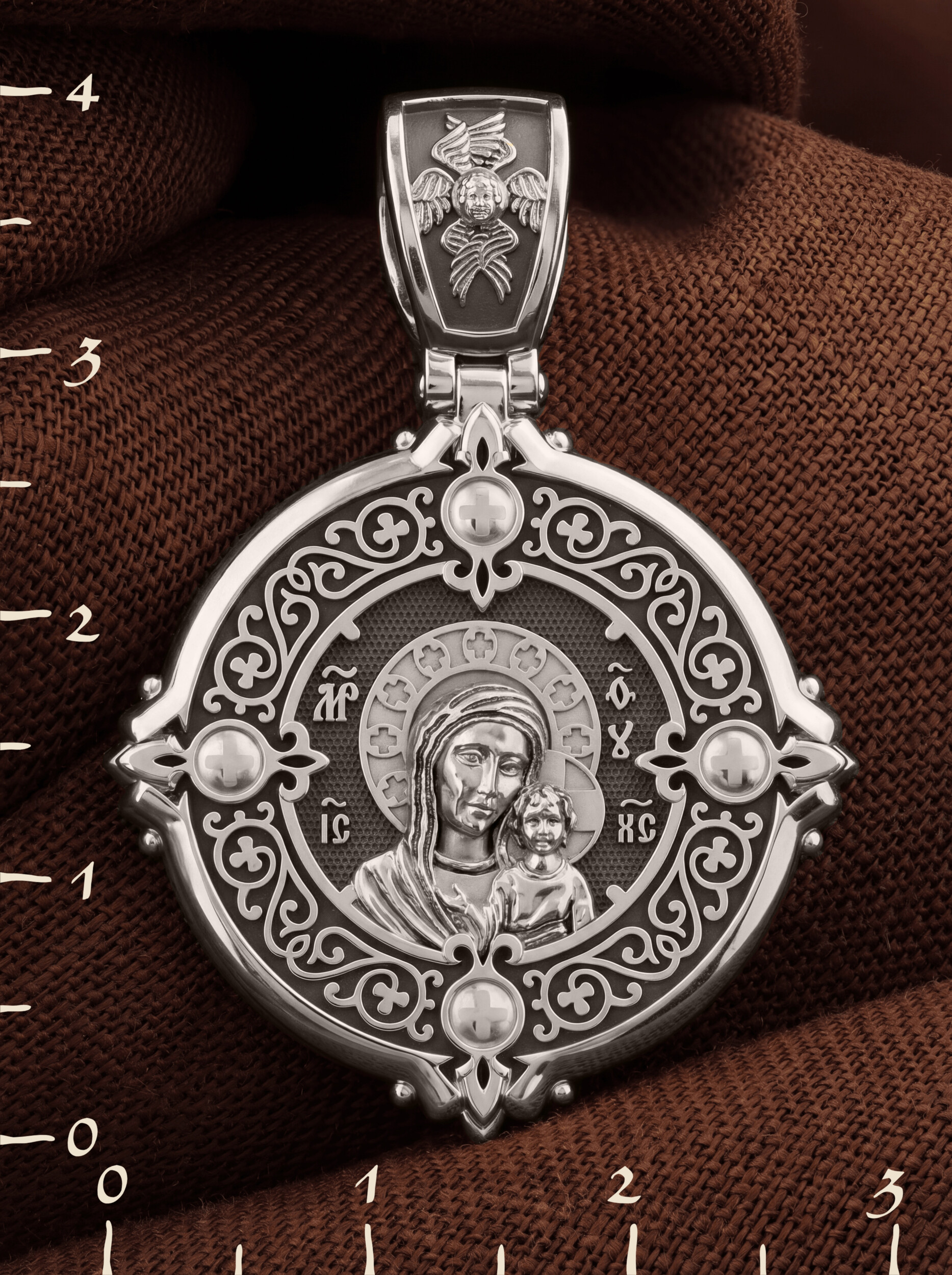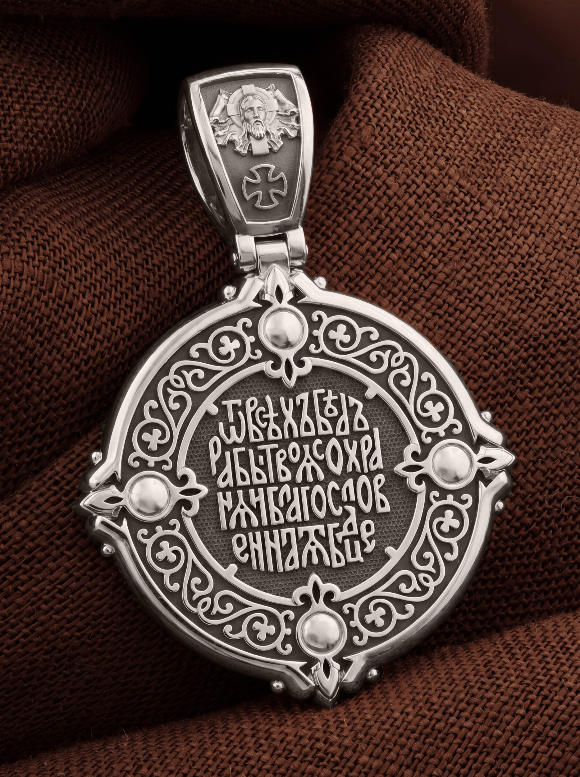 На обороте написана молитва к Богородице: «От всех бед рабы Твоя сохраняй, Благословенная Богородица!». На кулонном кольце изображен Спас Нерукотворный — Символ вочеловечившегося Божества и шестикрылый Серафим — самый приближенный к Господу Ангел.