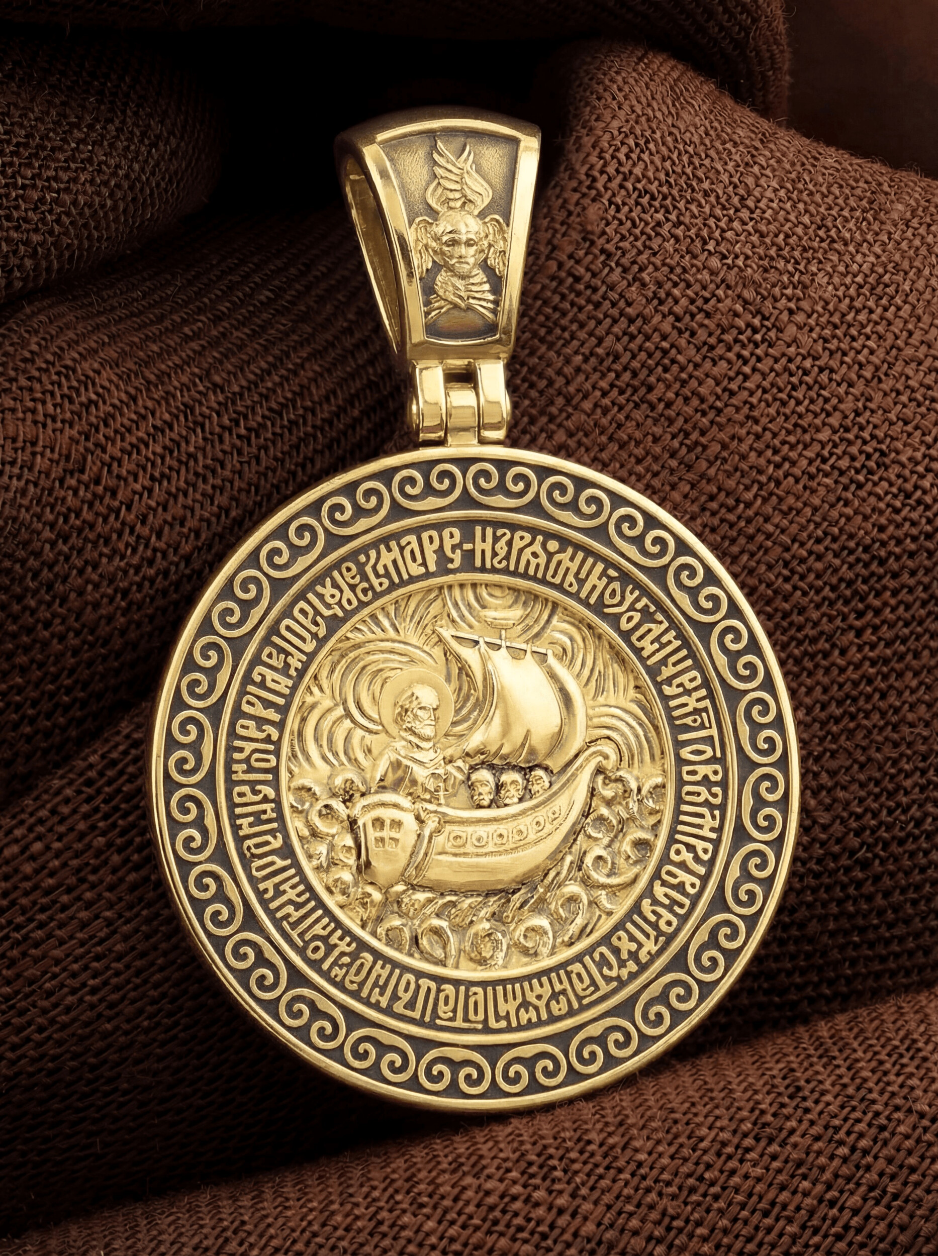 На кулонном кольце изображен Спас Нерукотворный — Символ вочеловечившегося Божества и шестикрылый Серафим — самый приближенный к Господу Ангел.