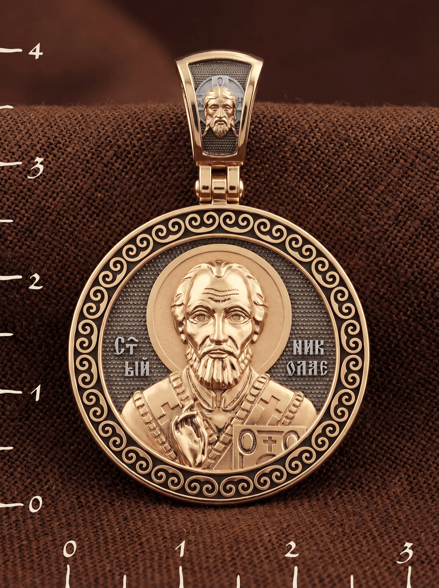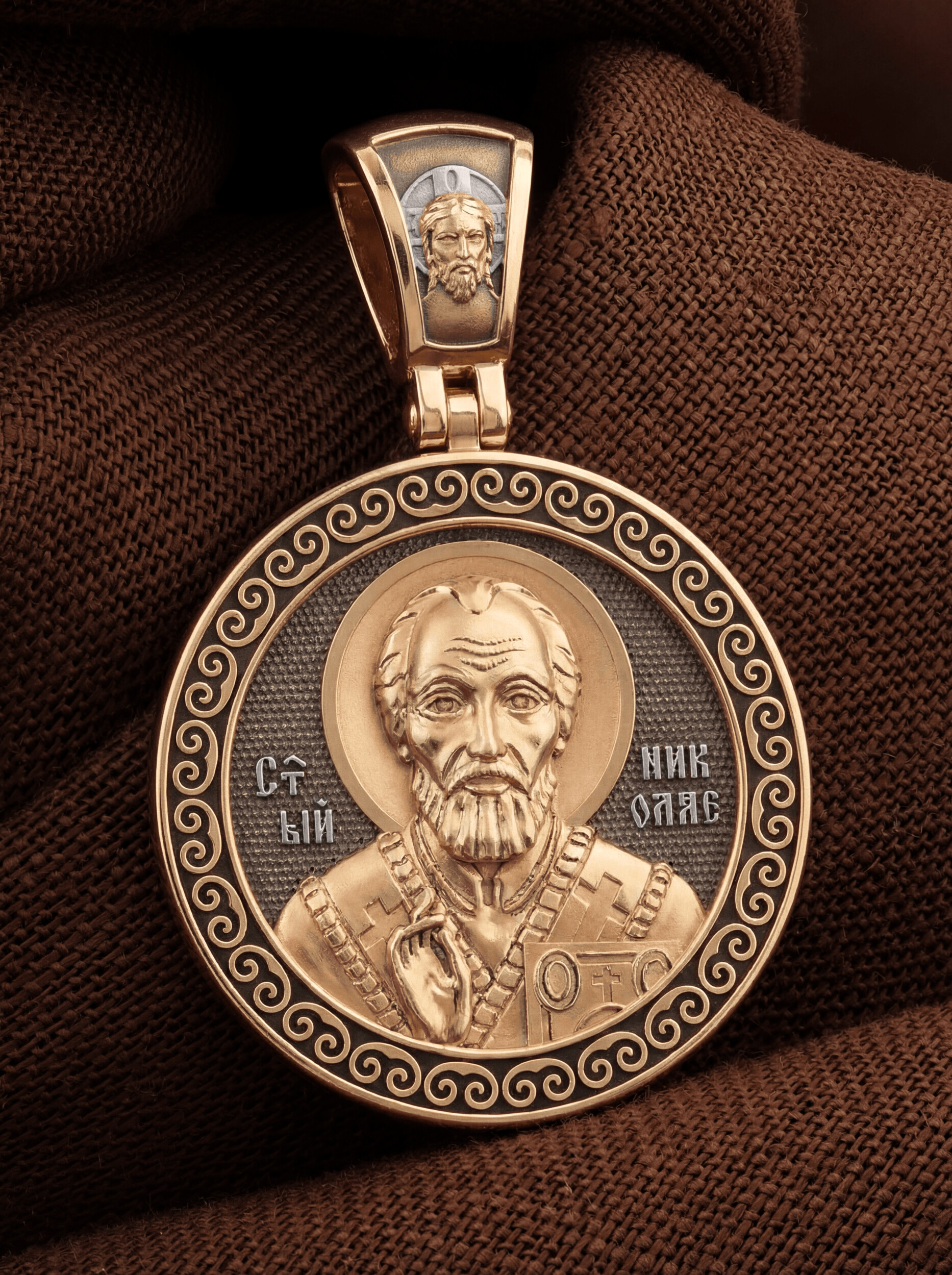Лицевую сторону возглавляет икона Святителя Николая Чудотворца. Живший в III веке епископ Ликийского города Миры — самый почитаемый святой не только в России, но и во всем мире. Николай Чудотворец, помощник в делах, покровитель учащихся, утешитель обиженных и нуждающихся, целитель самых страшных и тяжелых недугов, предстатель и молитвенник за людей перед Богом. Также Святитель Николай Чудотворец известен своими молитвами за путешественников, когда непрестанный ветер и бушующие волны утихают и корабль заходит в спокойную гавань.