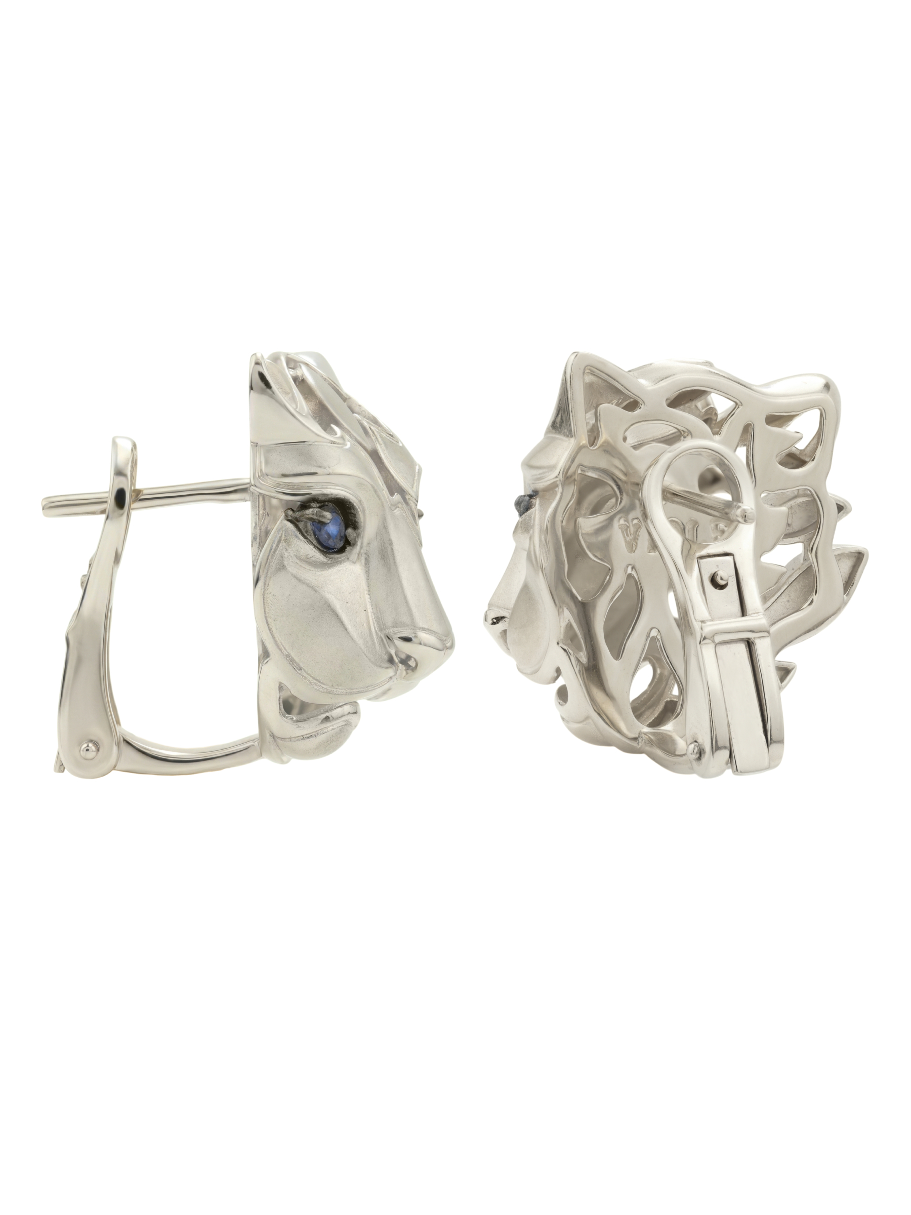 Ключевым акцентом украшения стали 4 вставки из сапфиров насыщенного синего цвета. Круглая форма камней, играющих роль пронзительных глаз хищника, гармонично дополняет сложную художественную фактуру золота. Детализированная проработка форм превращает эти серьги в настоящий арт-объект, который приковывает к себе восхищенные взгляды.