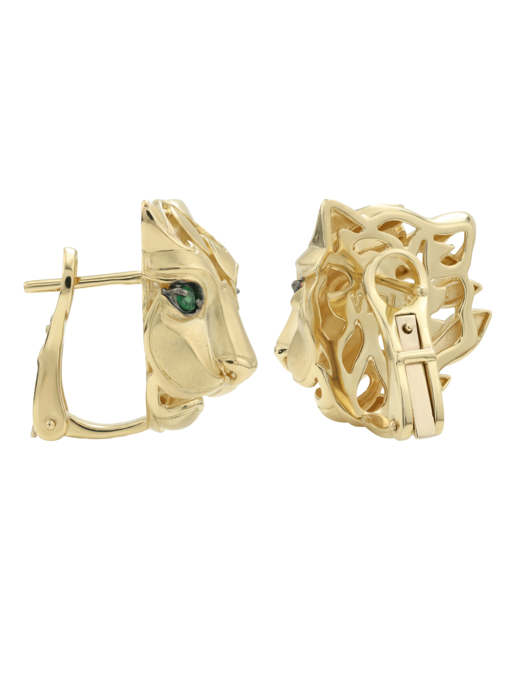 Взгляд хищника притягивает внимание благодаря выразительным вставкам: в изделии использовано четыре изумруда круглой формы. Глубокий зеленый цвет вставок эффектно контрастирует с теплым блеском лимонного золота, создавая гармоничное и запоминающееся сочетание. Продуманный дизайн позволяет этим серьгам органично дополнить как женский, так и мужской образ, добавляя ноту статусности и уверенности.