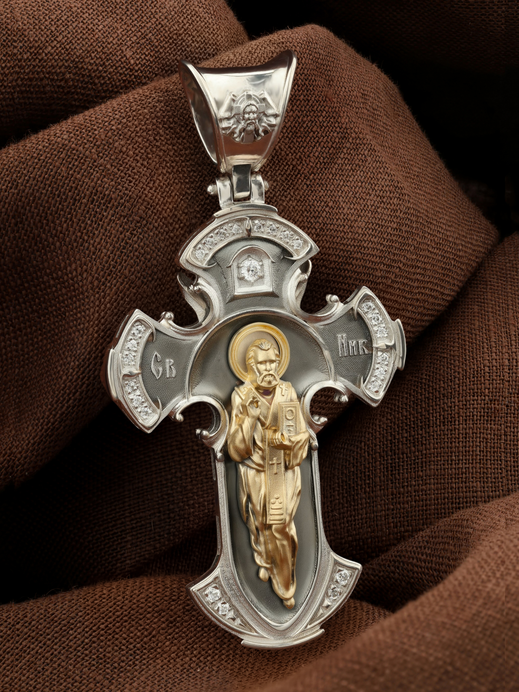 Оборотную сторону креста возглавляет икона святителя Николая Чудотворца. На кулонном кольце помещено изображение Спаса Нерукотворного — образ Спасителя, который Он запечатлел на плате и передал для исцеления больному проказой царю Эдессы. ему придается победное и защитное значение.