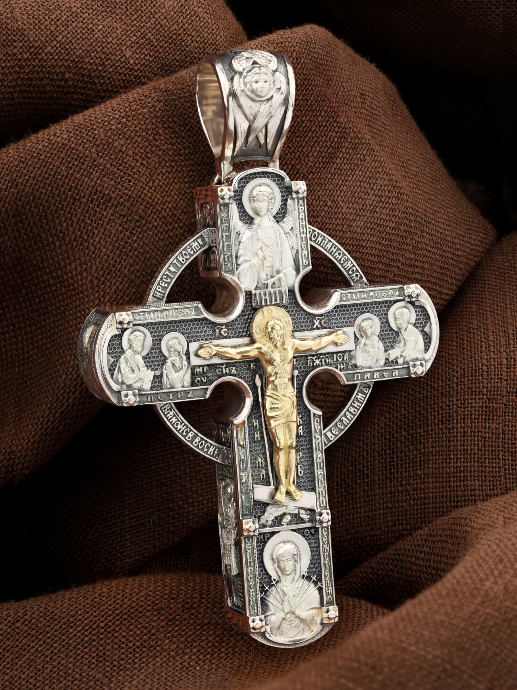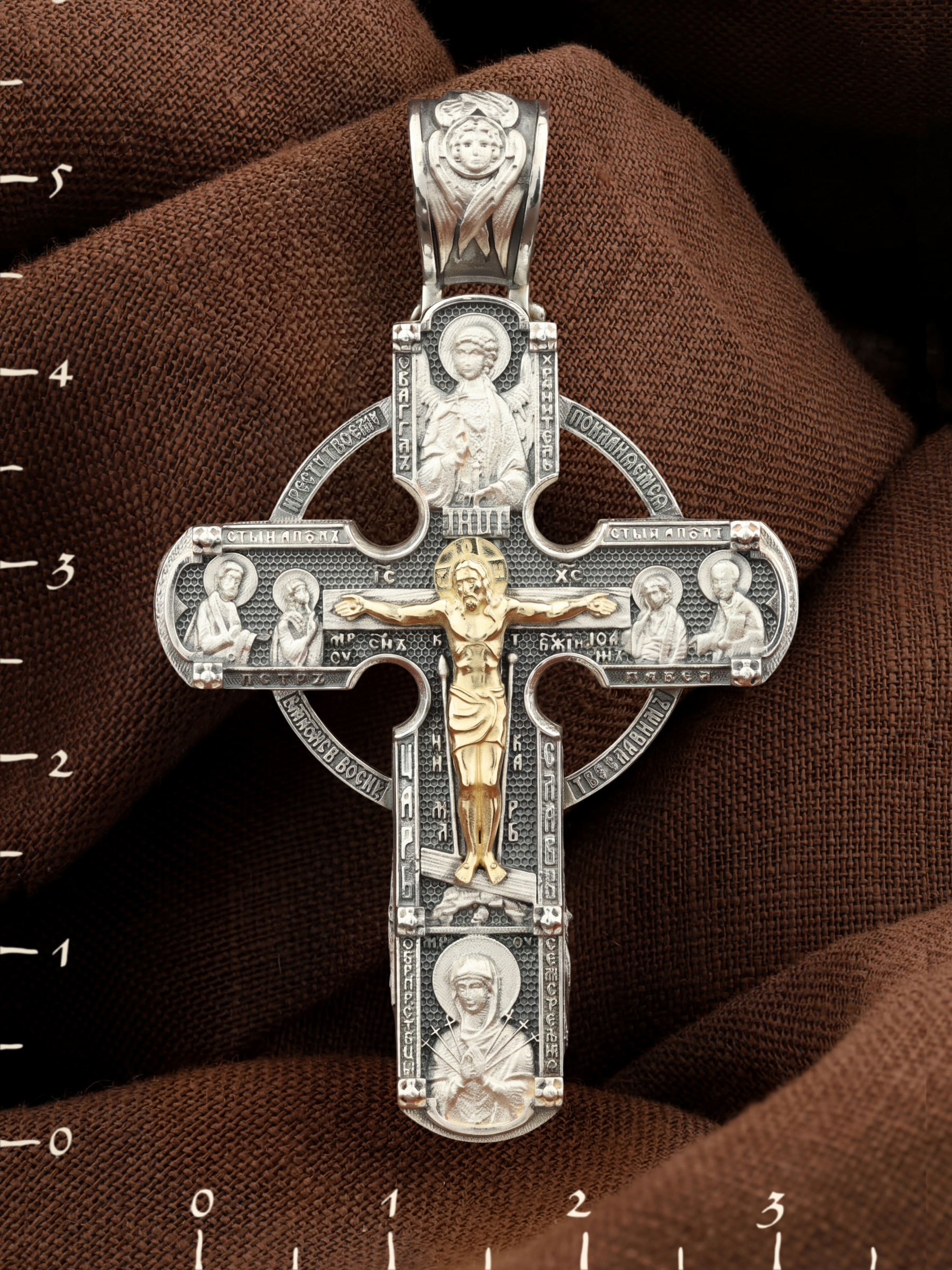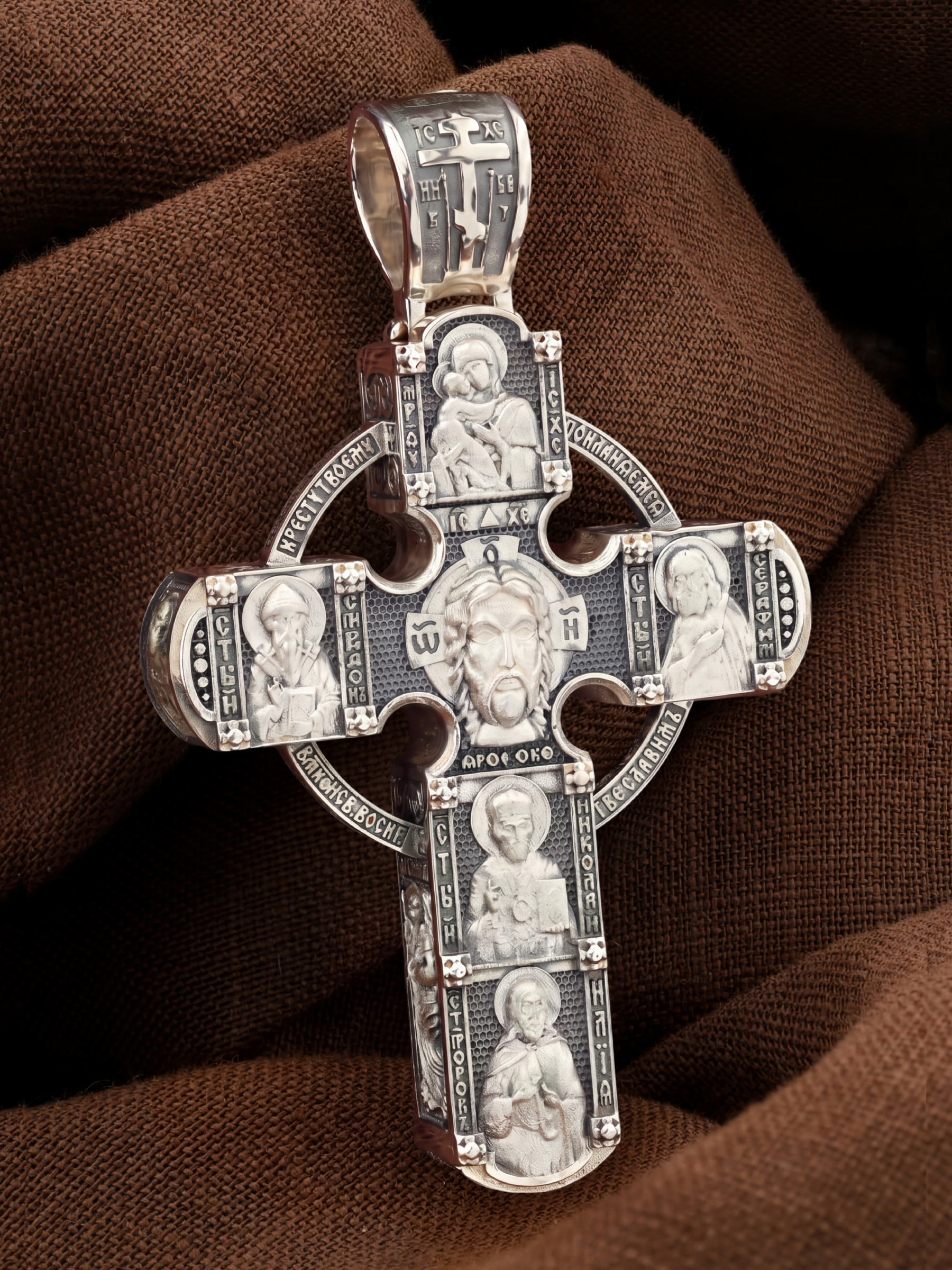 Крест объединяет в одной фигуре два христианских символа — круг-нимб и крест. На лицевой стороне креста изображено Распятие Господа и Спасителя нашего Иисуса Христа. Крест — символ спасения и искупления рода человеческого, знамение победы над смертью и адом. Распятие сопровождается каноническими надписями. На верхней табличке, выше головы Иисуса, расположена надпись, составленная Понтием Пилатом — «IНЦI». Она означает «Иисус Назорей, Царь Иудейский». Надписи «IC» «ХC», что означает Иисус Христос и «Сын Божий» размещается на разных сторонах поперечной перекладины креста. Вдоль Распятия размещены надписи «Царь Славы», «НИКА» (греч. — Победитель) и «МЛРБ» — «место лобное рай бысть» означает место лобное стало раем». Крест стоит на горе камней, символизирующих Голгофу. В ее основании различается череп — это голова Адама. Вдоль креста изображены орудия Страстей Христовых: копие сотника Лонгина, которым пронзили подреберье мёртвого Иисуса, чтобы убедиться в Его смерти, и трость с губкой, с которой Иисуса напоили уксусом. Они обозначены буквами «К» и «Т». Слева от Распятия помещены лики Пречистой Богородицы и Апостола Петра, справа изображены Апостол и евангелист Иоанн Богослов и Апостол Павел. Над Распятием изображен Святой Ангел-Хранитель, ниже — икона Божией Матери «Семистрельная». По кругу размещена молитва: «Кресту Твоему поклоняемся, Владыко, и Святое Воскресение Твое славим». На кулонном кольце помещено изображение Креста «Голгофа», на котором был распят Господь и Спаситель наш Иисус Христос.