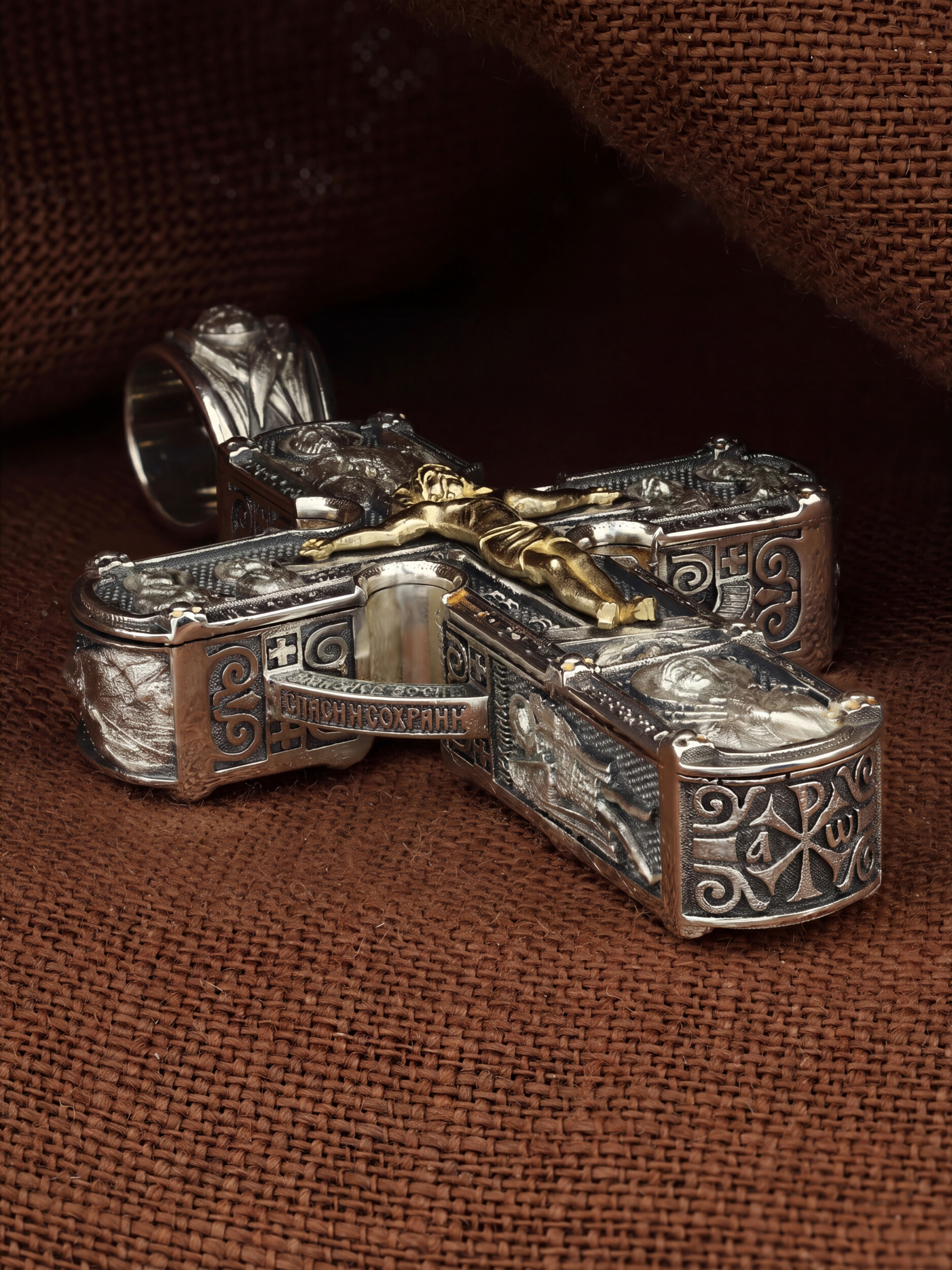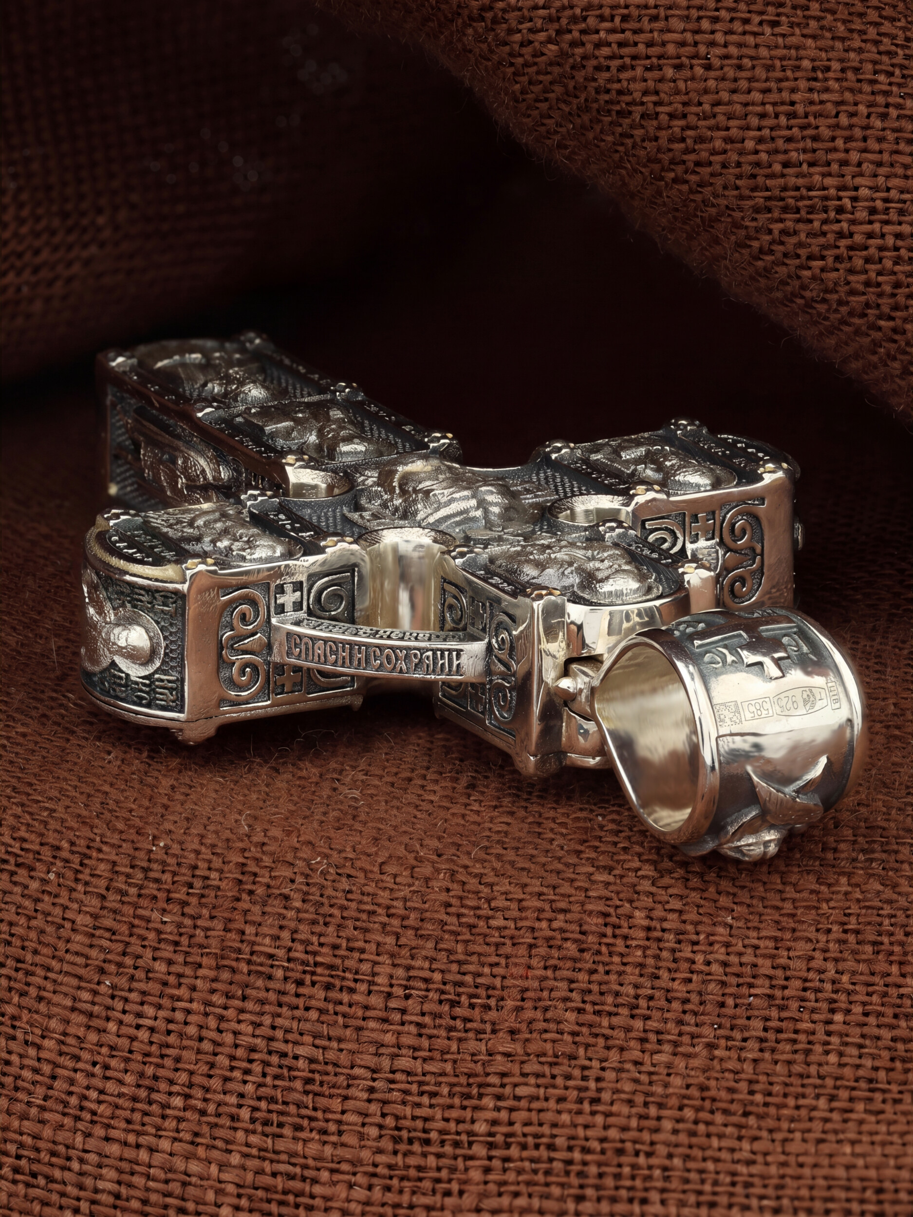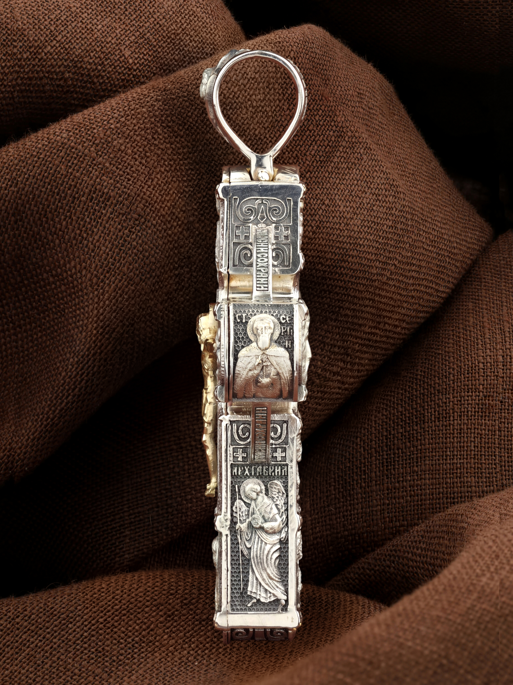 Крест объединяет в одной фигуре два христианских символа — круг-нимб и крест. На лицевой стороне креста изображено Распятие Господа и Спасителя нашего Иисуса Христа. Крест — символ спасения и искупления рода человеческого, знамение победы над смертью и адом. Распятие сопровождается каноническими надписями. На верхней табличке, выше головы Иисуса, расположена надпись, составленная Понтием Пилатом — «IНЦI». Она означает «Иисус Назорей, Царь Иудейский». Надписи «IC» «ХC», что означает Иисус Христос и «Сын Божий» размещается на разных сторонах поперечной перекладины креста. Вдоль Распятия размещены надписи «Царь Славы», «НИКА» (греч. — Победитель) и «МЛРБ» — «место лобное рай бысть» означает место лобное стало раем». Крест стоит на горе камней, символизирующих Голгофу. В ее основании различается череп — это голова Адама. Вдоль креста изображены орудия Страстей Христовых: копие сотника Лонгина, которым пронзили подреберье мёртвого Иисуса, чтобы убедиться в Его смерти, и трость с губкой, с которой Иисуса напоили уксусом. Они обозначены буквами «К» и «Т». Слева от Распятия помещены лики Пречистой Богородицы и Апостола Петра, справа изображены Апостол и евангелист Иоанн Богослов и Апостол Павел. Над Распятием изображен Святой Ангел-Хранитель, ниже — икона Божией Матери «Семистрельная». По кругу размещена молитва: «Кресту Твоему поклоняемся, Владыко, и Святое Воскресение Твое славим». На кулонном кольце помещено изображение Креста «Голгофа», на котором был распят Господь и Спаситель наш Иисус Христос.