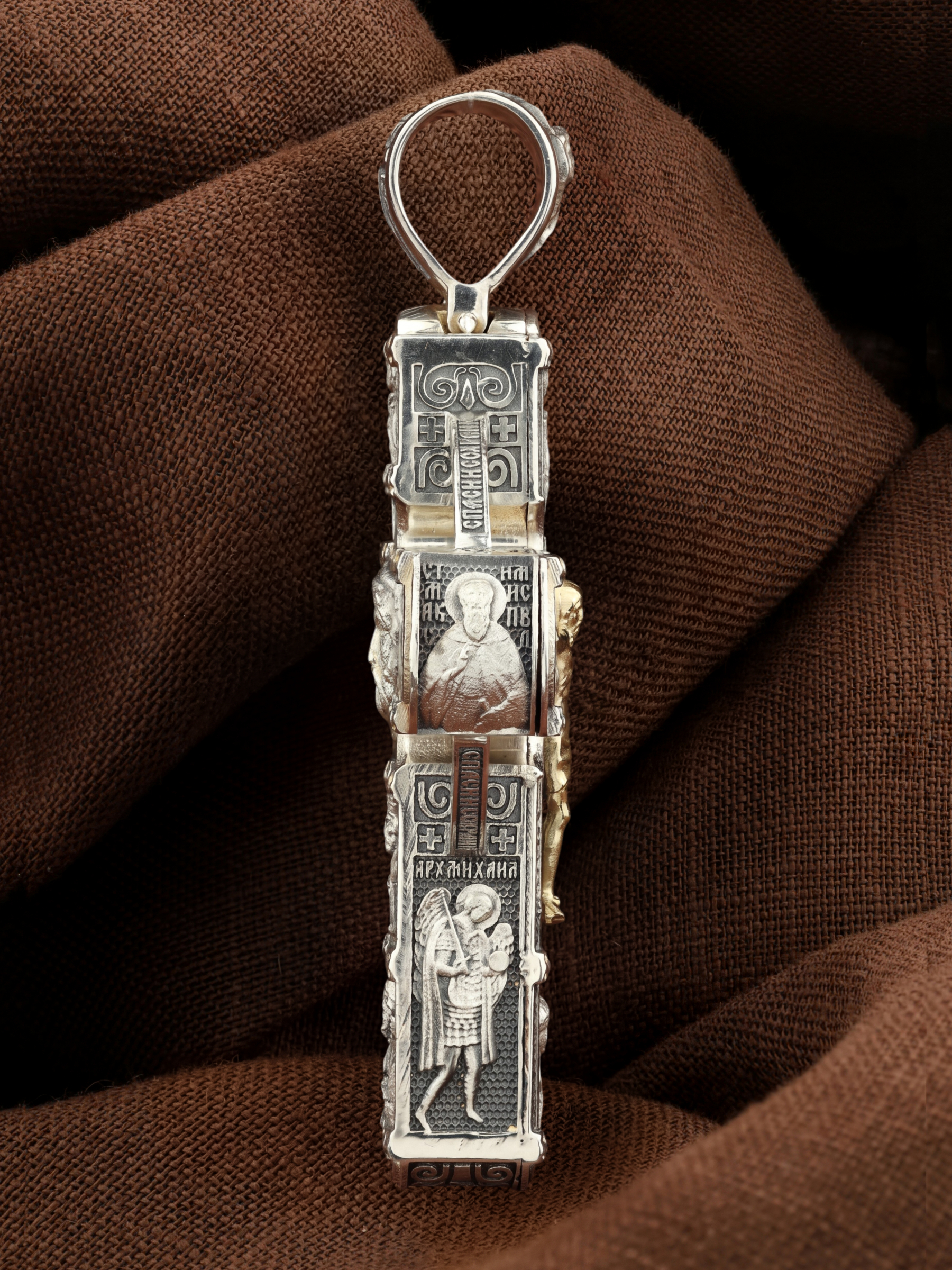 В центре оборотной стороны креста размещен образ Господа и Спасителя нашего Иисуса Христа — Господь Вседержитель или Пантократор (от греч. всевластный, всесильный). Именование Иисуса «Вседержителем» указывает, с одной стороны, на Его Божественную природу: «Аз есмь Альфа и Омега, начало и конец, говорит Господь, Который есть и был и грядет, Вседержитель» (Откр. 1: 8). С другой стороны, такое именование связано и с человеческой природой Христа, искупившего крестной жертвой людские грехи и обновившего тем самым человеческую природу. Над образом изображена икона Божией Матери «Владимирская», ниже — образы святителя Николая Чудотвореца, архиепископа Мир Ликийских и пророка Ильи. Слева изображен святитель Спиридон Тримифунтский, справа — преподобный Серафим Саровский. На кулонном кольце размещен образ шестикрылого Серафима.