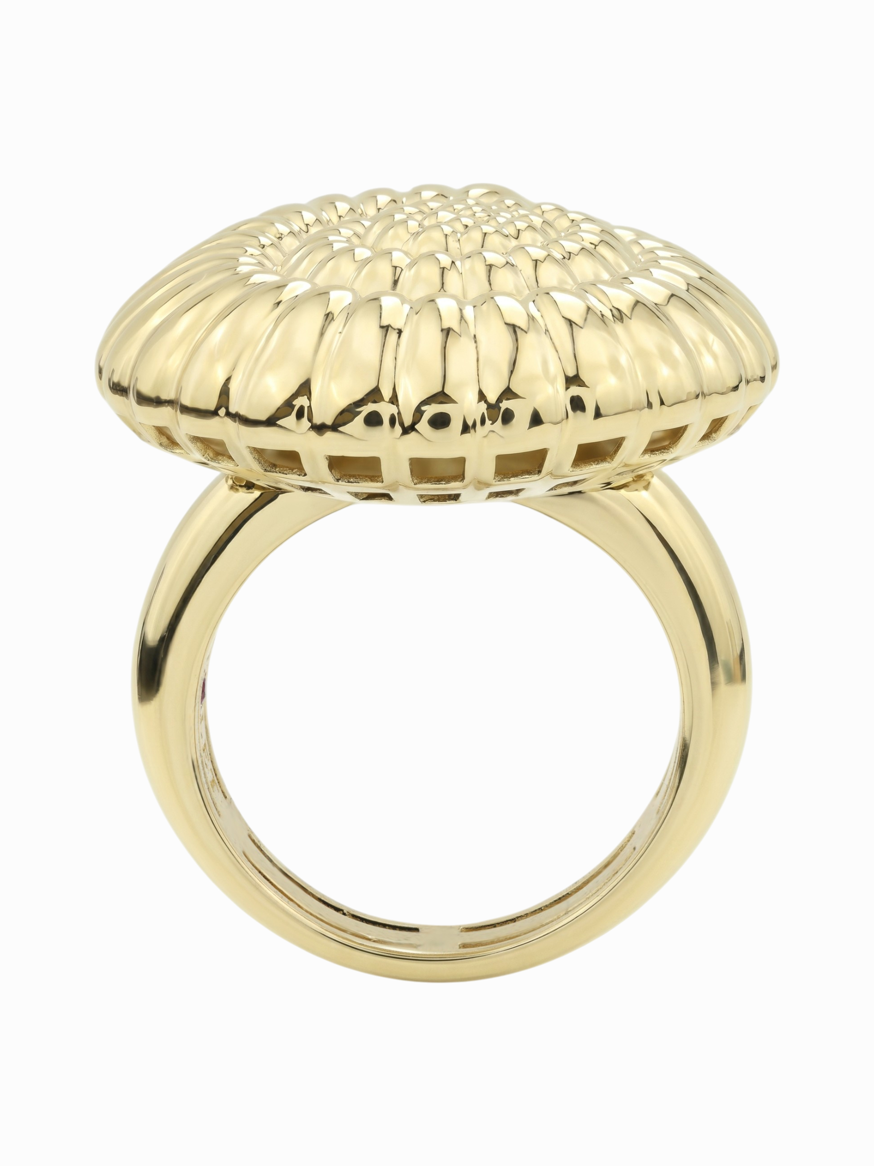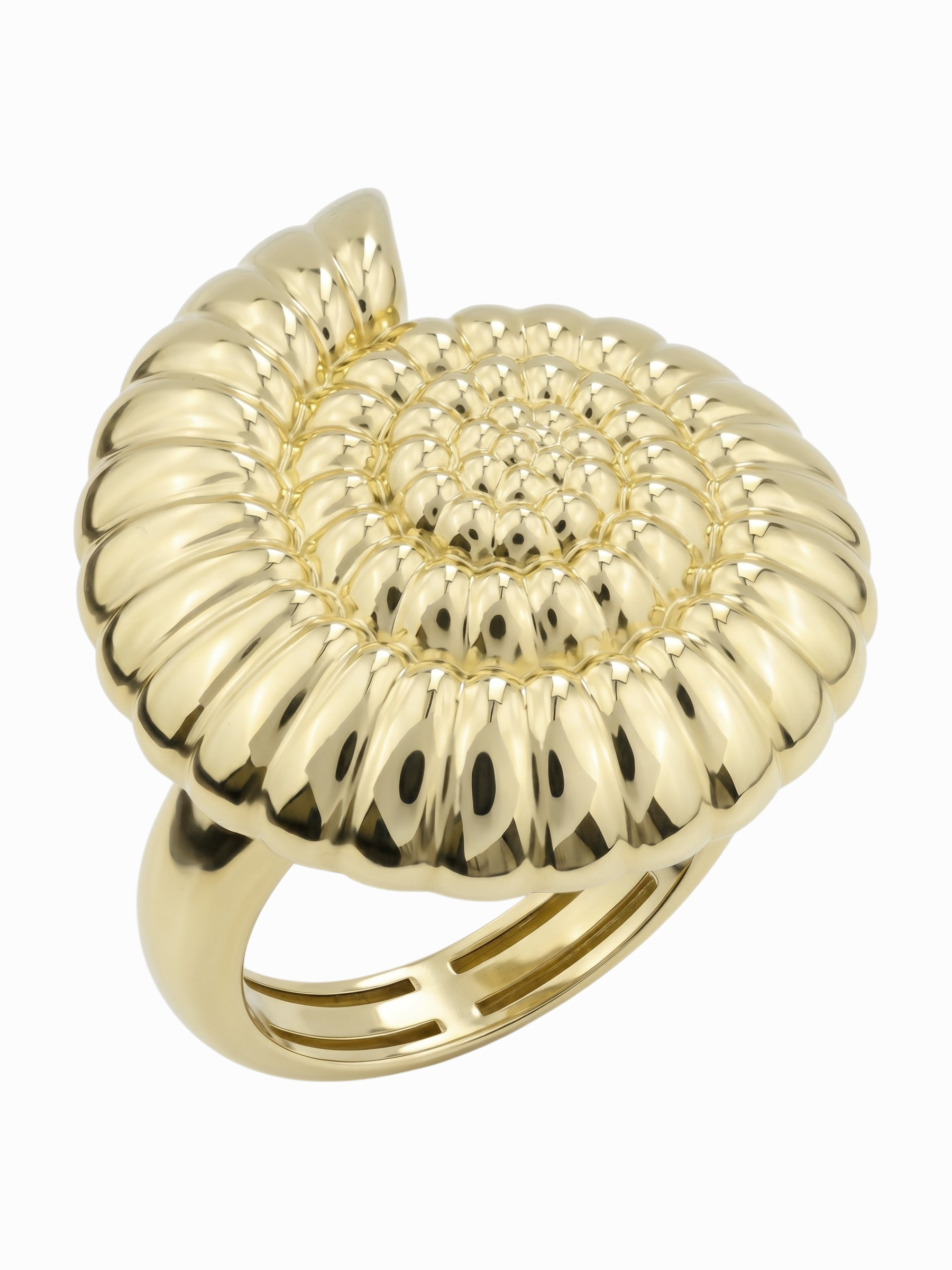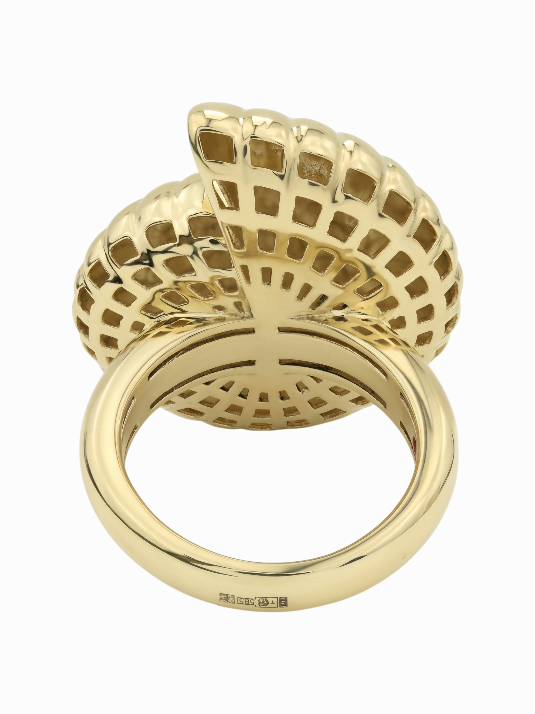 Кольцо из лимонного золота с рубином из коллекции Vioretty — Oceano — это ювелирный шедевр, вдохновленный совершенством природных форм. Дизайн украшения, напоминающий морскую раковину, притягивает взгляд своей плавностью и художественной выразительностью. Глянцевая поверхность лимонного золота 585 пробы эффектно играет светом, создавая объемный и динамичный образ. Центральным акцентом композиции выступает рубин насыщенного красного цвета, ограненный в форме идеального круга, который вносит ноту роскоши и благородства в общую эстетику изделия.
