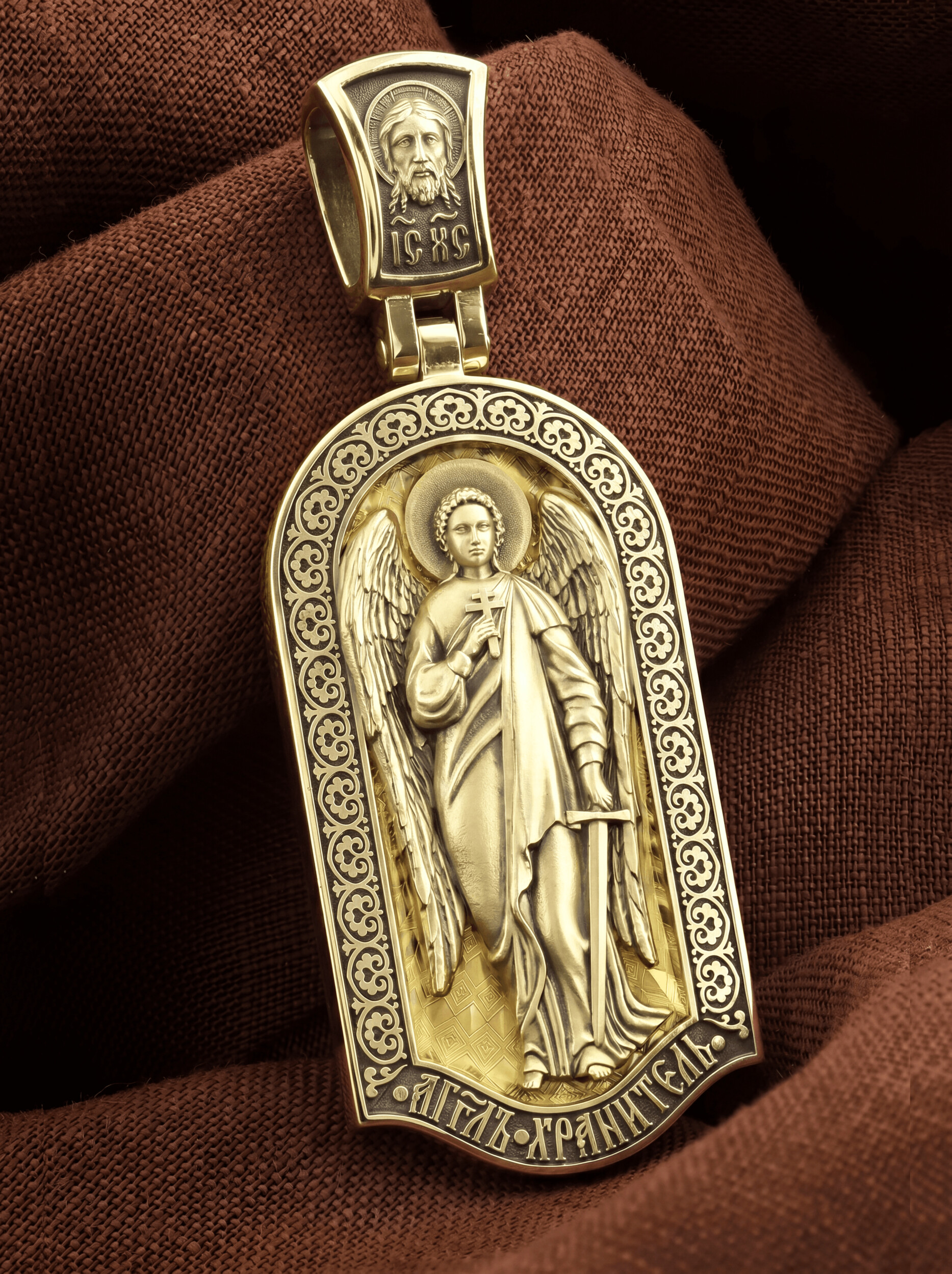Основой композиции лицевой стороны является Ангела Хранителя. Образок Ангел Хранитель — это не просто украшение, а настоящая миниатюрная икона. В руках Ангел держит традиционные символические атрибуты Ангелов Хранителей: крест — знак послушания Христу и следования Его заповедям, меч — символ непримиримой борьбы, которую он ведет с бесами, отражая их нападения на людей. Слово «ангел» означает «вестник». Ангелы — верные служители Божьи, которых Господь посылает возвещать Свои повеления. Ангелы тварны, как и люди, но имеют другую природу. На иконах они изображаются в человеческом обличье с большими крыльями. Могучие крылья ангелов символизируют быстроту, с которой они исполняют повеления Бога, а небольшие ленточки у ушей –тороки, или слухи — показывают, что они всегда слышат Его голос.
