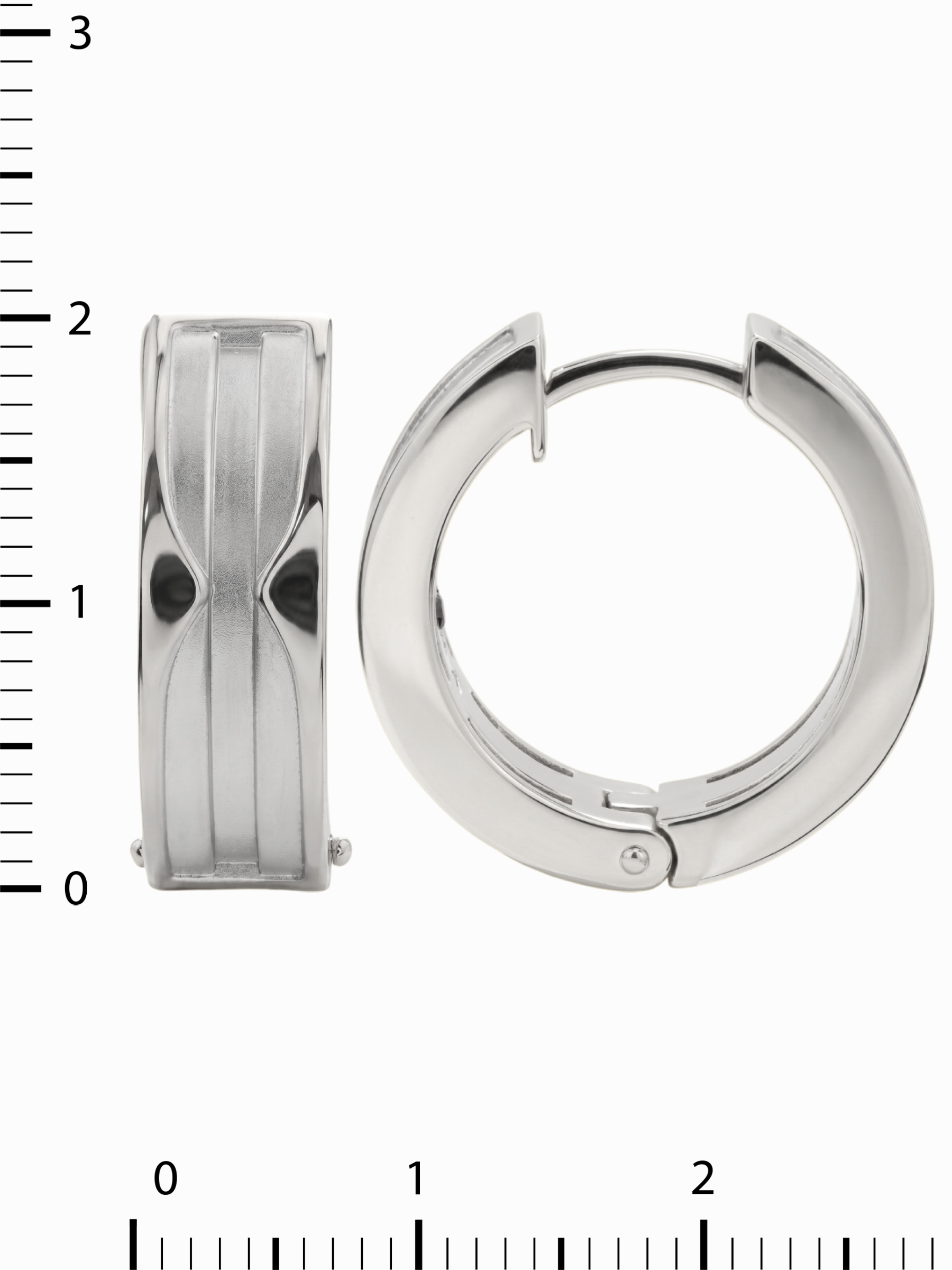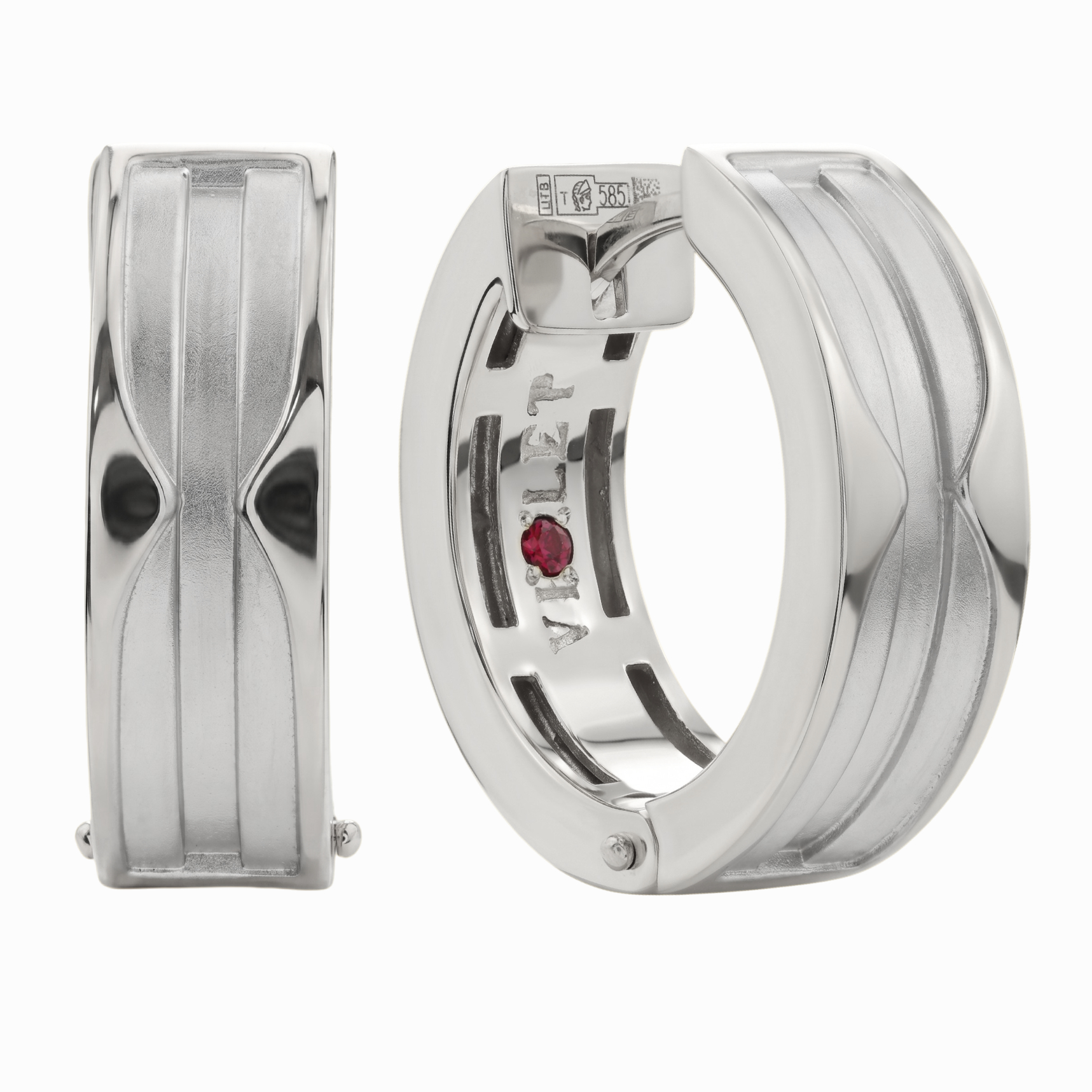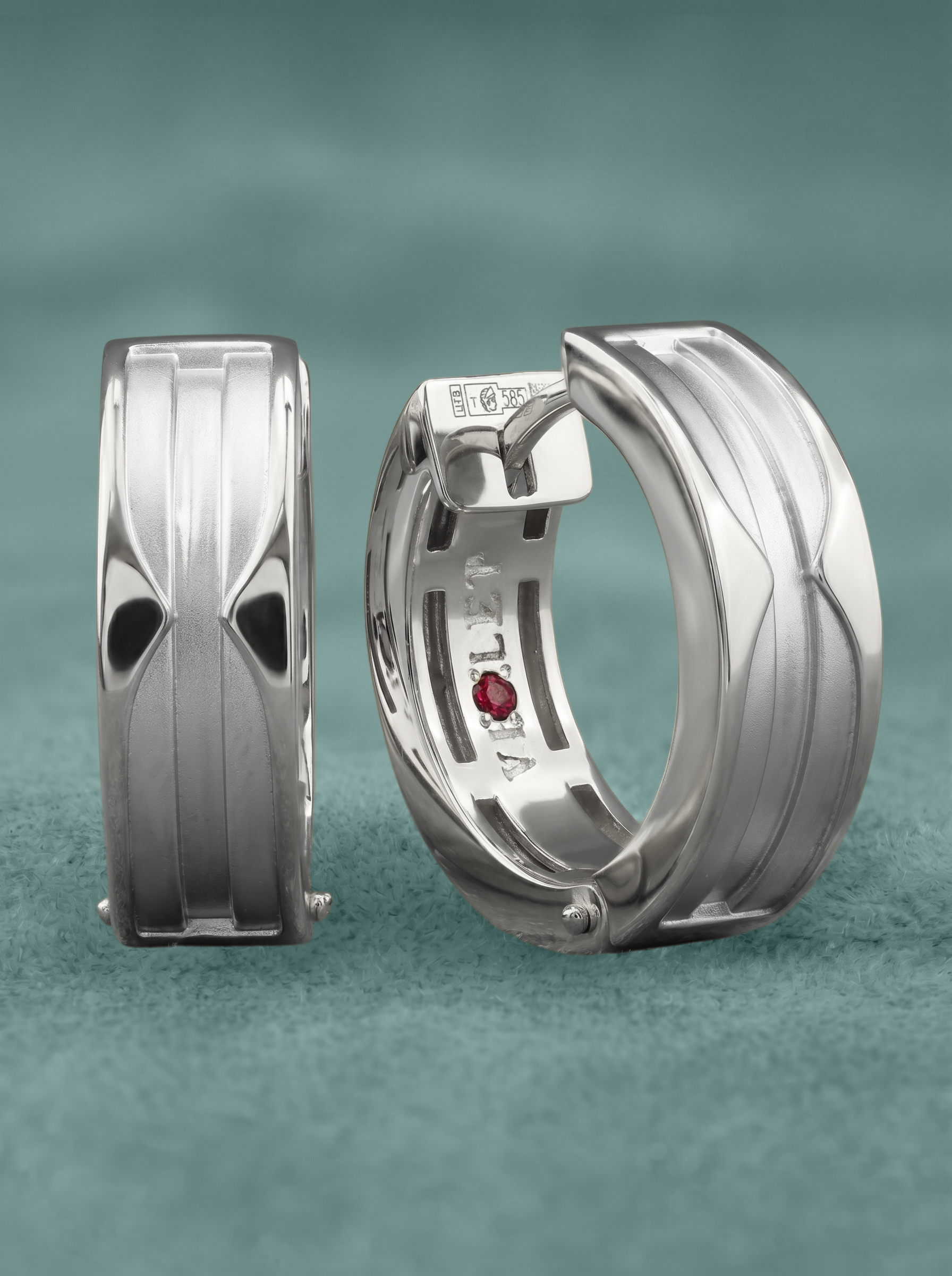 Особую выразительность модели придает вставка: два рубина круглой формы насыщенного красного цвета. Эти драгоценные камни, скрытые внутри конструкции, добавляют украшению глубины и загадочности, создавая эффектный контраст с холодным сиянием белого золота. Тщательно проработанная фактура поверхности подчеркивает статус изделия и его высокое качество исполнения.