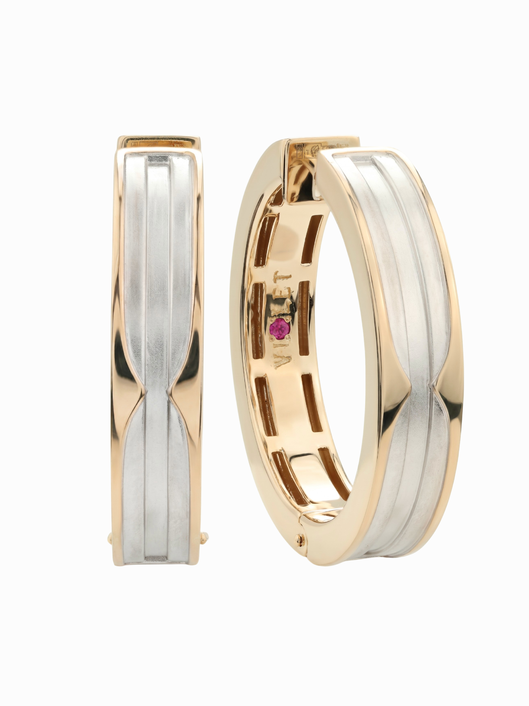 Центральным акцентом дизайна выступает искусно скрытый элемент декора — красная вставка из натурального рубина. В изделии использовано 2 вставки круглой формы, которые гармонично дополняют общую композицию. Красное золото высокого качества обеспечивает долговечность и безупречный блеск аксессуара, а продуманная геометрия формы подчеркивает статус владельца. Серьги прекрасно смотрятся как самостоятельное украшение, так и в составе готовых комплектов, позволяя создавать завершенные ювелирные ансамбли для особых случаев или повседневного ношения.