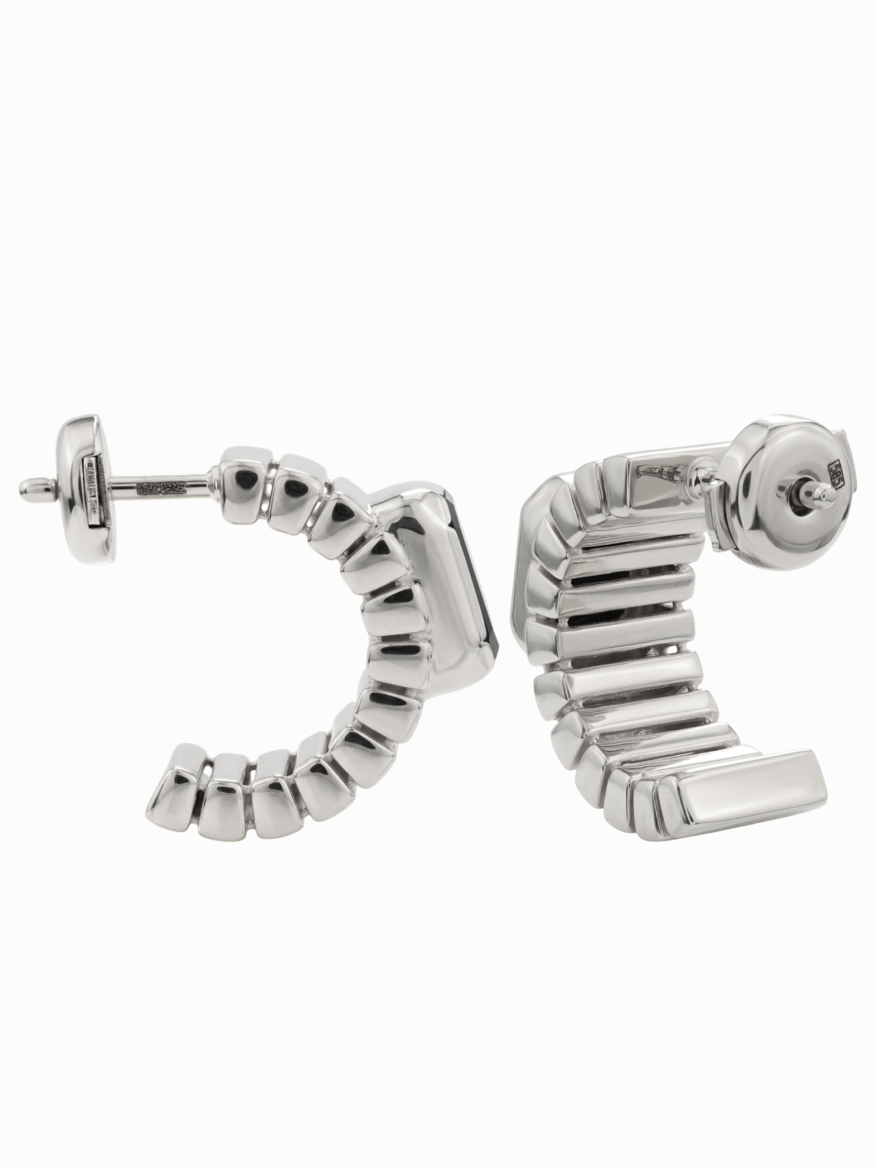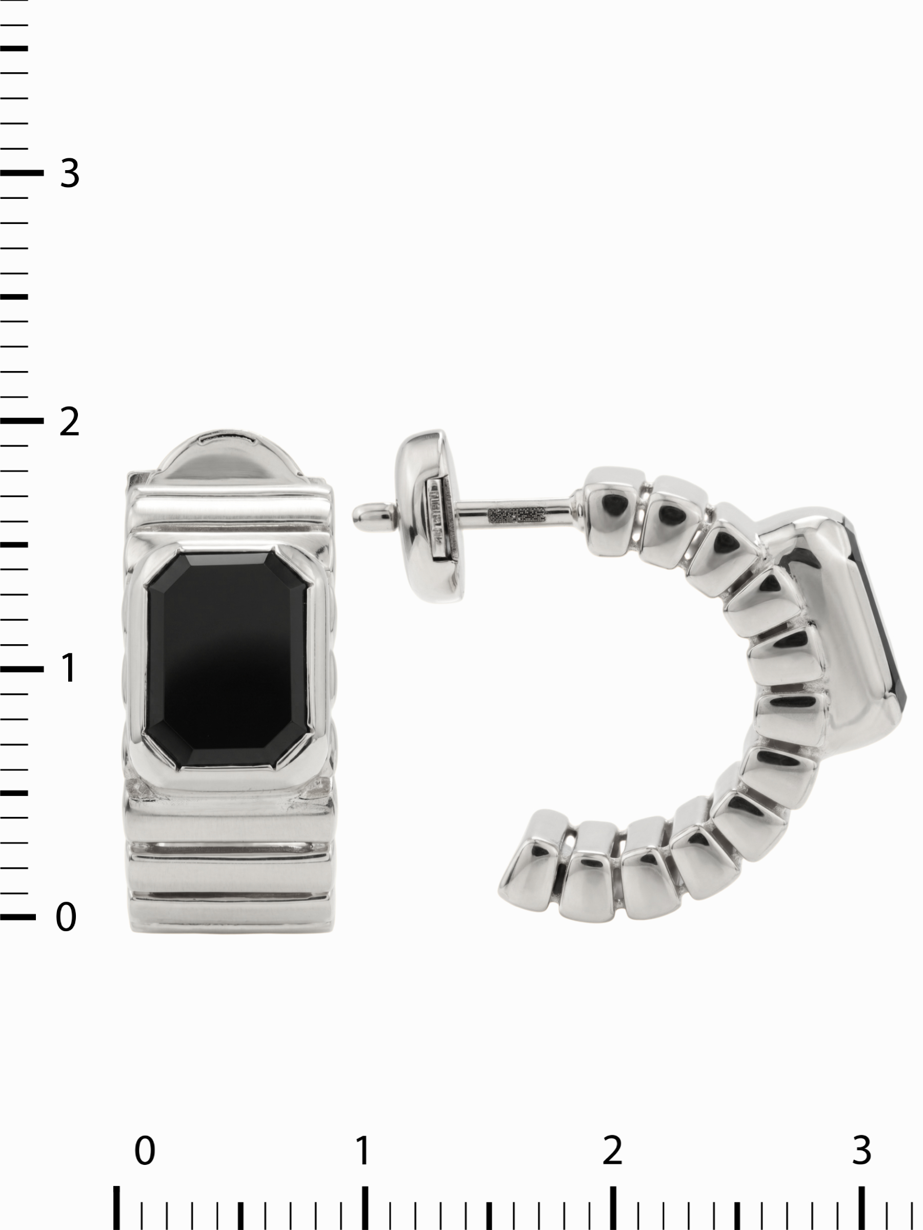 Центральным элементом композиции являются два черных оникса, ограненных в форме октагона. Глубокий, насыщенный цвет вставок эффектно контрастирует с холодным блеском белого золота, создавая стильный и современный визуальный эффект. Качественное исполнение и продуманные линии придают серьгам выразительный характер, позволяя им гармонично вписываться как в деловой дресс-код, так и в вечерние аутфиты.
