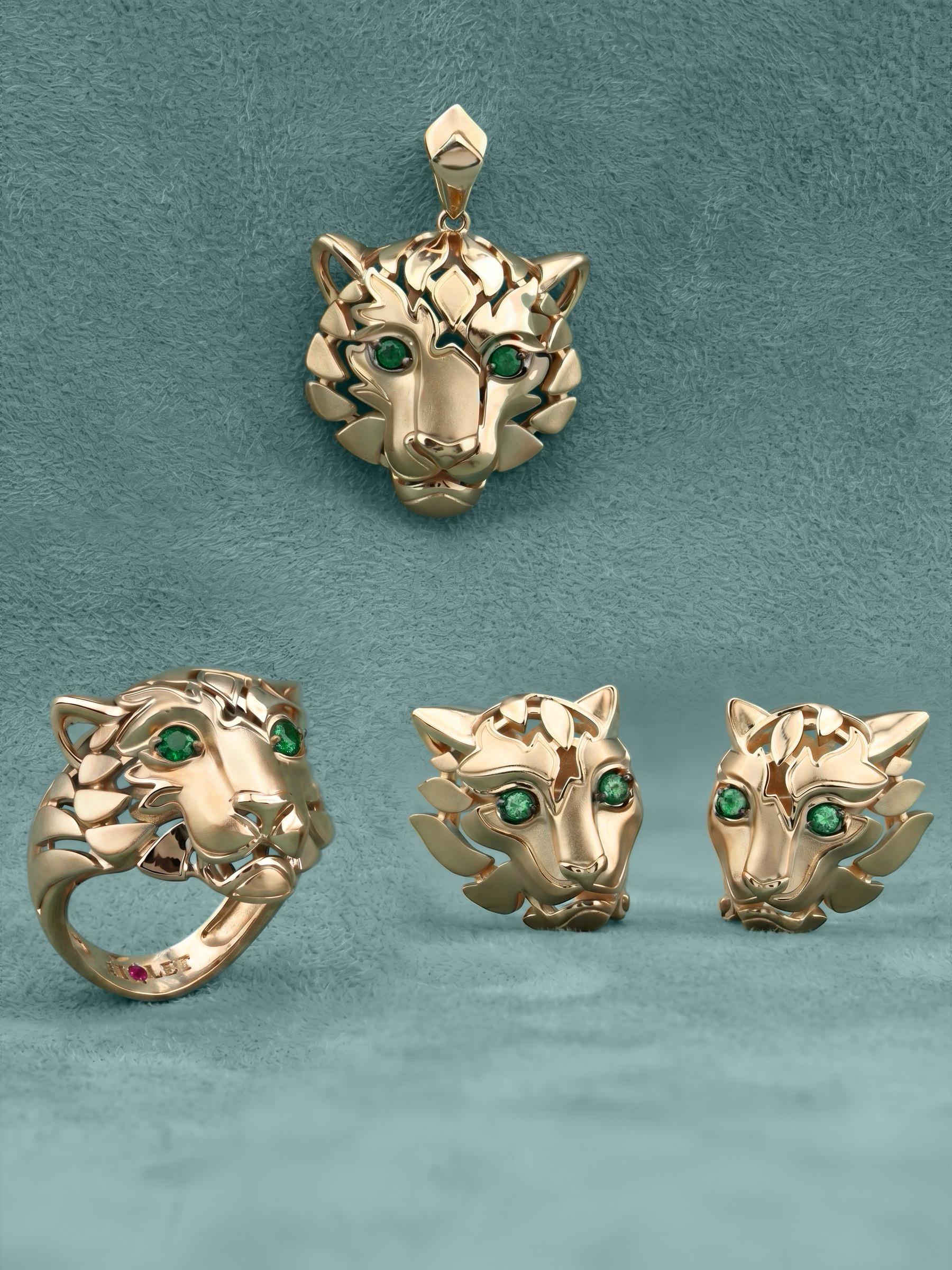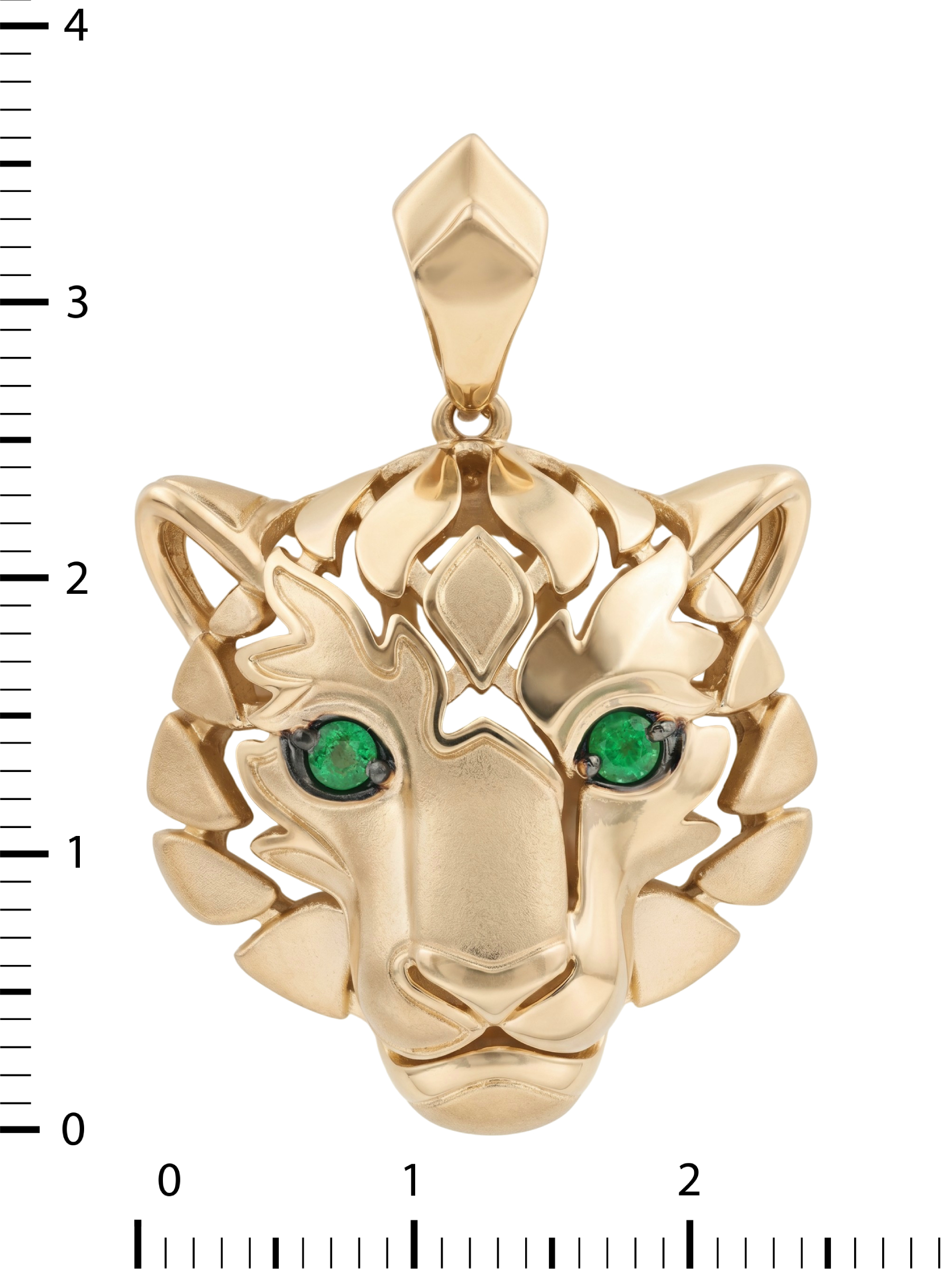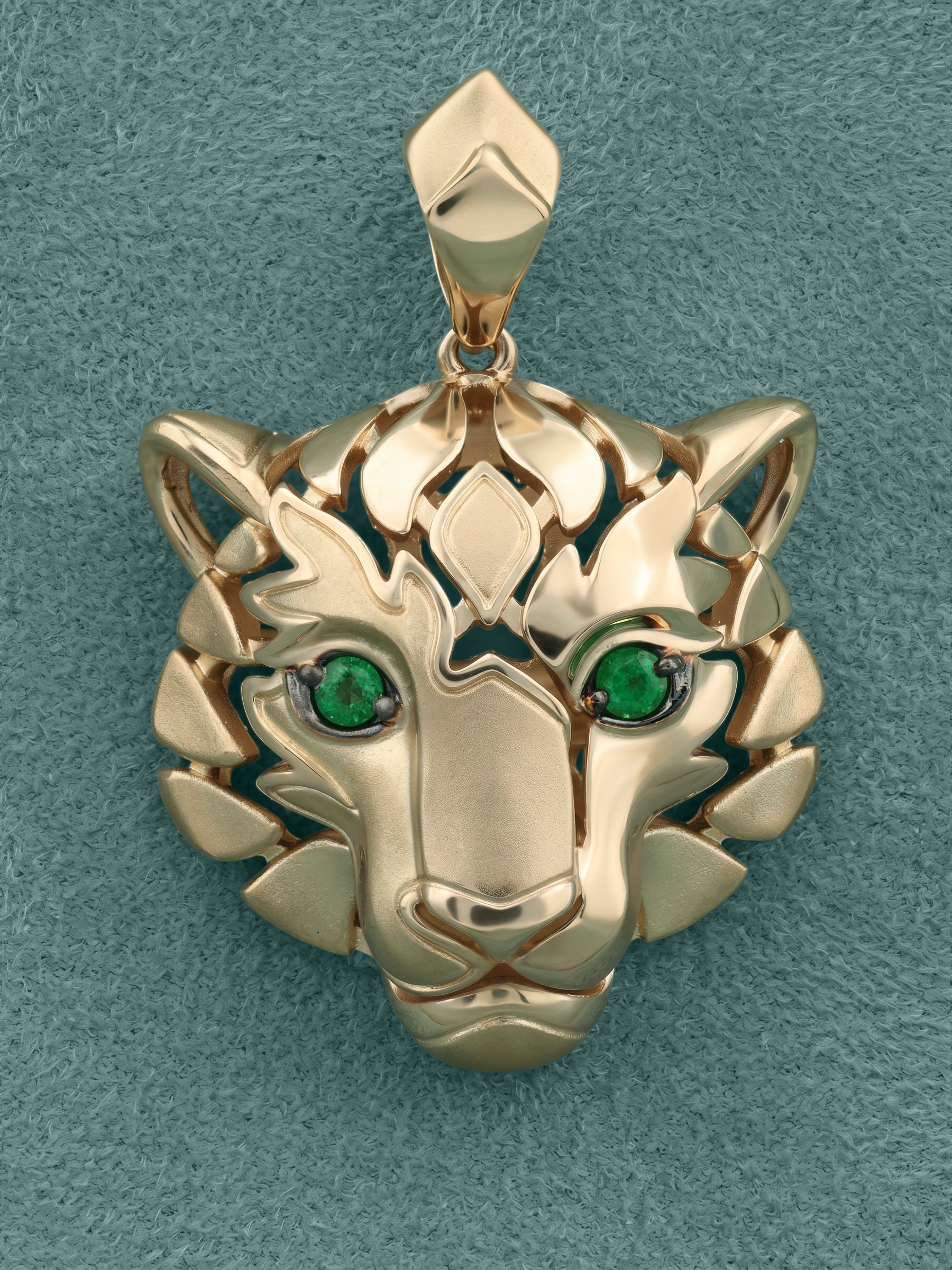 Взгляд хищника притягивает внимание благодаря двум глубоким изумрудам зеленого цвета круглой формы. Контраст между насыщенным цветом камней и сиянием красного металла делает этот аксессуар по-настоящему притягательным. Эта подвеска гармонично дополнит как повседневный, так и вечерний стиль, подчеркивая индивидуальность владельца.