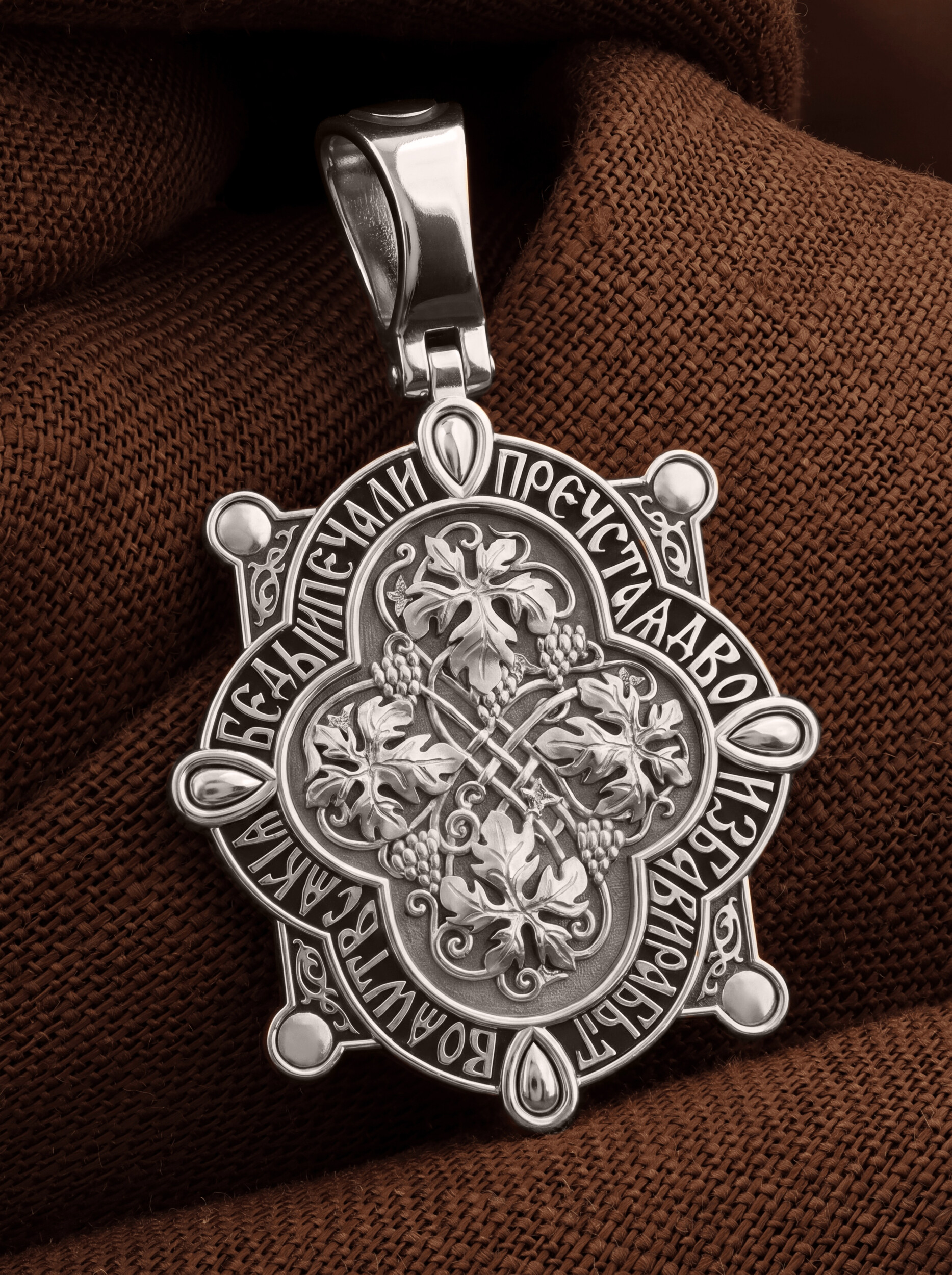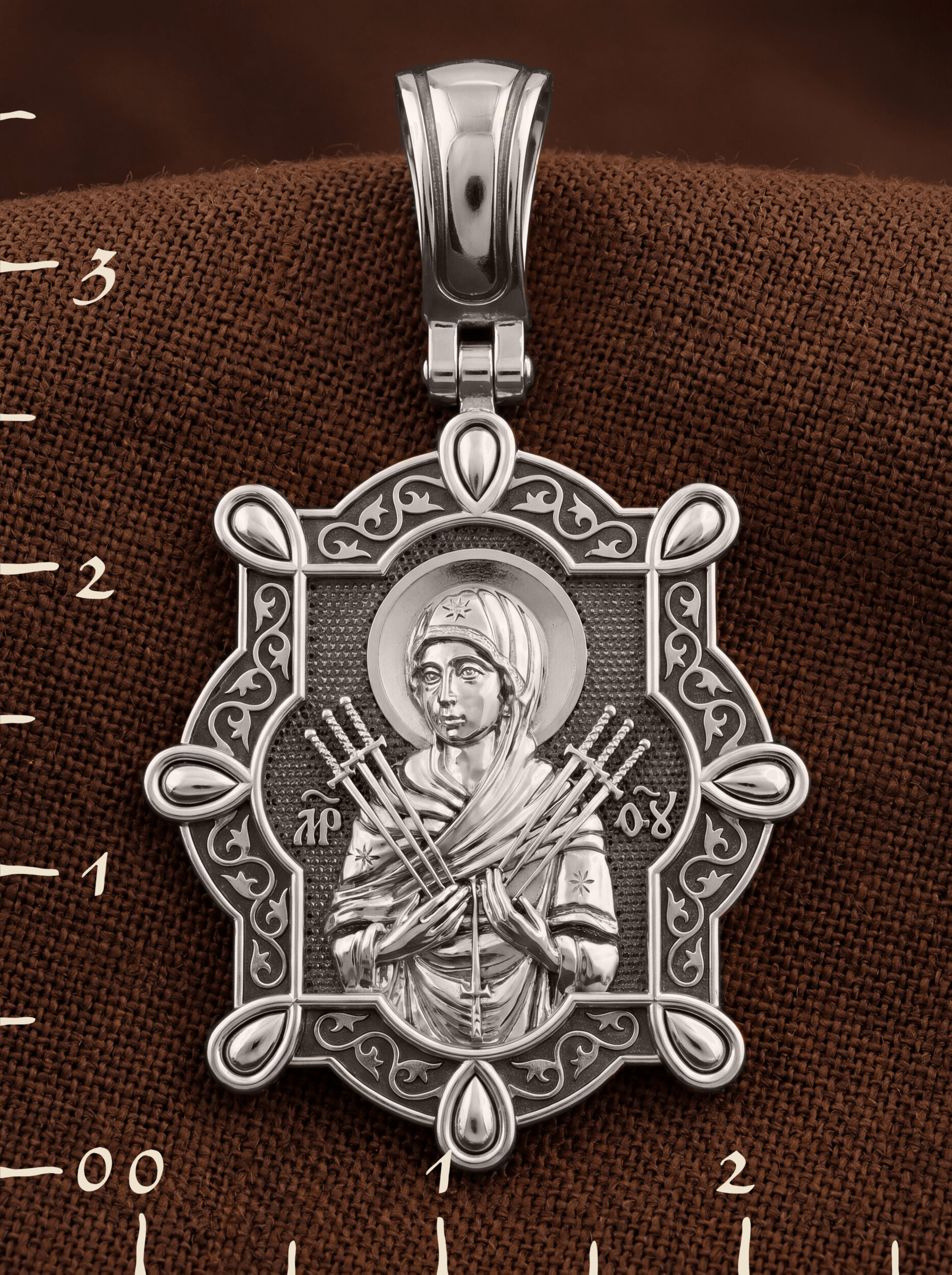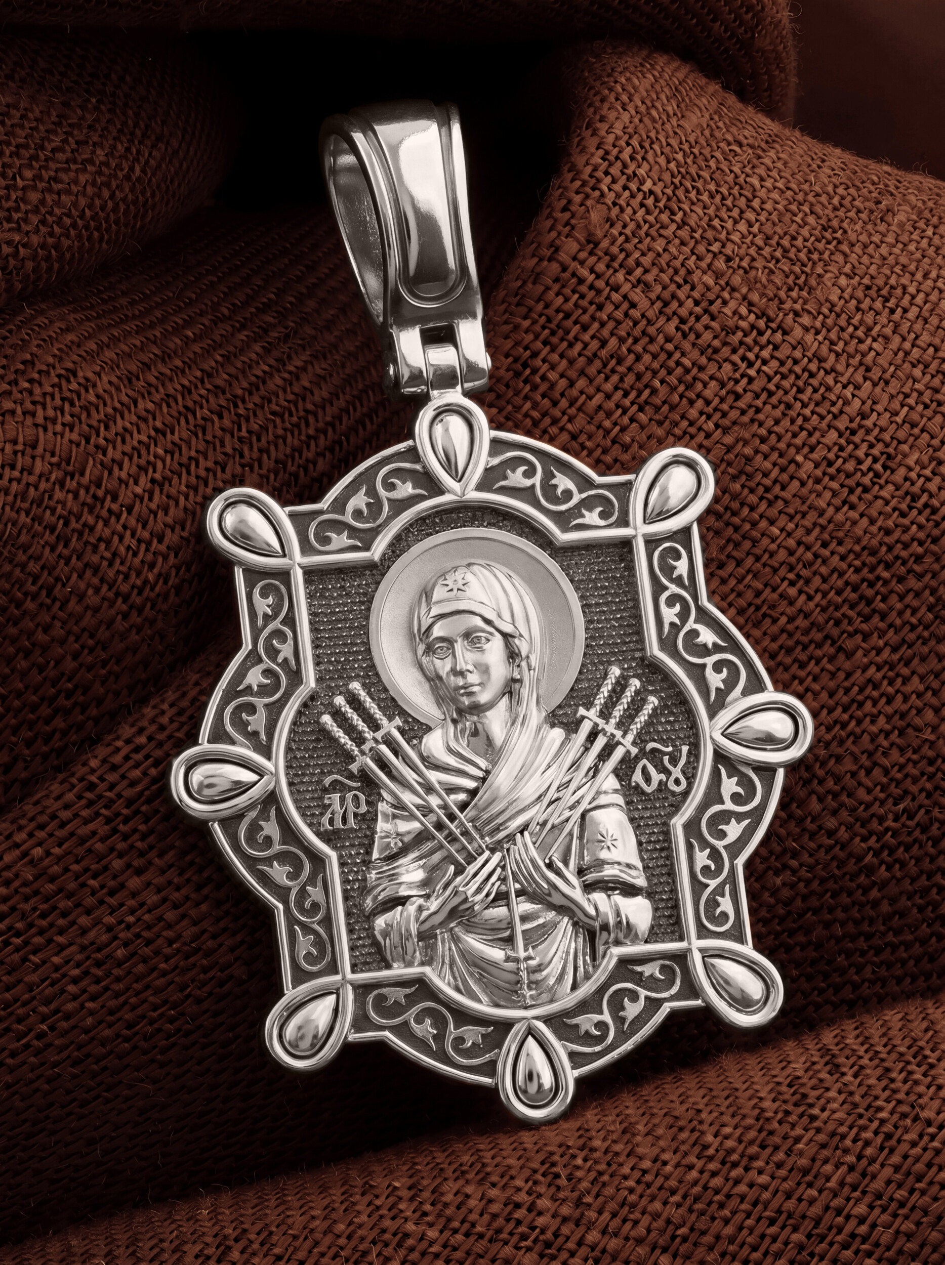 На лицевой стороне образка изображена икона Пресвятой Богородицы «Семистрельная» — одна из самых чудотворных икон на Руси. На протяжении многих веков христиане взывали к Царице Небесной через эту икону, если в стране начинались войны или мятежи.